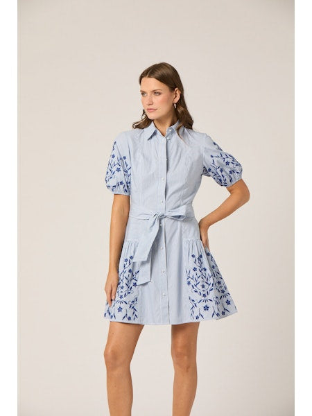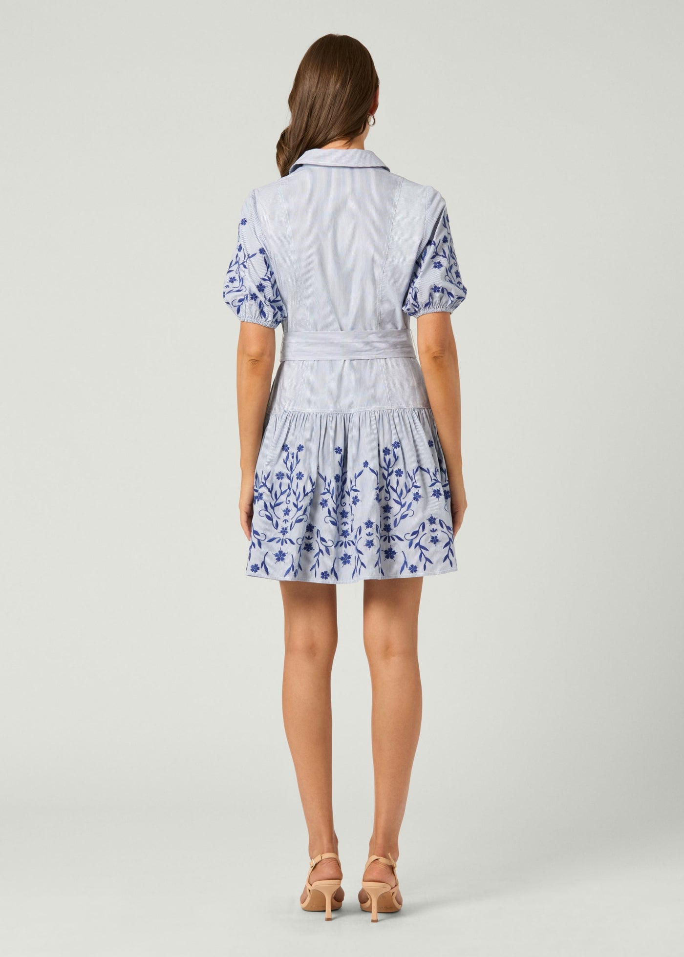 The Shoshanna Danika Dress in Light Blue/Ivory/Navy combines playful charm with sophisticated details. This embroidered pinstripe cotton mini shirtdress features a classic shirt collar and a front button-down placket with elegant white pearl buttons. Short balloon sleeves with elastic cuffs and a fitted bodice with back smocking ensure a comfortable, flattering fit. A separate waist tie belt enhances your silhouette, while shirring at the hips and side seam pockets add both style and practicality. Unlined for breathability, the contrasting floral embroidery on sleeves and skirt sides makes this dress a standout choice for any occasion.