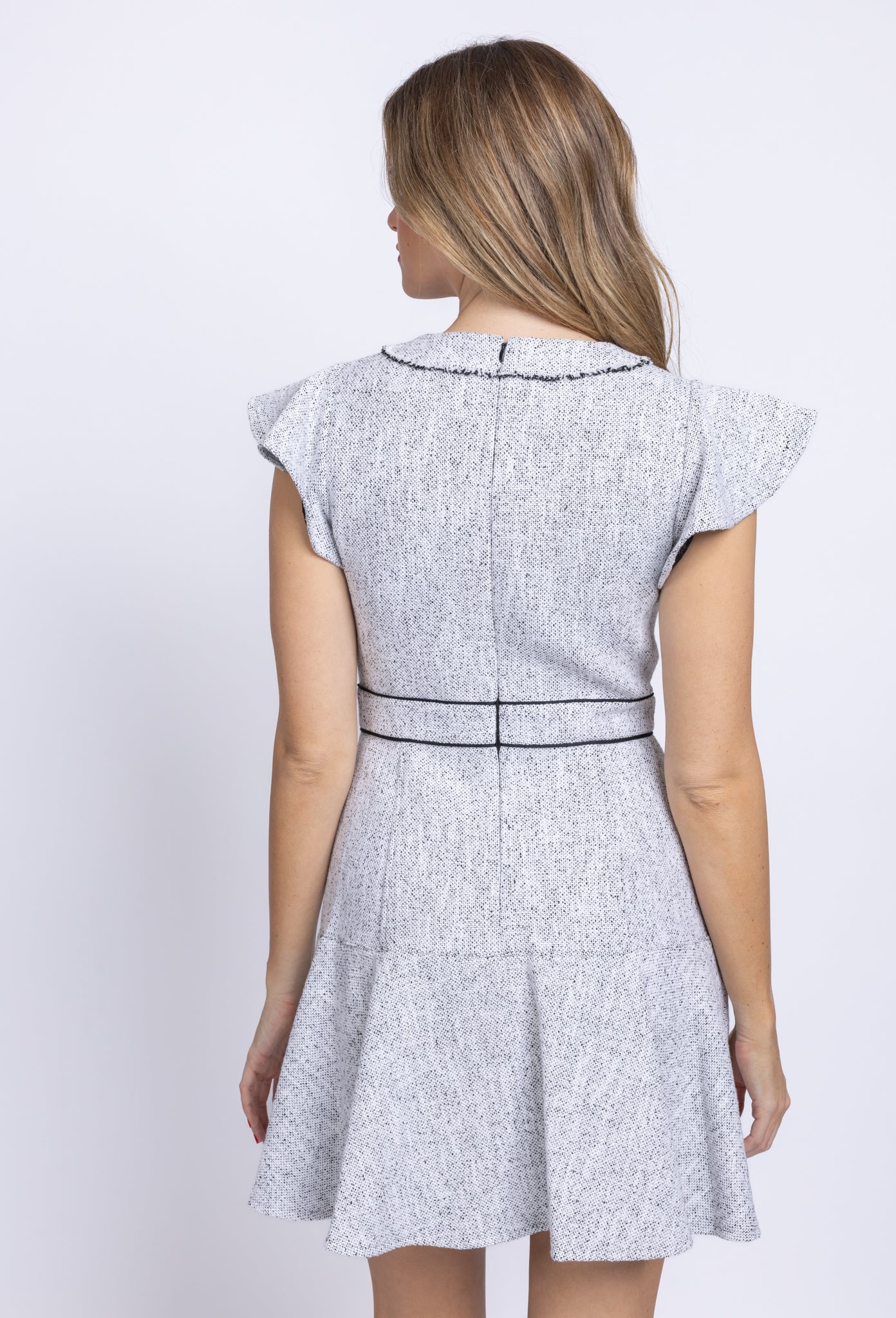 Classic lightweight tweed dress with contrasting piping and flared sleeves. This mini dress features a button front placket with black buttons and frayed details, waistband with piping trim, and a fit and flare skirt. Fully lined. Hidden back zipper.