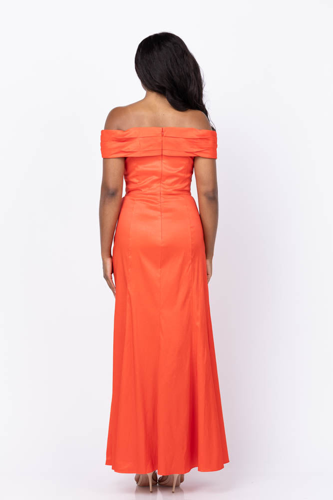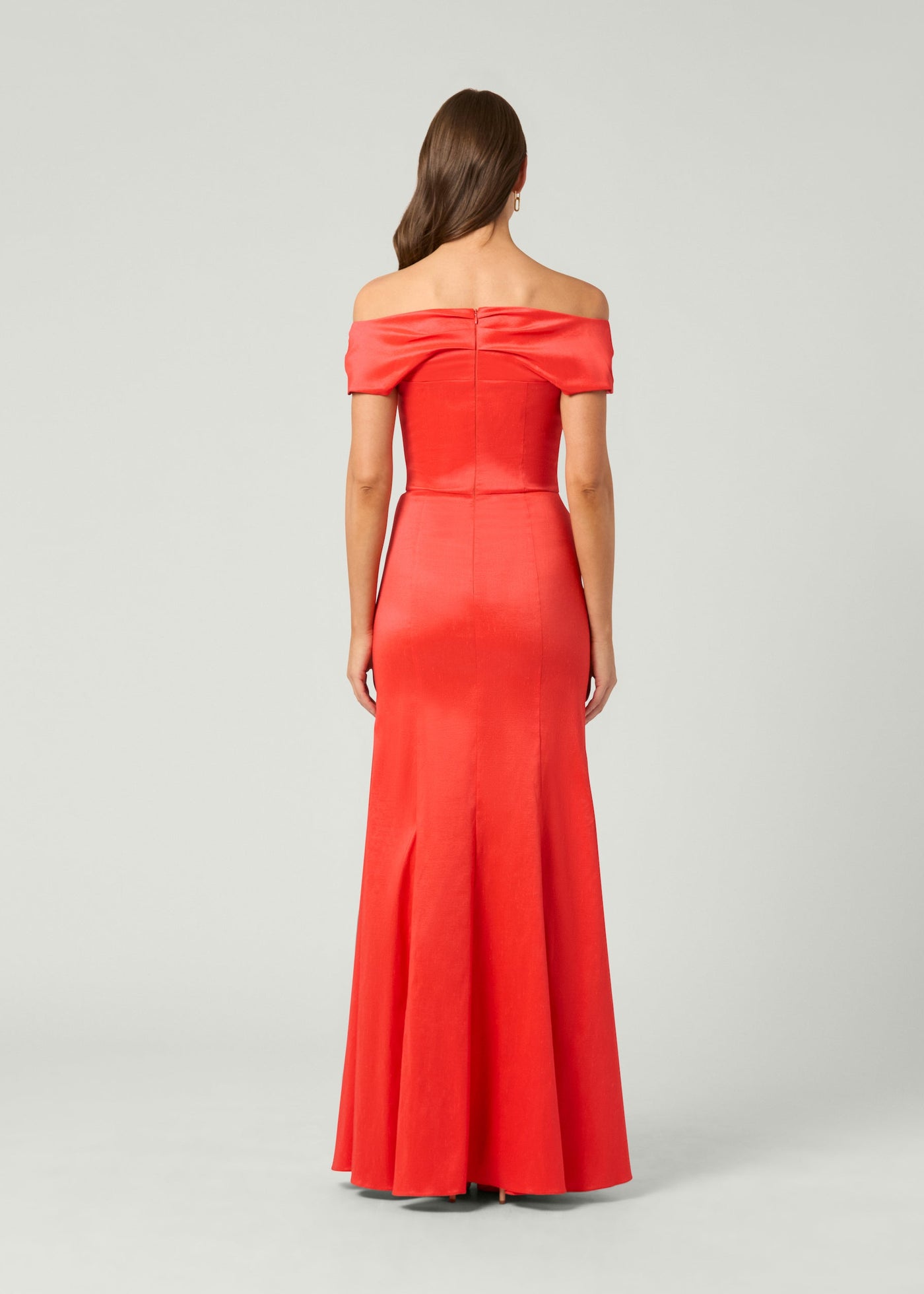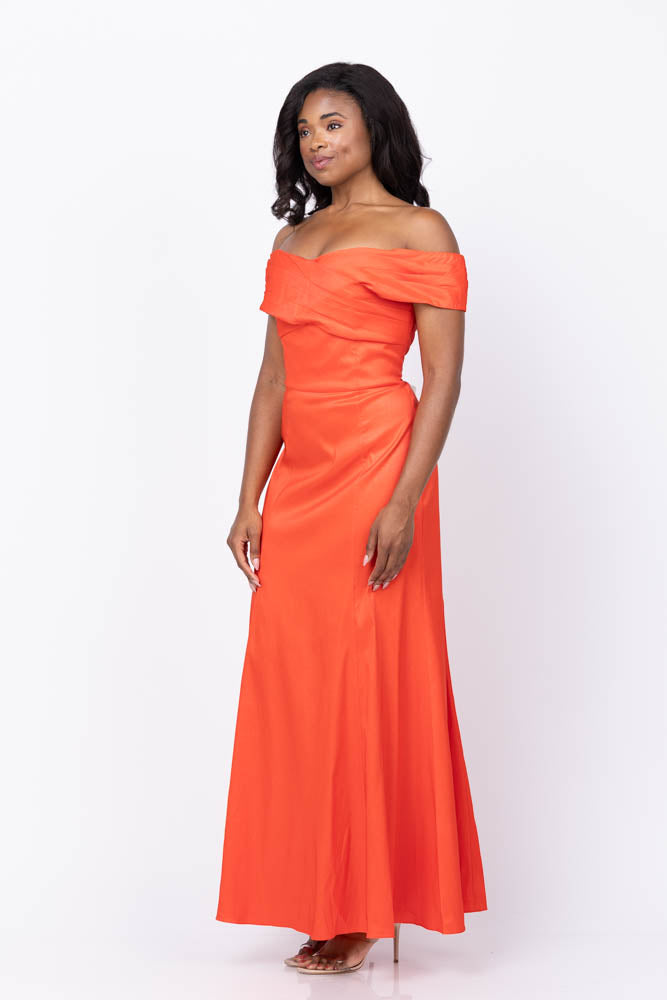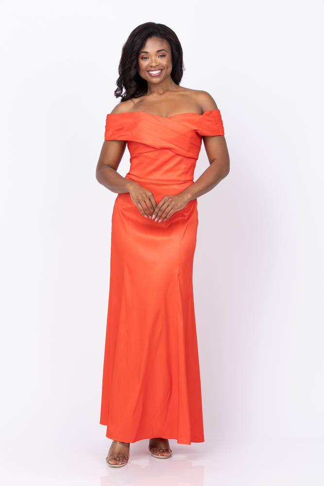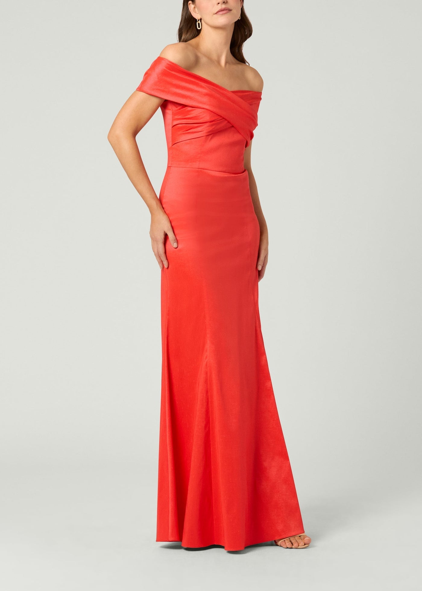 Make a striking entrance in the Shoshanna Etta Dress in Cherry. Crafted from stretch taffeta, this gown features an elegant off-shoulder bodice with a beautifully draped front that enhances your neckline. Its form-fitted silhouette gently flares at the skirt’s hem, creating a graceful movement. Inside, a full bustier offers structured support, while the fully lined design ensures comfort. A hidden back zipper completes the sleek look, making this dress perfect for unforgettable occasions.
