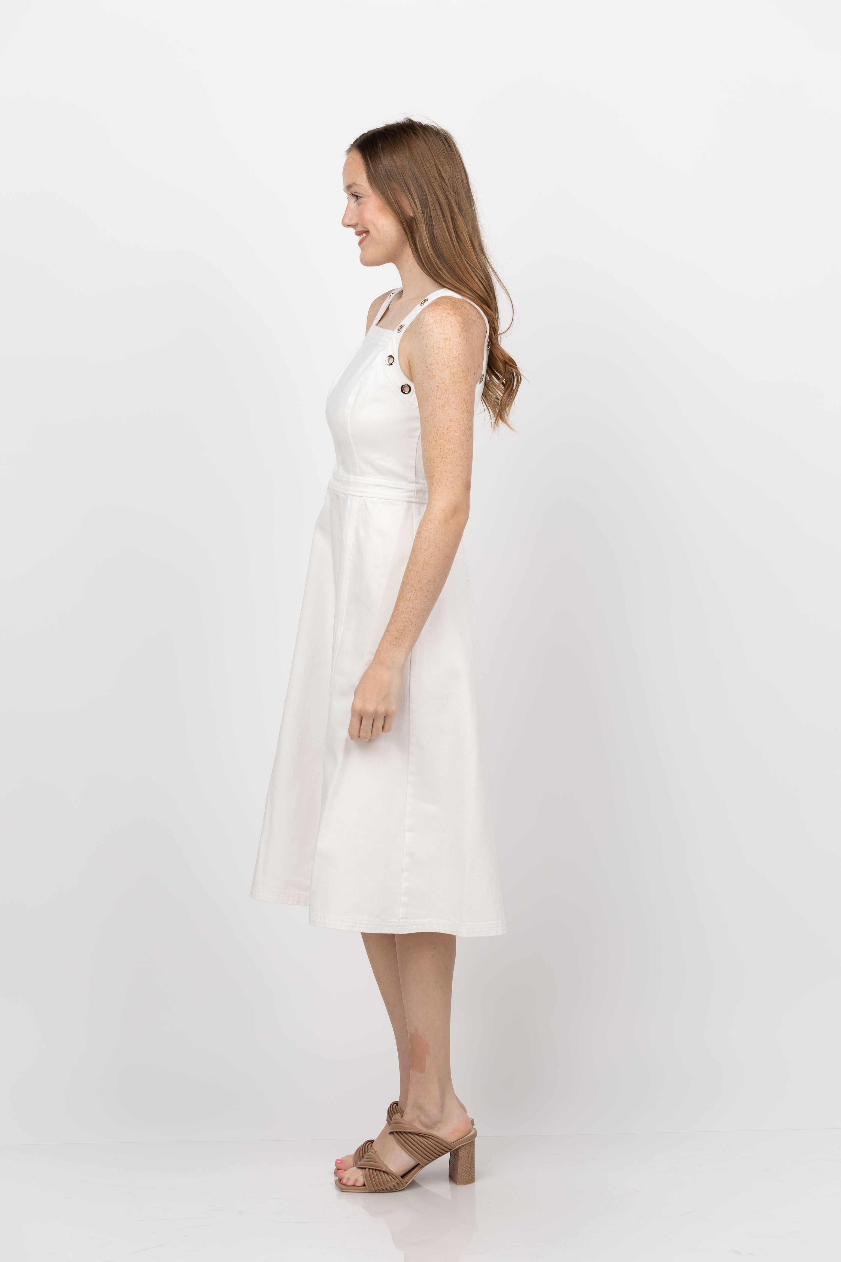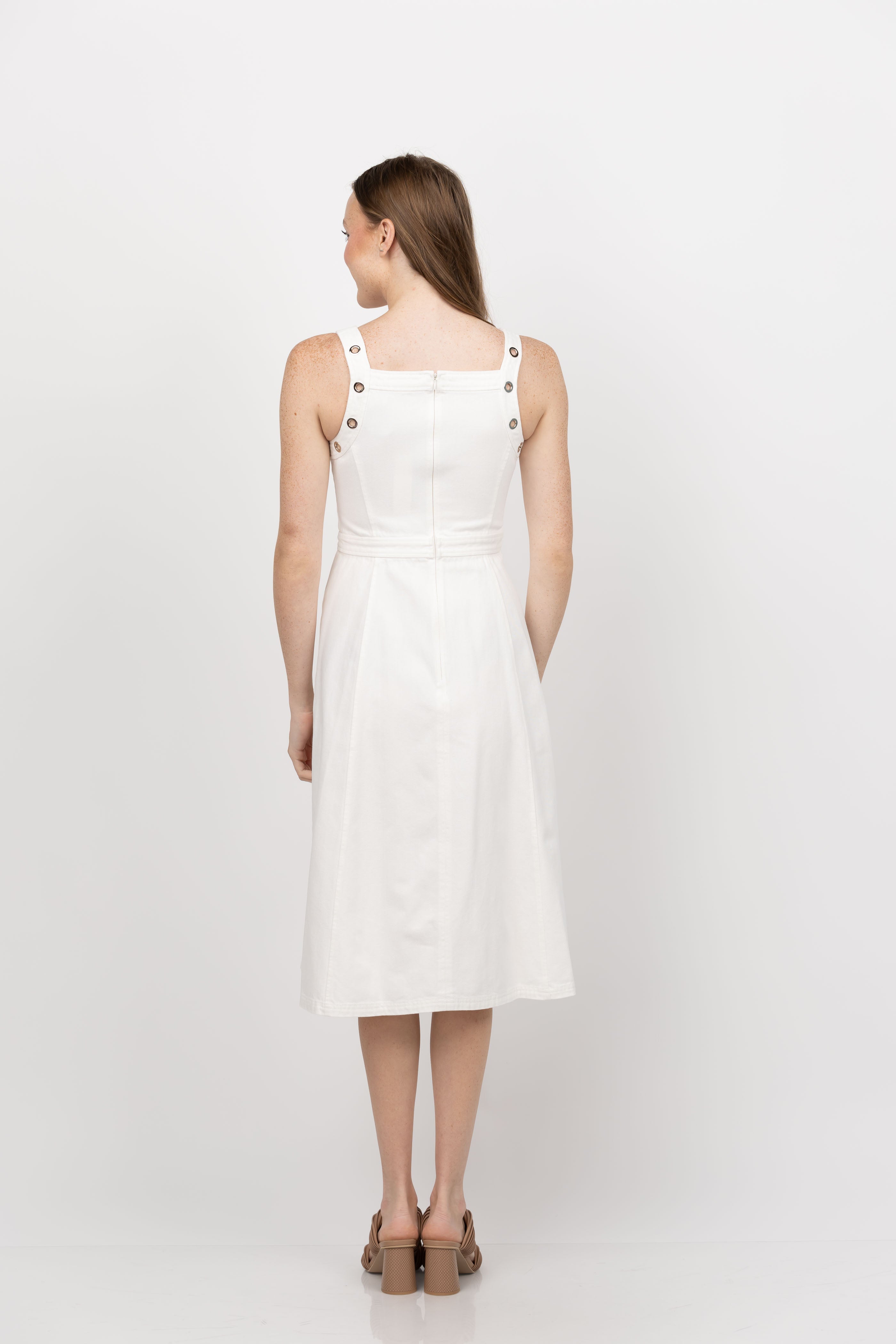 Elevate your wardrobe with the Shoshanna Fernanda Dress in Ivory! This chic sleeveless denim midi dress features a high square neckline, wide shoulder straps with grommets, and a fitted bodice with interior boning for a flattering silhouette. The full A-line skirt with side seam pockets adds functionality to this stylish piece. Unleash your inner fashionista with this must-have dress!