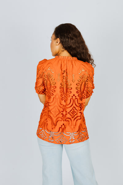 Gorgeous eyelet de chine top. Neckline features slit opening with ruffle at neck edge and optional tie detail for closure. Balloon sleeves are eyelet embroidery fabric. Easy silhouette. Cami lining. Sleeves unlined. Slip in.