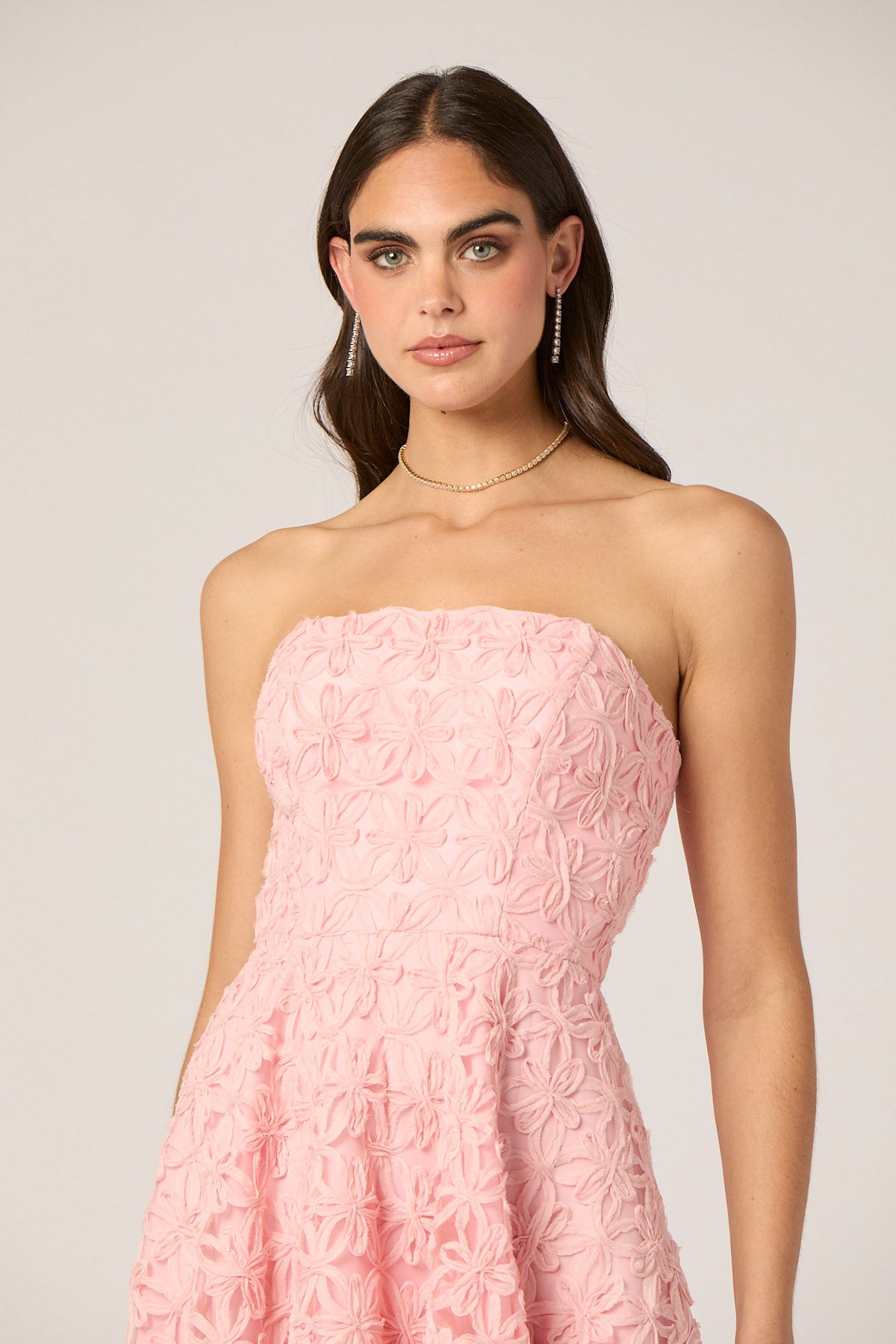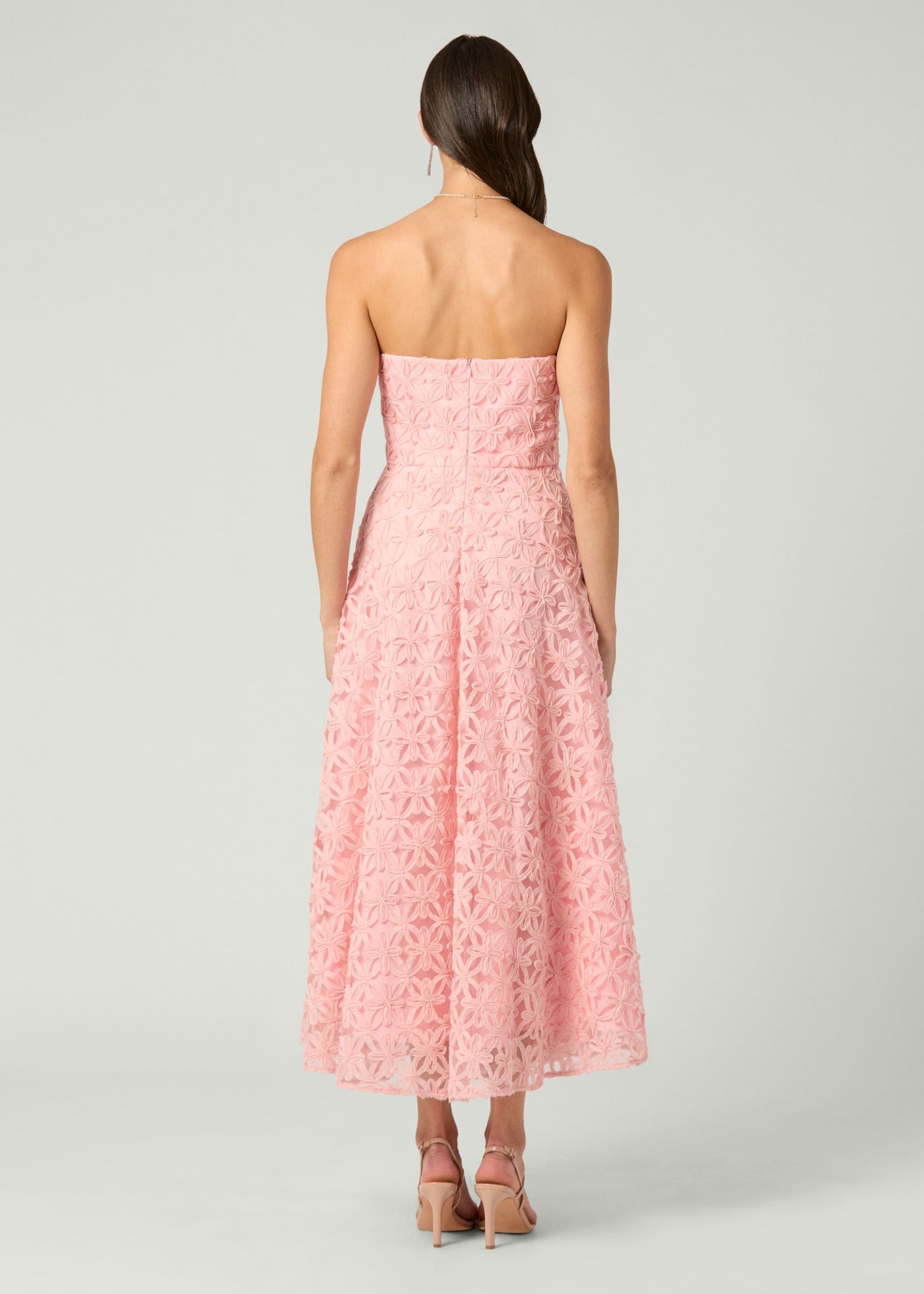 Elevate your style with the Shoshanna Miller Dress in Rose, featuring exquisite 3D embroidered mesh that creates a stunning sheer effect. This strapless dress offers a fitted bodice with full bustier support for a flattering silhouette, complemented by a voluminous A-line circle skirt that moves gracefully. Fully lined and equipped with a hidden back zipper, it combines elegance with comfort for any special occasion.