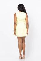 Brighten your wardrobe with the Shoshanna Samara Dress in Sunburst. This charming yellow denim mini dress features a round neckline and a fitted bodice with princess seams that enhance your silhouette. The full A-line skirt adds playful movement, while shirring at the waist and decorative buttoned bands provide stylish accents. Unlined for comfort and equipped with a hidden back zipper, this dress combines flattering design with easy wearability—perfect for sunny days and casual outings.