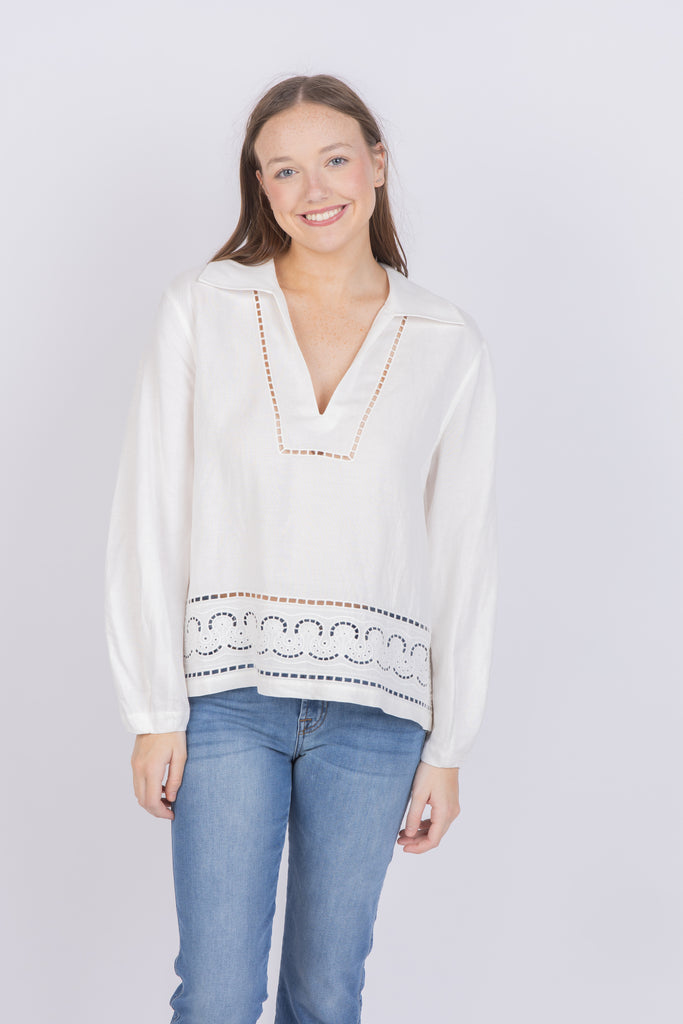 Look stunning in the Simkhai Abel V-Neck Top! This sophisticated classic top features airy blouson sleeves and delicate eyelet embroidery, making it the perfect addition to your wardrobe. Enjoy effortless style that will turn heads!