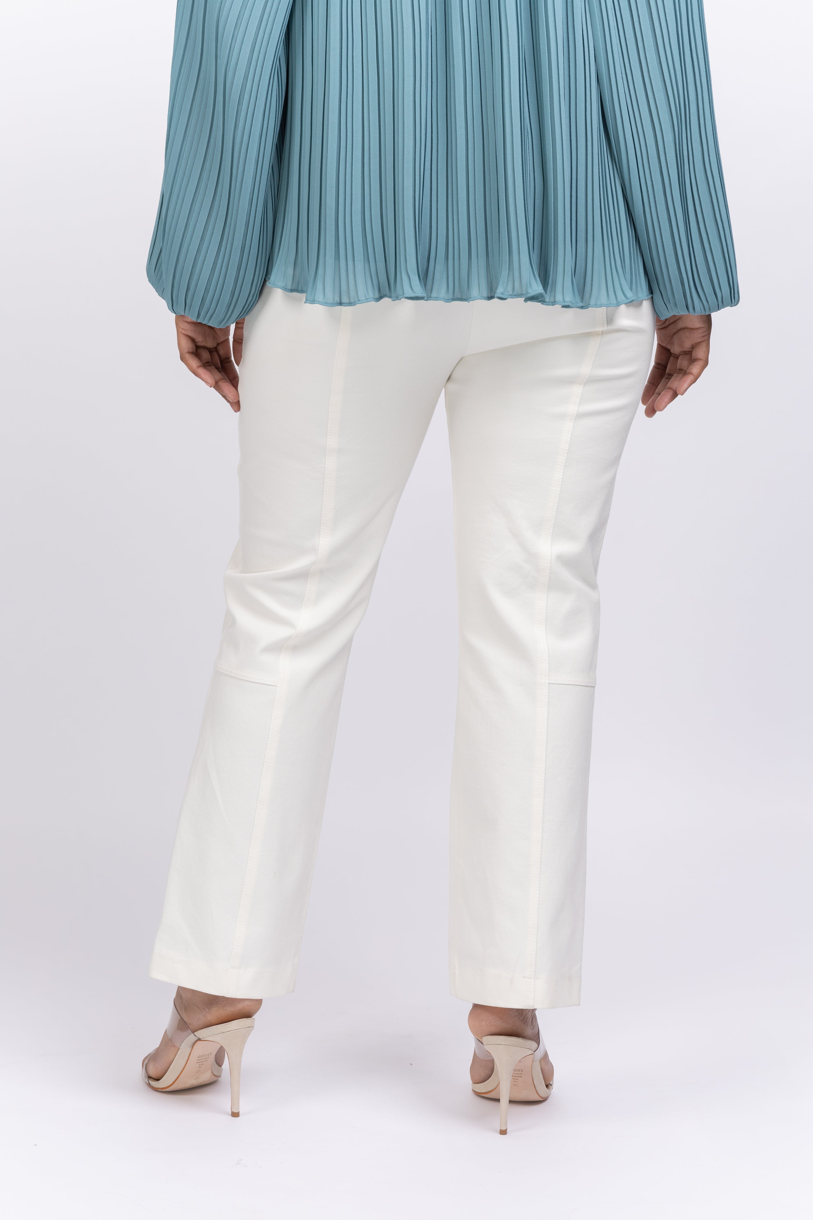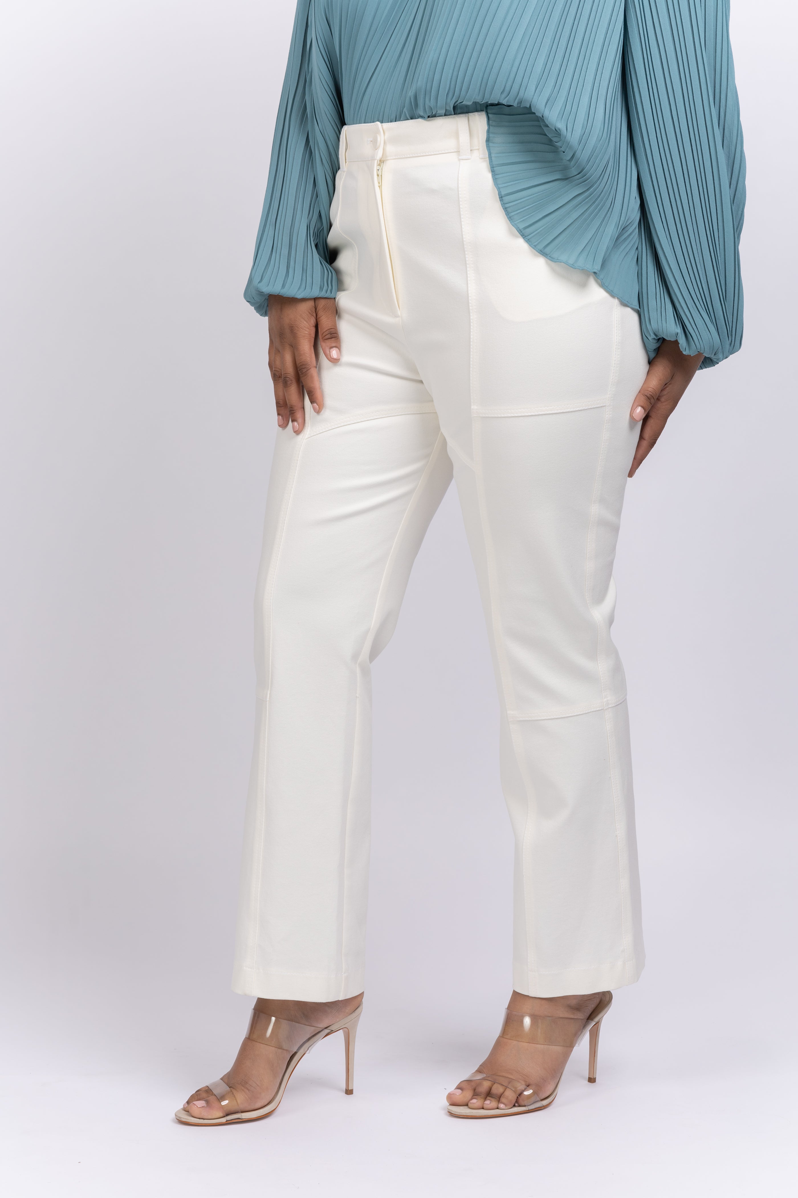 The Jesslyn Cropped Pant in White. Everyday tailoring trouser with cropped hem and subtle, flared leg in a stretch twill blend. Purposeful exposed seams nod to a modern, utilitarian aesthetic.