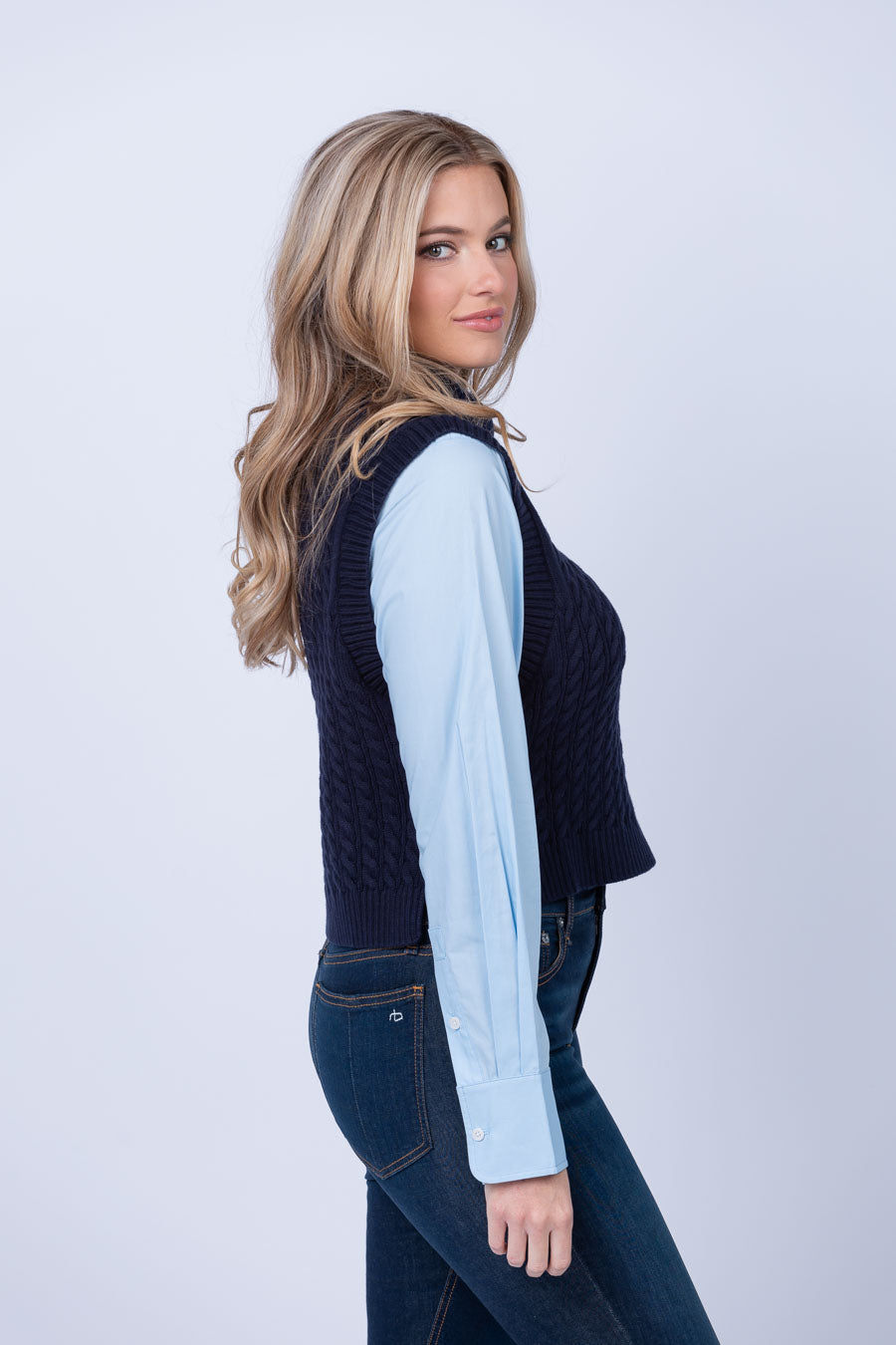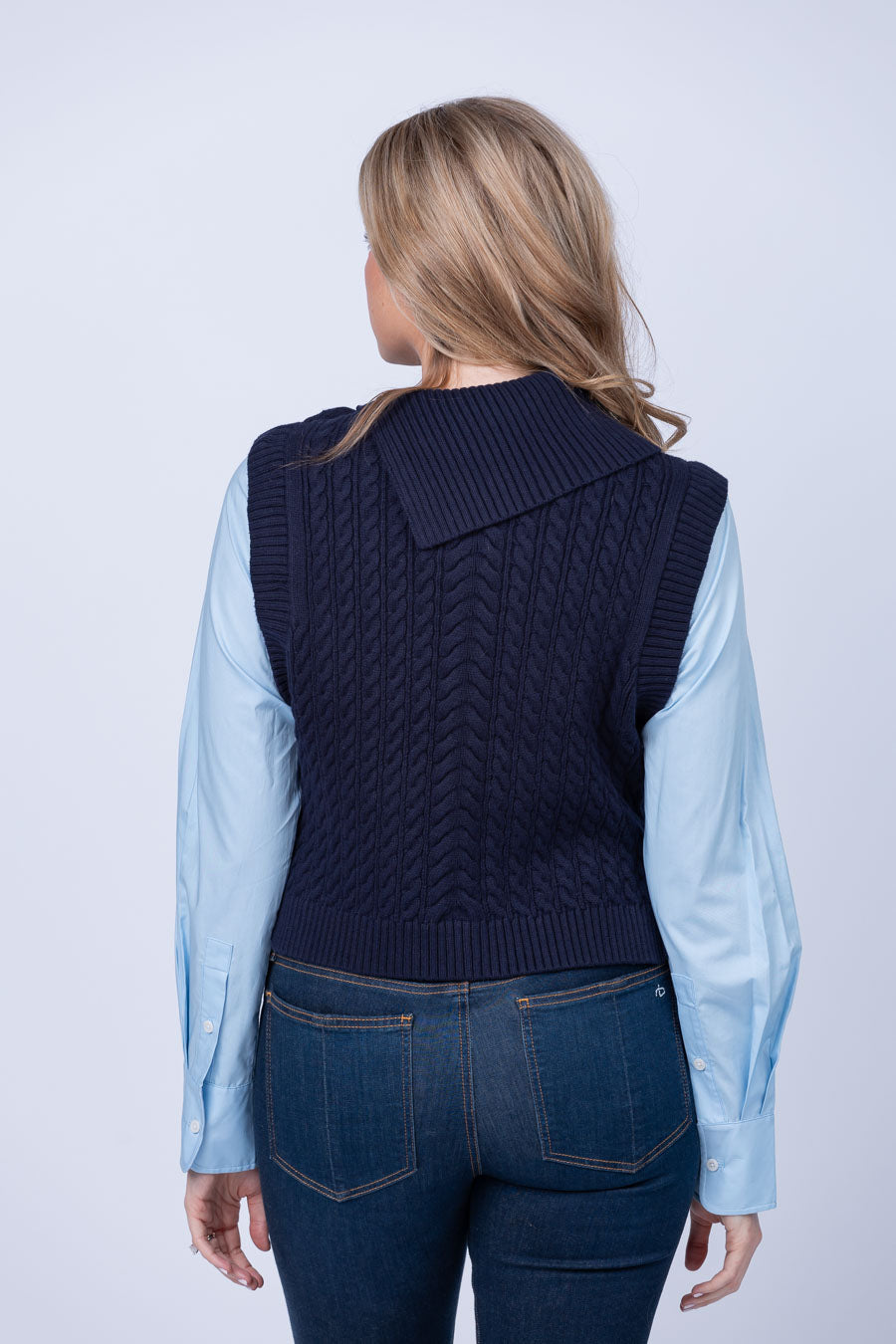 The Simkhai Linnea Top is the perfect way to enliven your wardrobe! The striking Glacier Multi color combines shirting sleeves and a cable-knit body for a unique and stylish look that pairs perfectly with a skort and boots. Make a fashion statement with this eye-catching top!