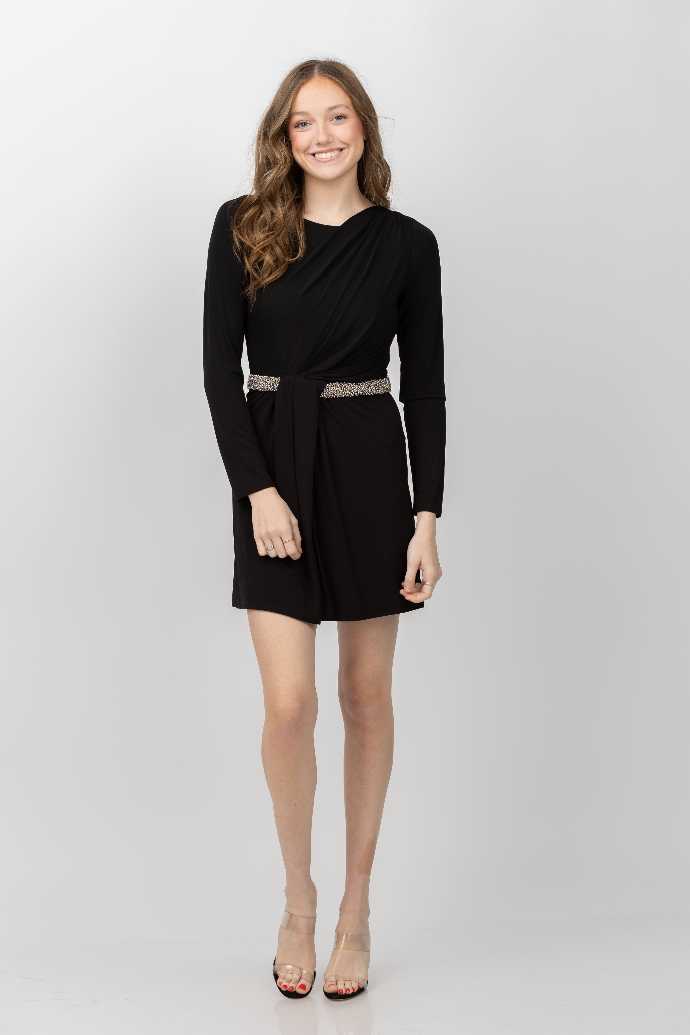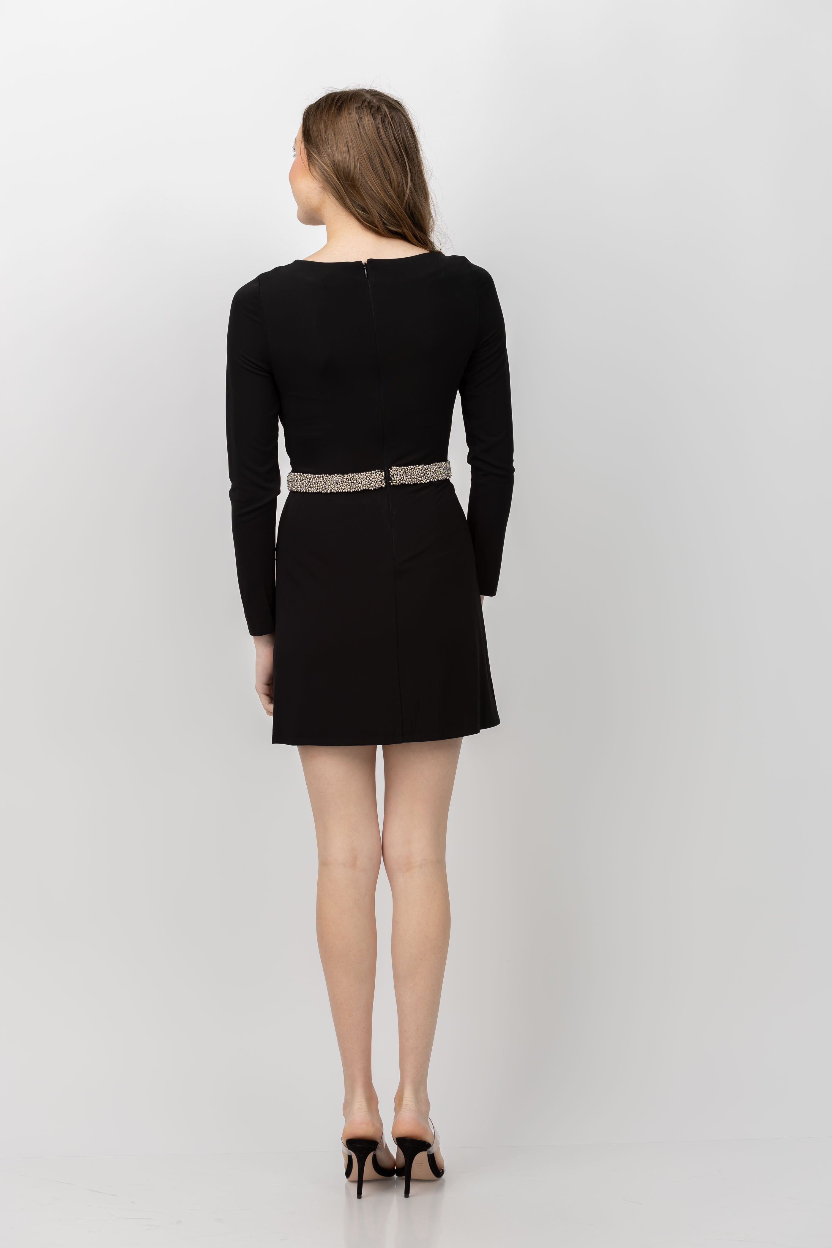 Get ready to turn heads in the stunning Simkhai Tulia Long Sleeve Mini Dress! This black dress features a jewel neck and long sleeves, with a draped bodice and concealed back zip for a flattering fit. The stretch jersey fabric is embellished with intricate beading, adding waist-defining detail to this elegant piece. Make a statement at your next event with this must-have dress!