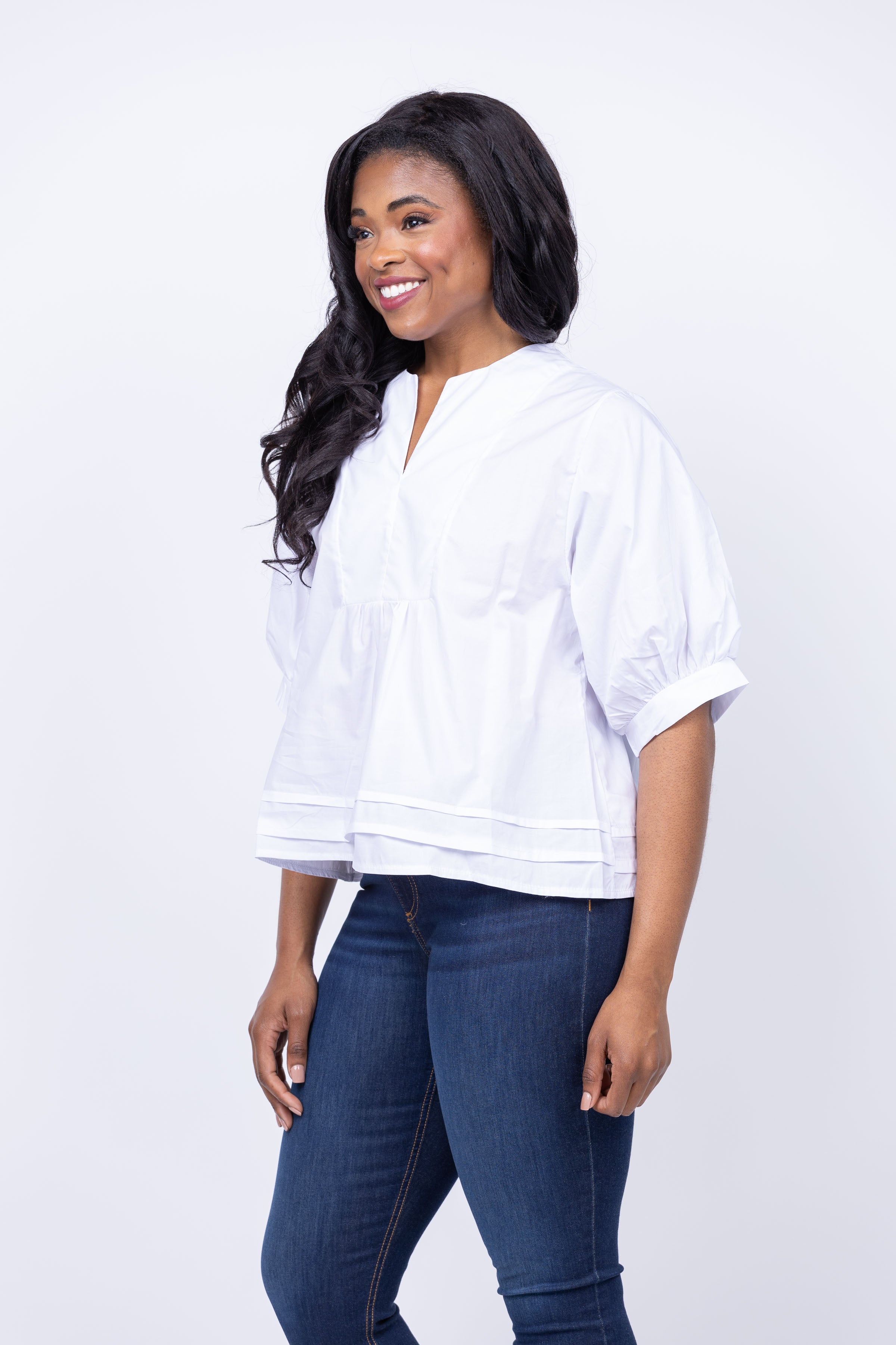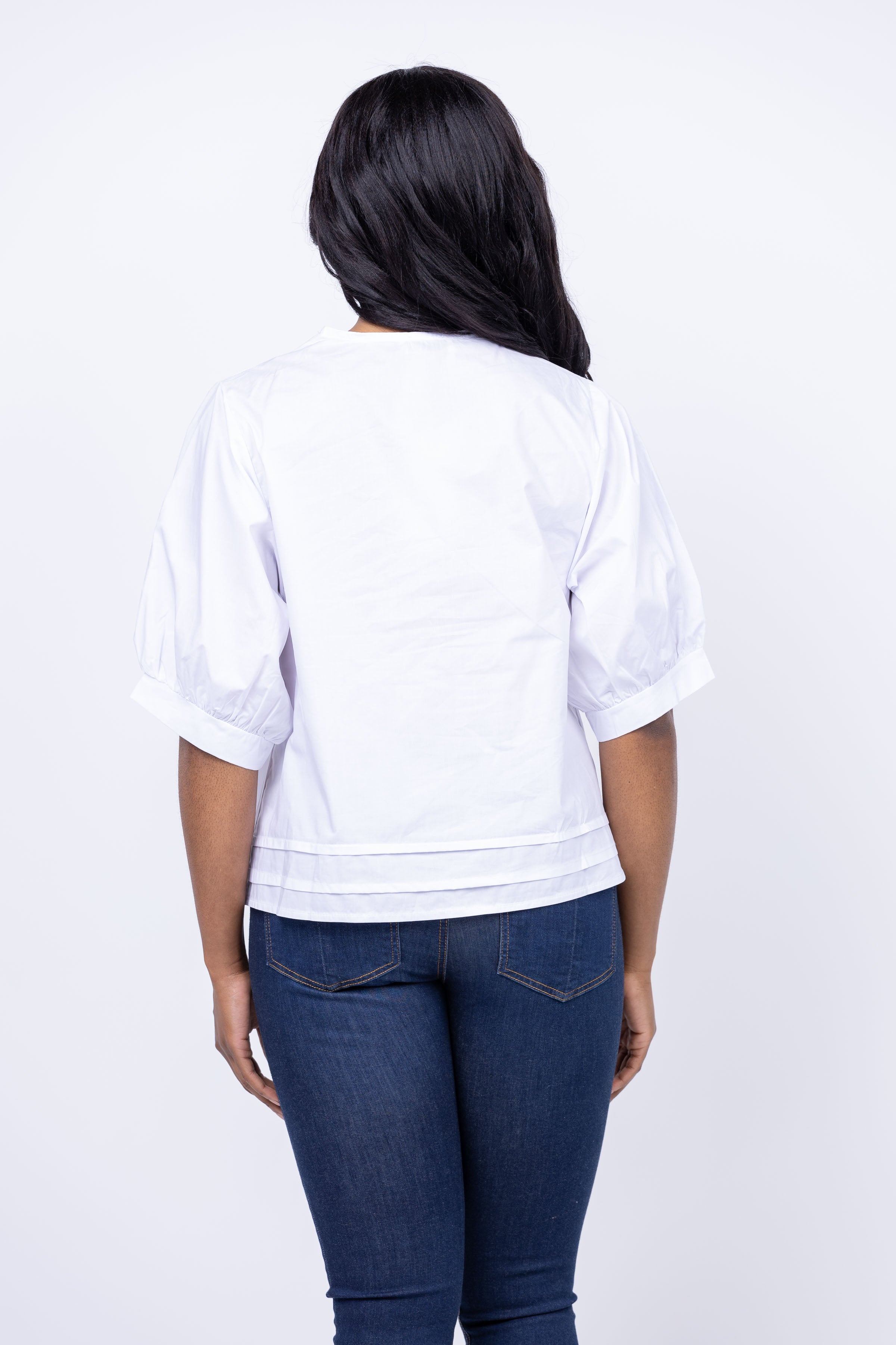 Experience effortless elegance with the Sofia Allison Top in White! This stunning top features intricate sleeve detailing and puff sleeves, adding a touch of sophistication to any outfit. Pair it with light denim jeans or shorts for a chic and stylish look. Upgrade your wardrobe with this must-have piece!