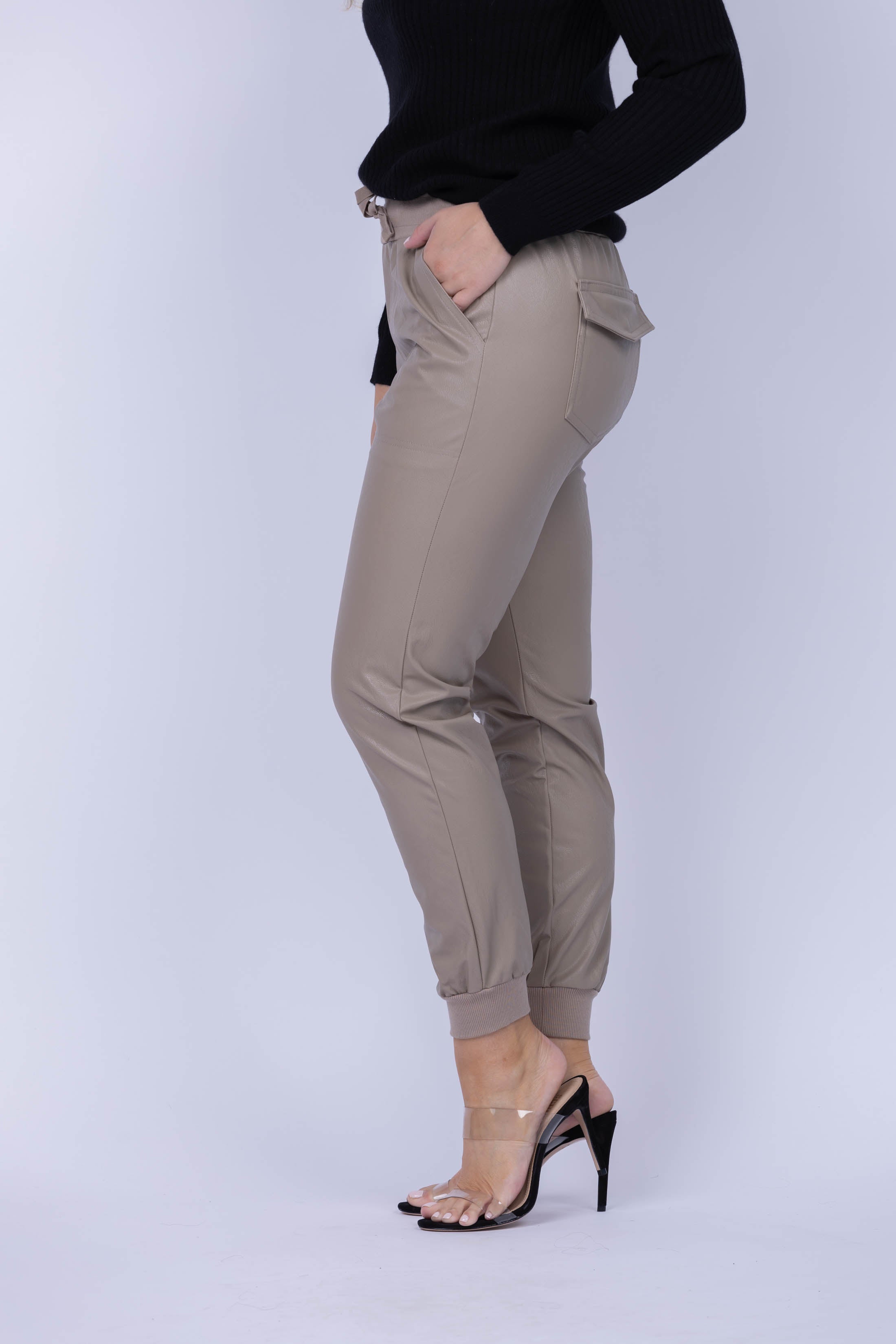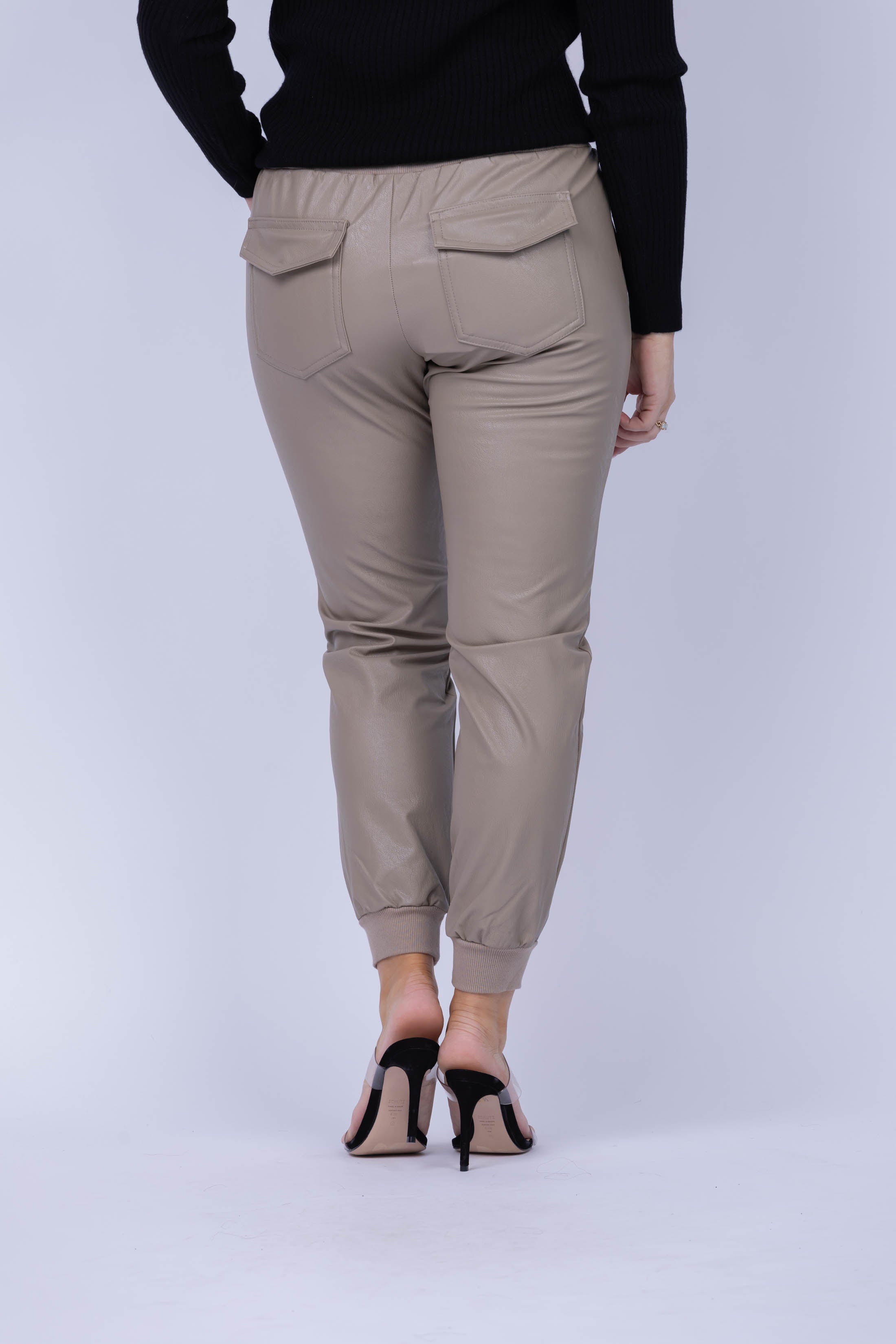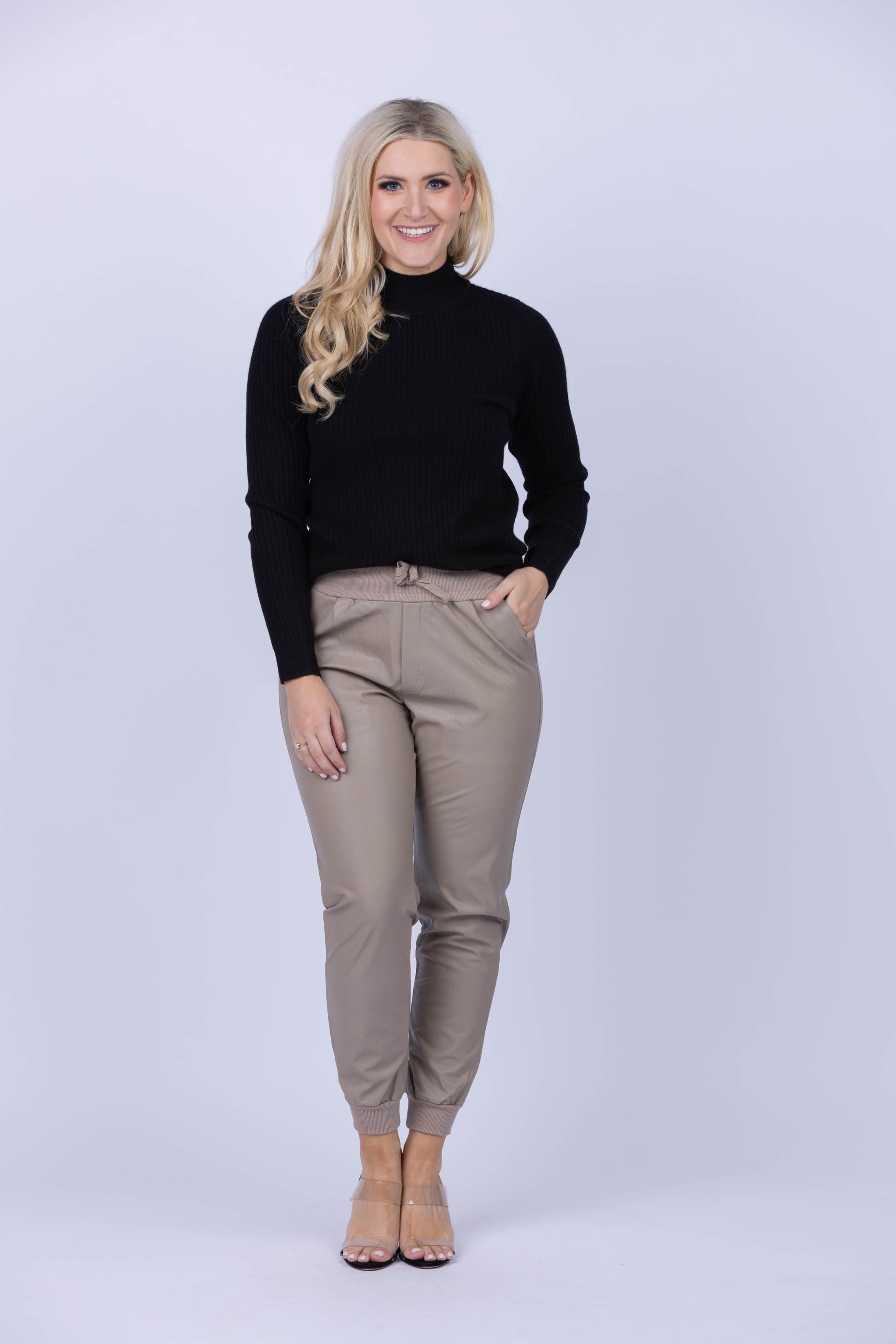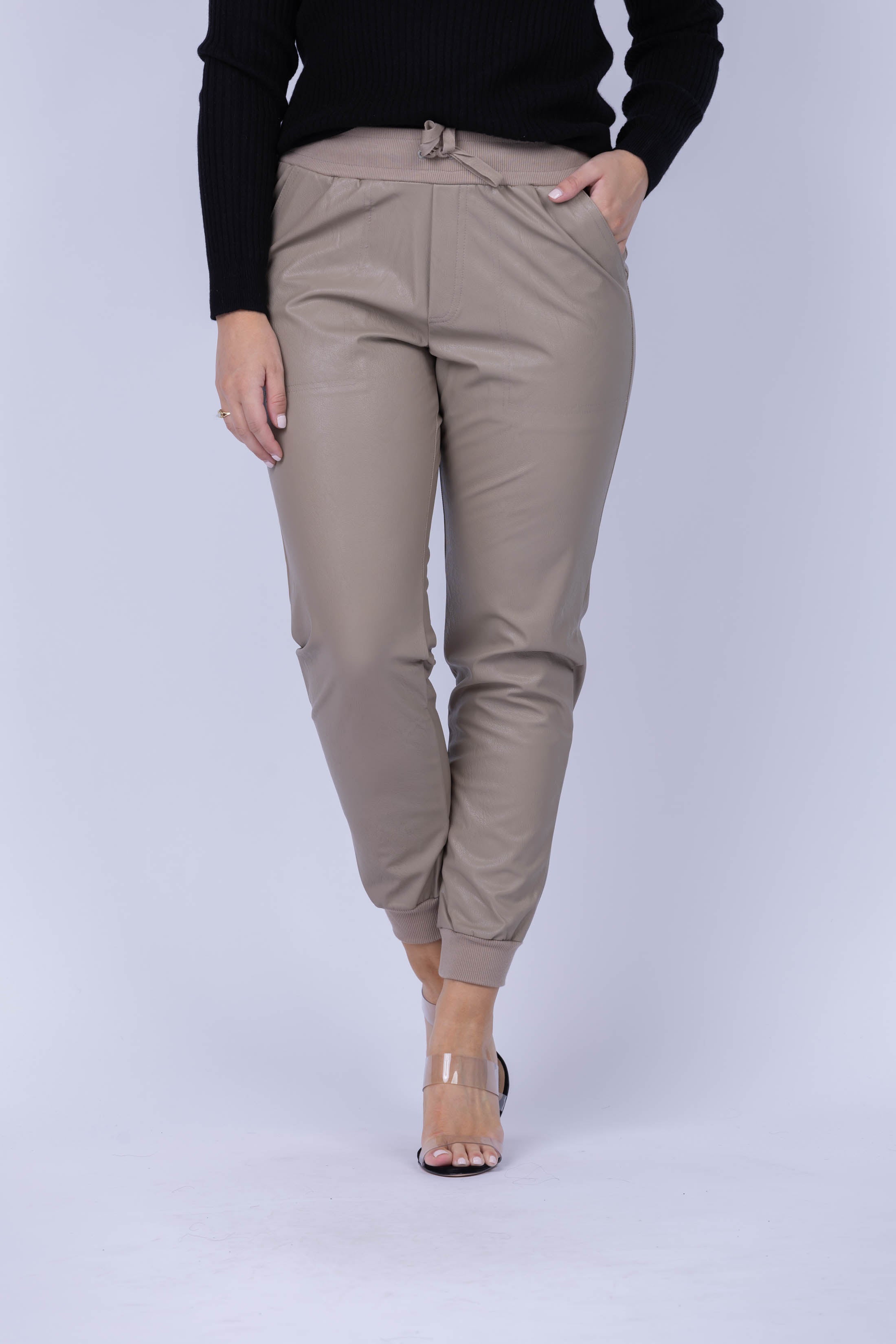 The tumbled vegan leather of this jogger pant ensures a polished look with edgy vibes. Ribbing at the drawstring waistline and cuffs provide timeless jogger style, while pockets bring a casual feel. Make a bold statement with a tank or layer up with an oversized sweater!