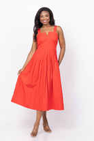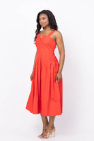 The Day Break Dress in Hot Red redefines summer elegance with a nod to 1940s style. Its snug smocked bodice and wide shoulder straps ensure a comfortable, secure fit, while the square neckline with a subtle notch adds a unique flair. Adjustable back straps provide personalized comfort, and delicate trapunto stitching highlights the edges for refined detail. The pleated waist shapes a flattering silhouette, making this dress a standout choice for effortless, confident style all season long.