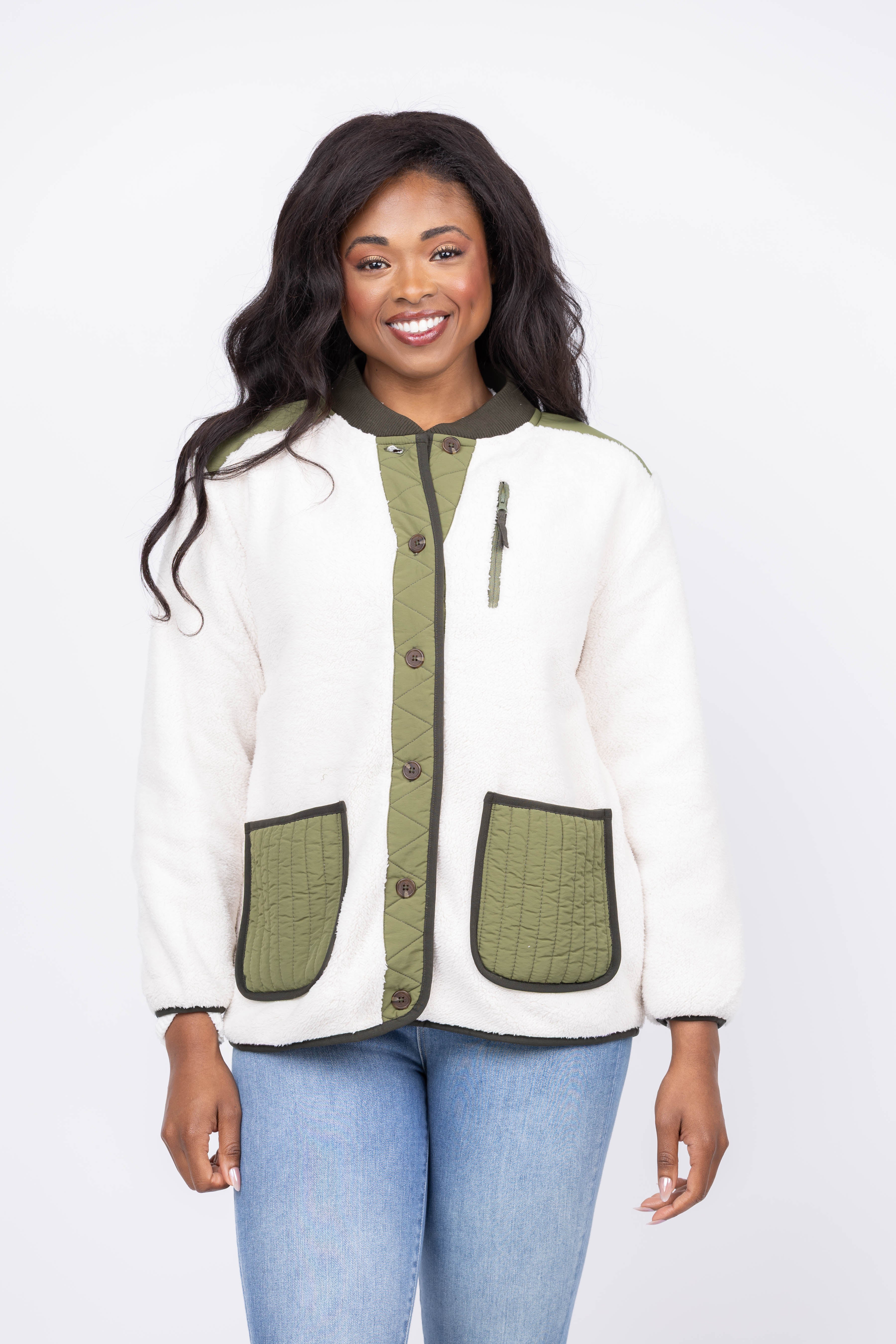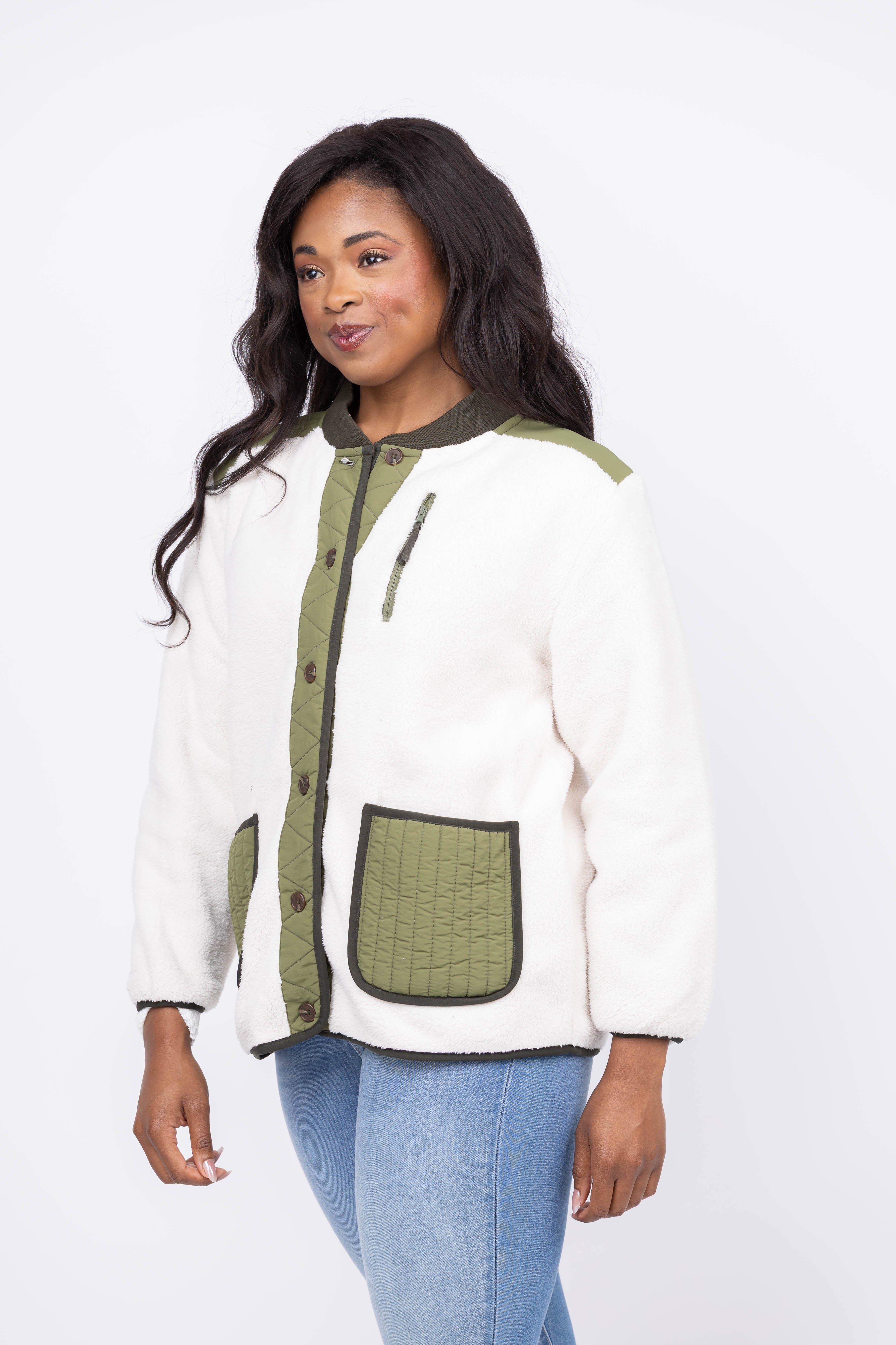 Stay effortlessly stylish and warm with The Great Plush Tundra Jacket in Cream & Army. Made from supersoft, lofty plush fleece, its vintage-inspired colorblocking adds timeless charm. Featuring dropped shoulders for a relaxed fit, a button front placket for easy wear, and multiple pockets to keep your essentials secure, this jacket combines comfort and practicality for your everyday adventures.