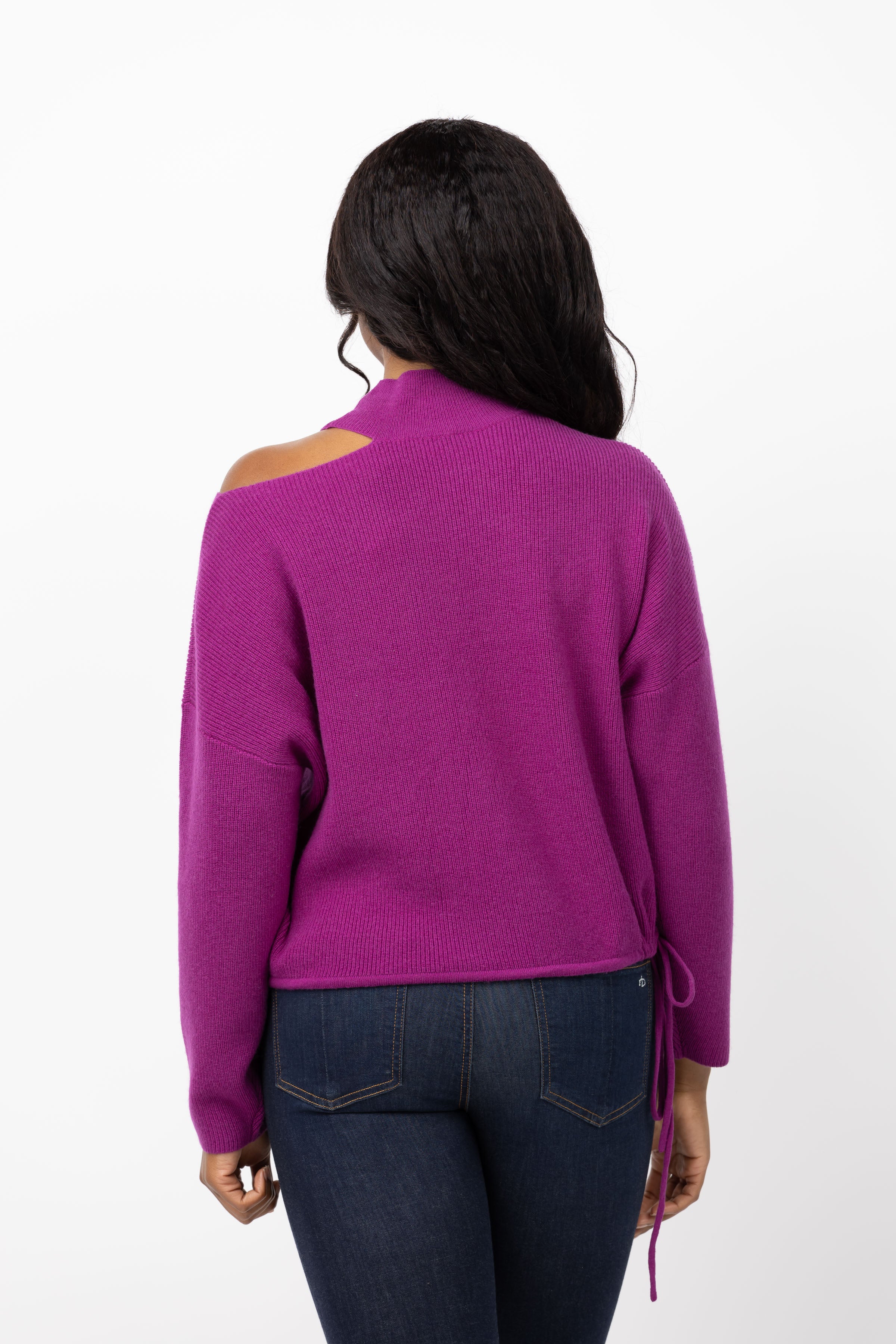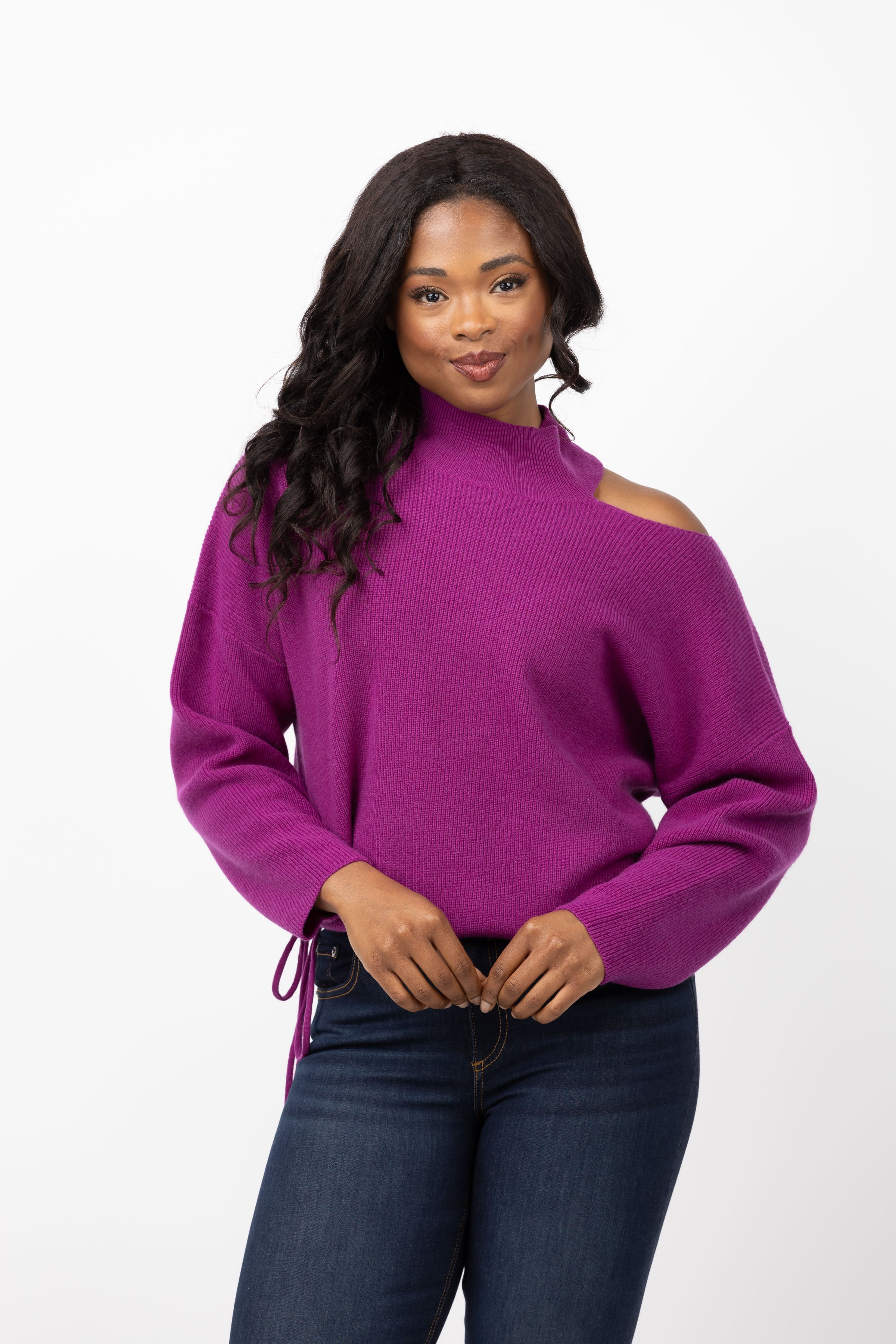 Elevate your night out look with the Sei Open Shoulder Sweater in Berry! This stylish sweater features a unique tie at the side for added flair. Dress it up with black leather jeans and a bootie for a sleek and chic ensemble. Be the envy of every event in this perfect night out sweater!