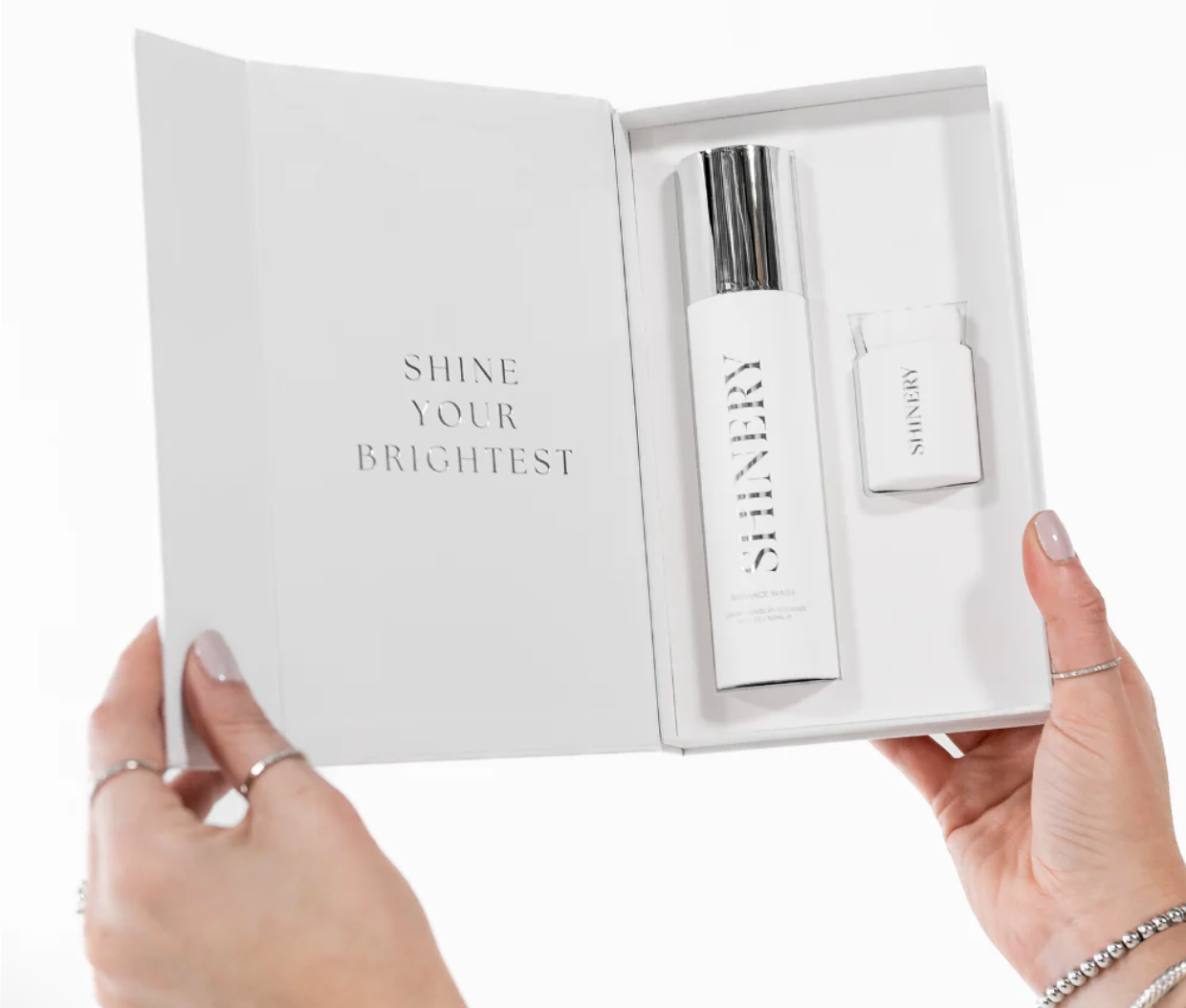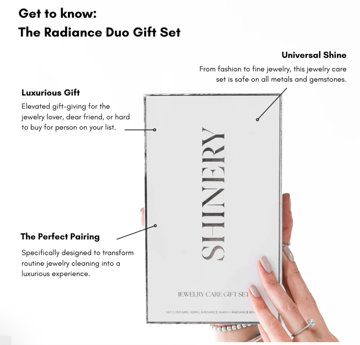 Clean and sparkle your jewelry like a pro with The Shinery Radiance Jewelry Cleaner Set. Its professional-level solution and brush duo make it easy to bring the shine and luster back to your jewelry, restoring beauty and glamour to your favorite pieces. Make jewelry care easier and more luxurious than ever with the Radiance Wash Luxury Jewelry Cleaner.