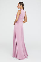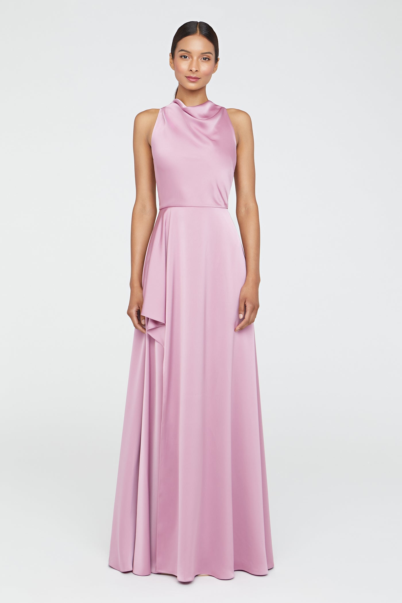 The Theia Amara Cowl Drape Gown in Lilac Whisper combines timeless elegance with modern design. Its draped high-neck cowl and asymmetric skirt slit create graceful movement, while the double-faced satin fabric offers a luxurious, soft cascade flounce. Sleeveless and floor-length, this gown is perfect for bridesmaids or the stylish mother of the bride seeking sophistication and comfort.