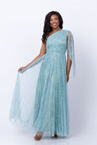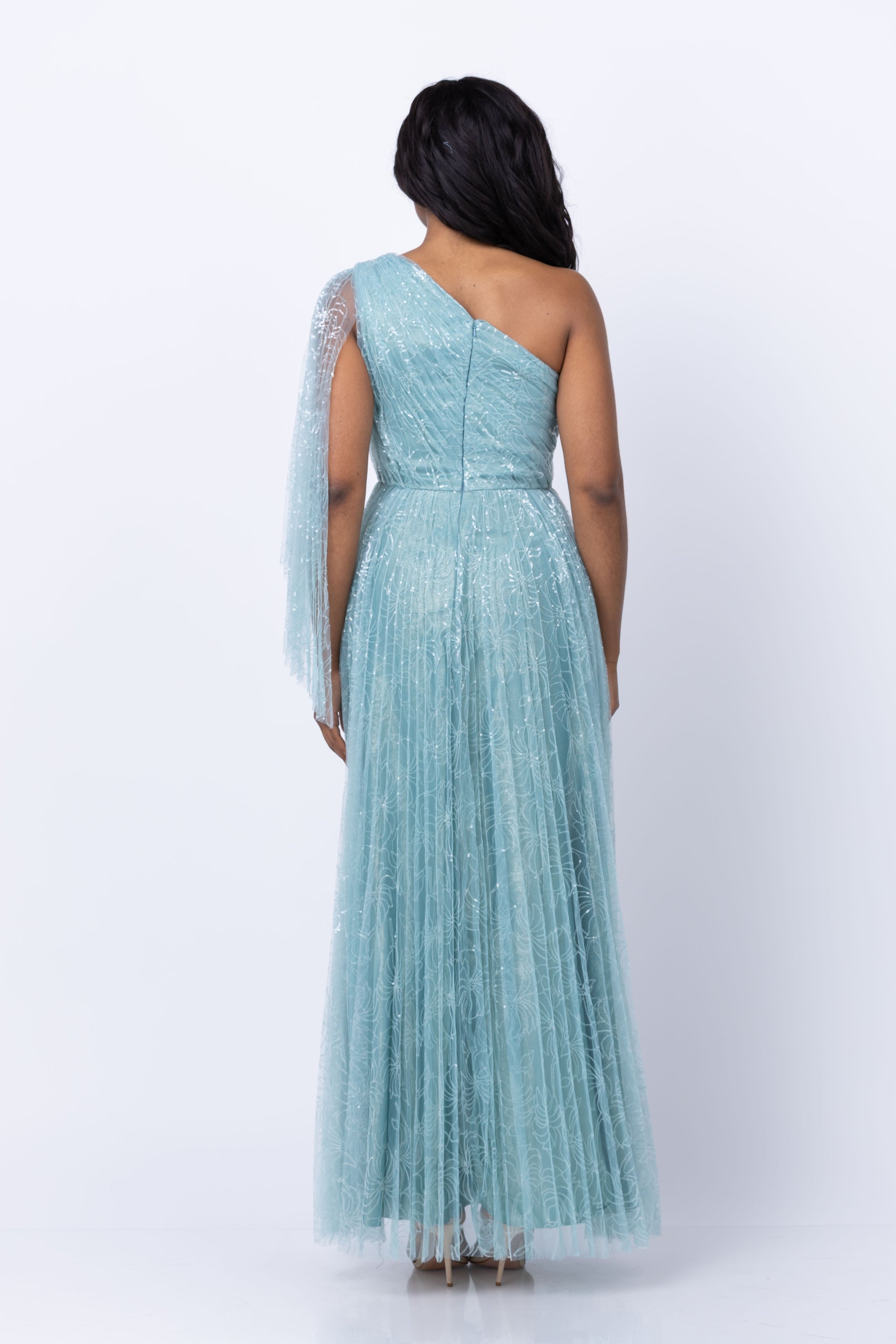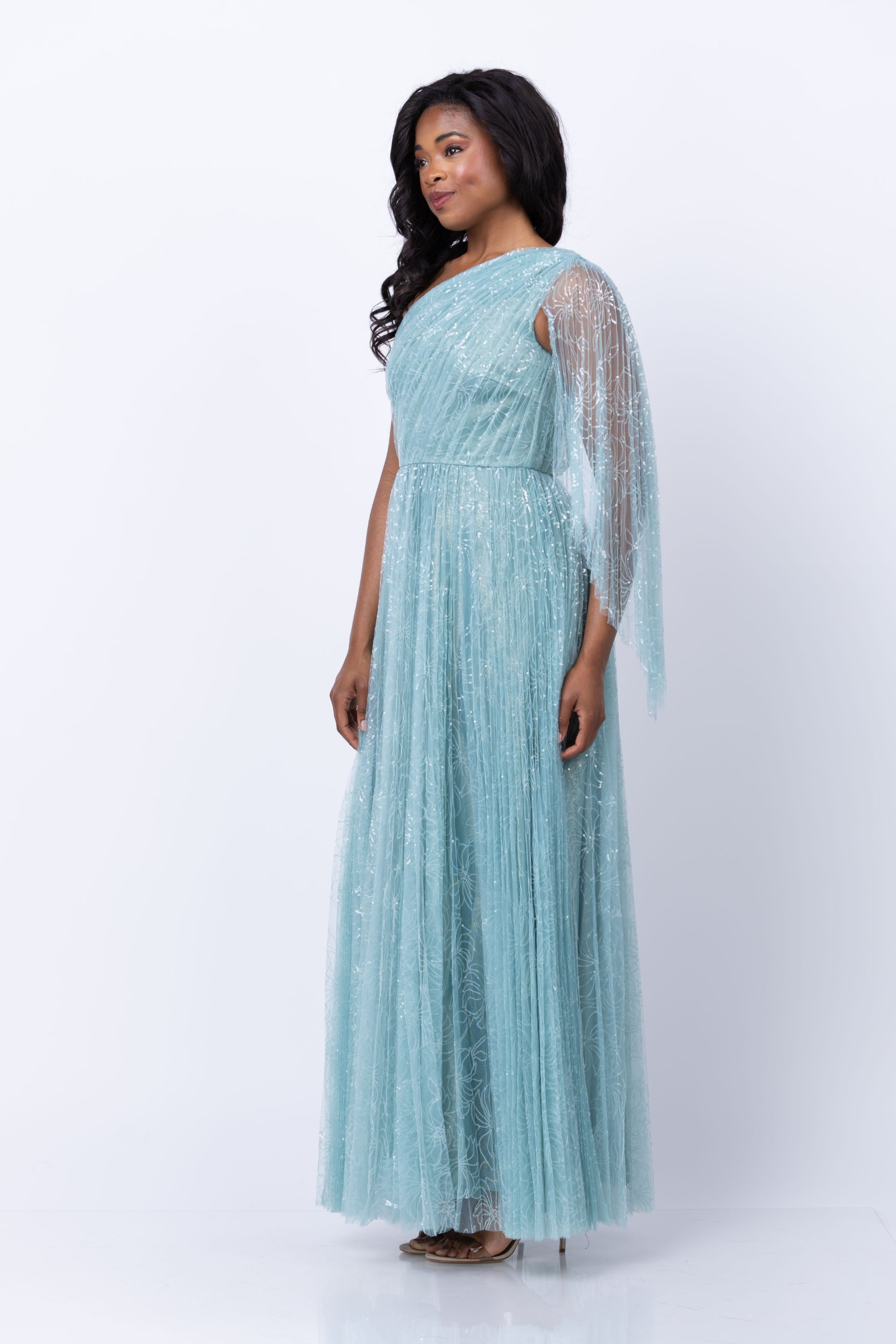 Elevate your style with Theia's Carol One Shoulder Dress. The custom sequin tulle artwork sparkles in Spring's Aqua Mist hue, radiating effortless elegance. Pleated design and asymmetric drape make it the perfect choice for any formal event. Discover the beauty of effortless sophistication.