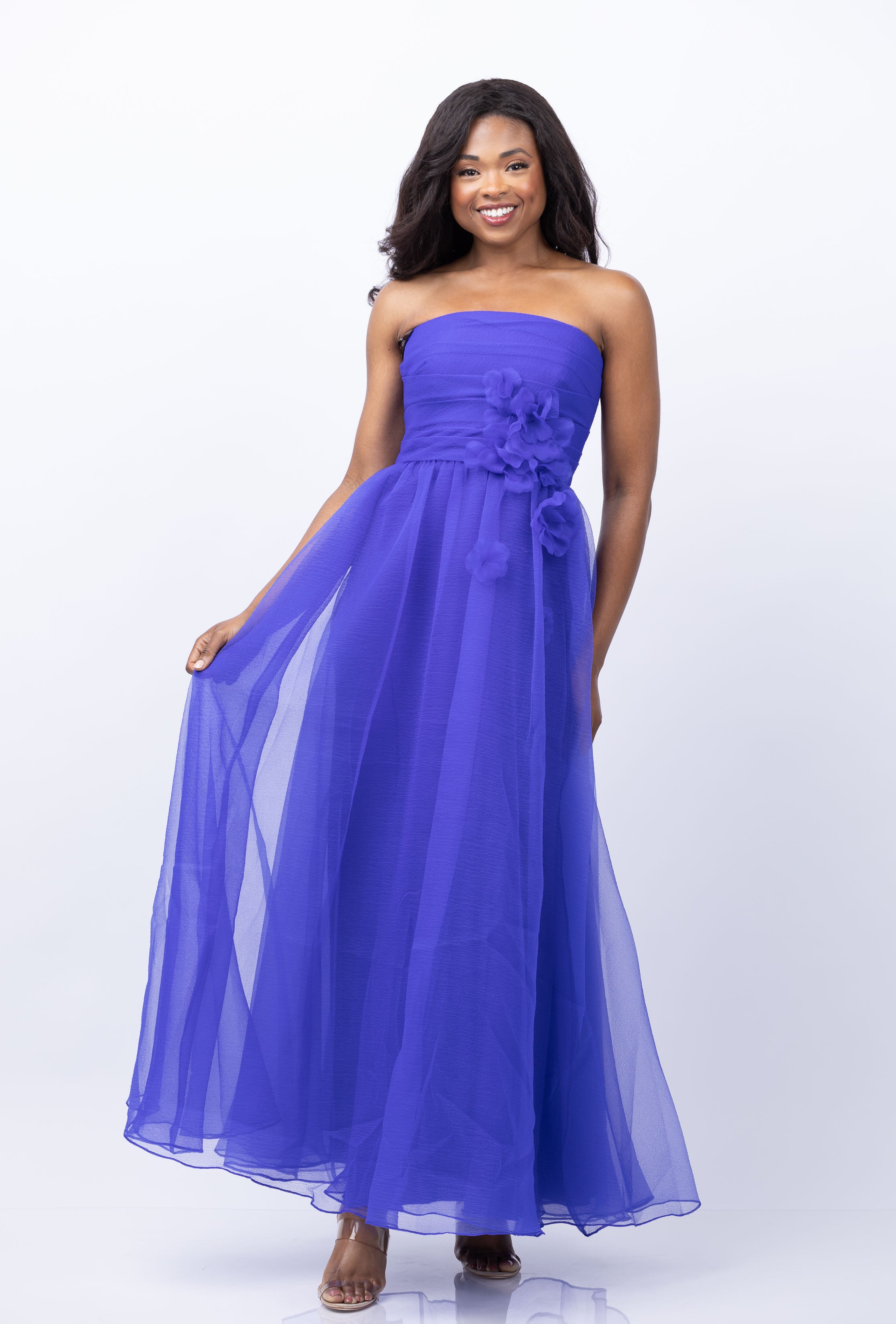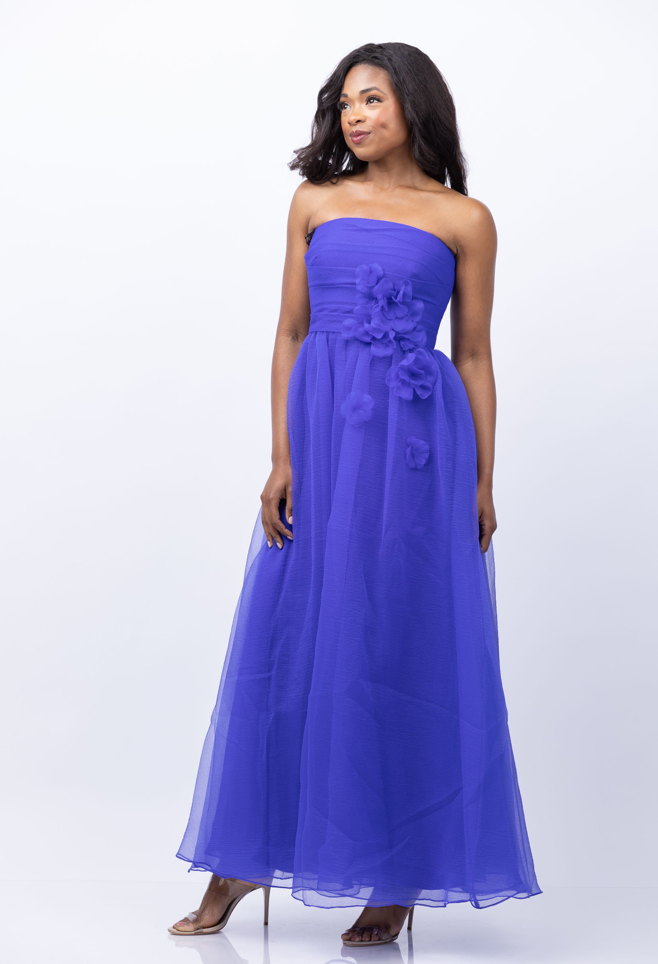 Theia's Organza Strapless A-Line Gown is a vision of ethereal elegance, featuring a sleek strapless bodice and a voluminous ball skirt crafted from premium organza. Adorned with exquisite 3D floral appliqués along the bodice and waist, this gown stands out with its captivating texture and depth. Perfect for any grand entrance, it combines whimsical charm with timeless sophistication, making every moment unforgettable. This gown is not just a piece of clothing but a statement of elegance, designed to transform special occasions into magical memories.