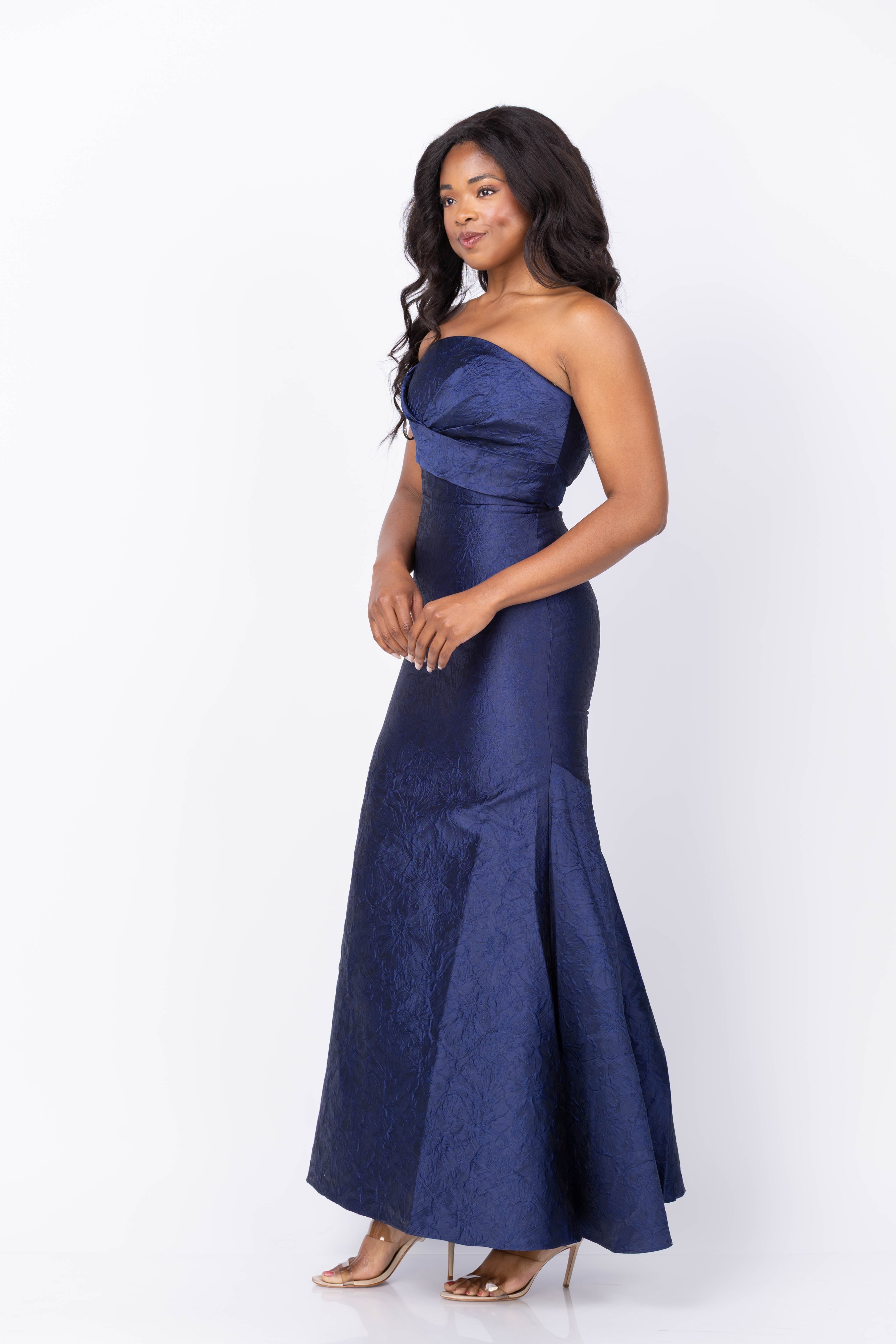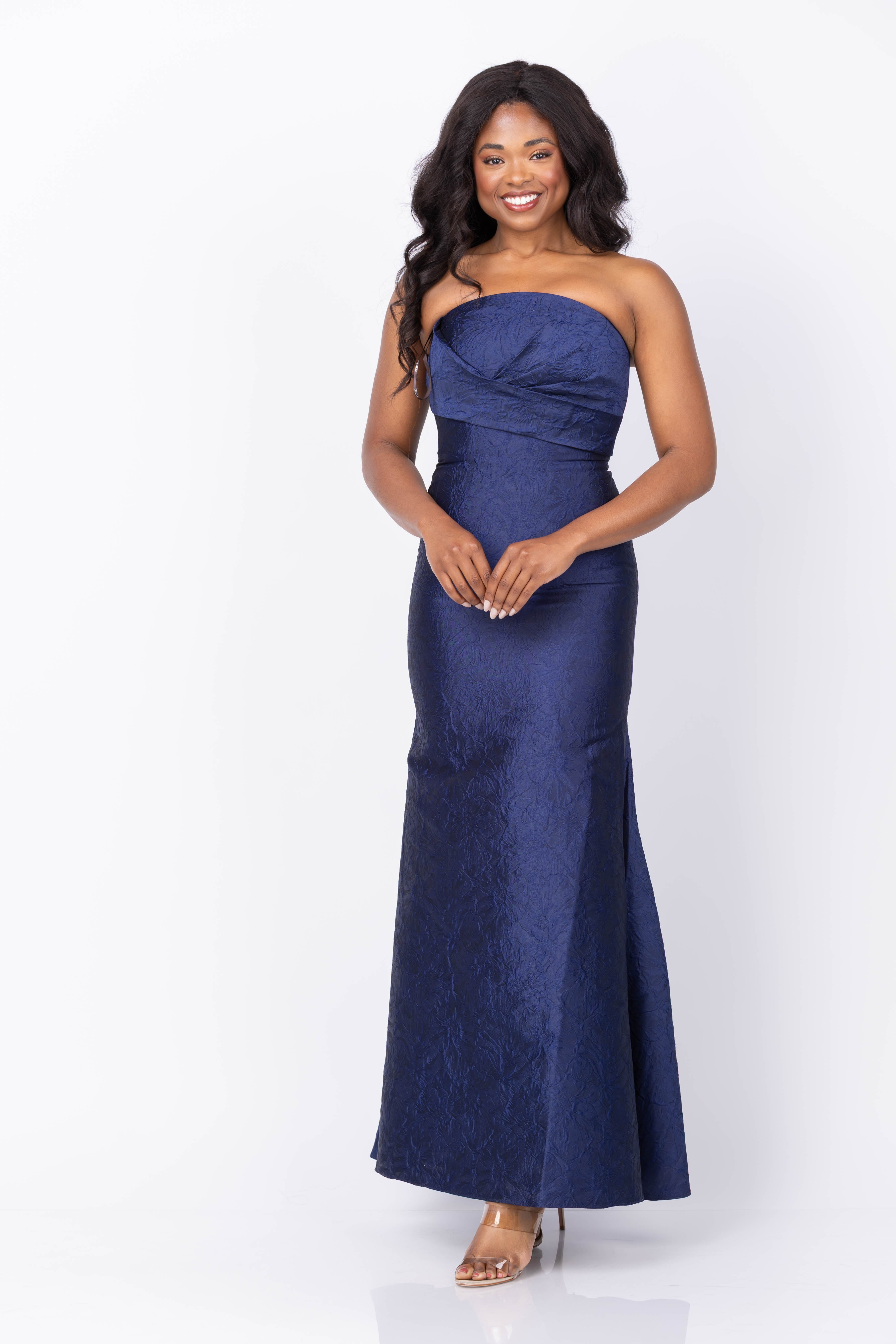 Elevate your evening wardrobe with the Theia Harlow Strapless Gown in Midnight Fog. Crafted from luxurious cloud jacquard, its fit-and-flare silhouette and softly arched neckline highlight your figure with elegance. The wrapped bodice adds a refined touch, while the floor-length design ensures timeless sophistication—perfect for fall galas and special receptions. Make a stunning statement with this sleeveless, strapless gown that blends classic structure with modern grace.