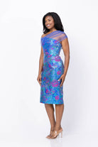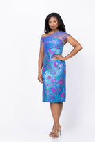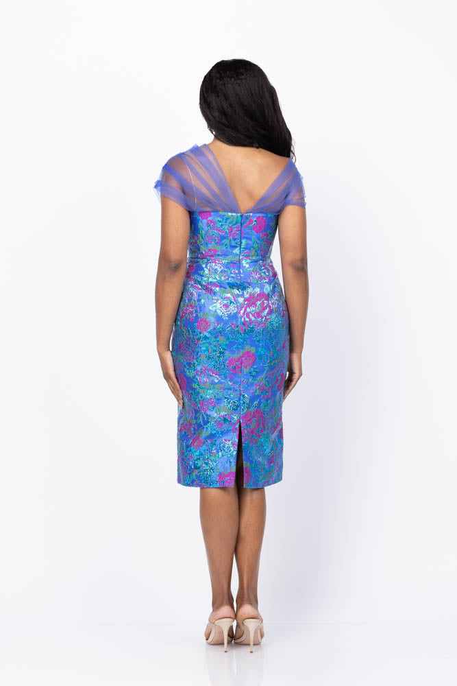 Theia Jaylen Draped Shawl Dress in Blue dazzles with a shimmering jacquard fabric featuring a new floral motif woven in metallic threads. Its asymmetric neckline and sheath silhouette create a sculpted, elegant look, while the sheer tulle shawl drape floats gracefully off the shoulder. Sleeveless and midi-length, this dress is perfect for cocktail hours, receptions, or any occasion that calls for a touch of enchantment. Embrace effortless glamour and stand out with this spellbinding design.