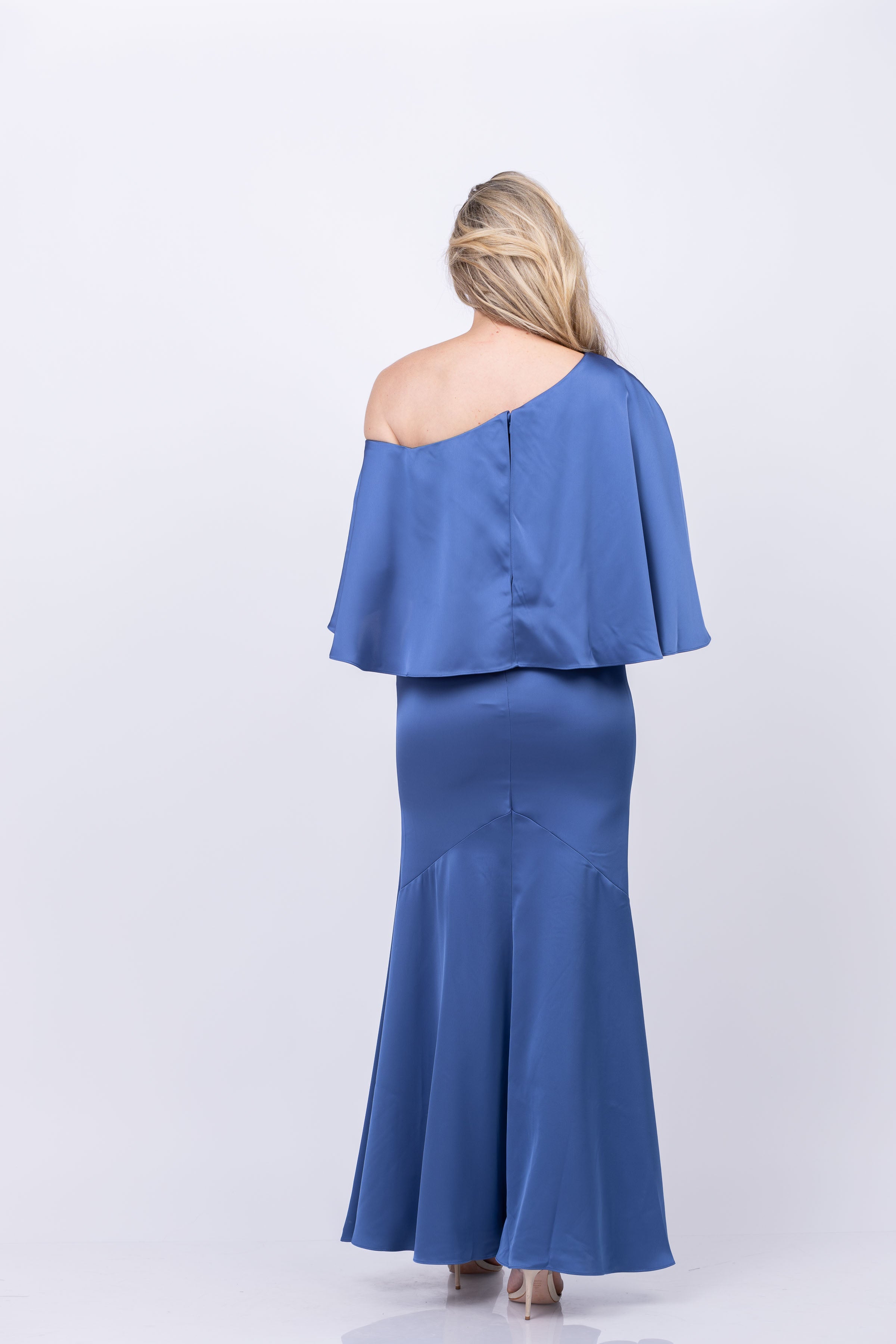 Get ready to turn heads in Theia's Kia Cape Fit and Flare Gown! With a modern asymmetric neckline and elegant draped cape sleeve, this double-faced satin gown combines drama and classic sophistication. The floor length silhouette adds an extra touch of glamour. Elevate any special occasion with this show-stopping dress!