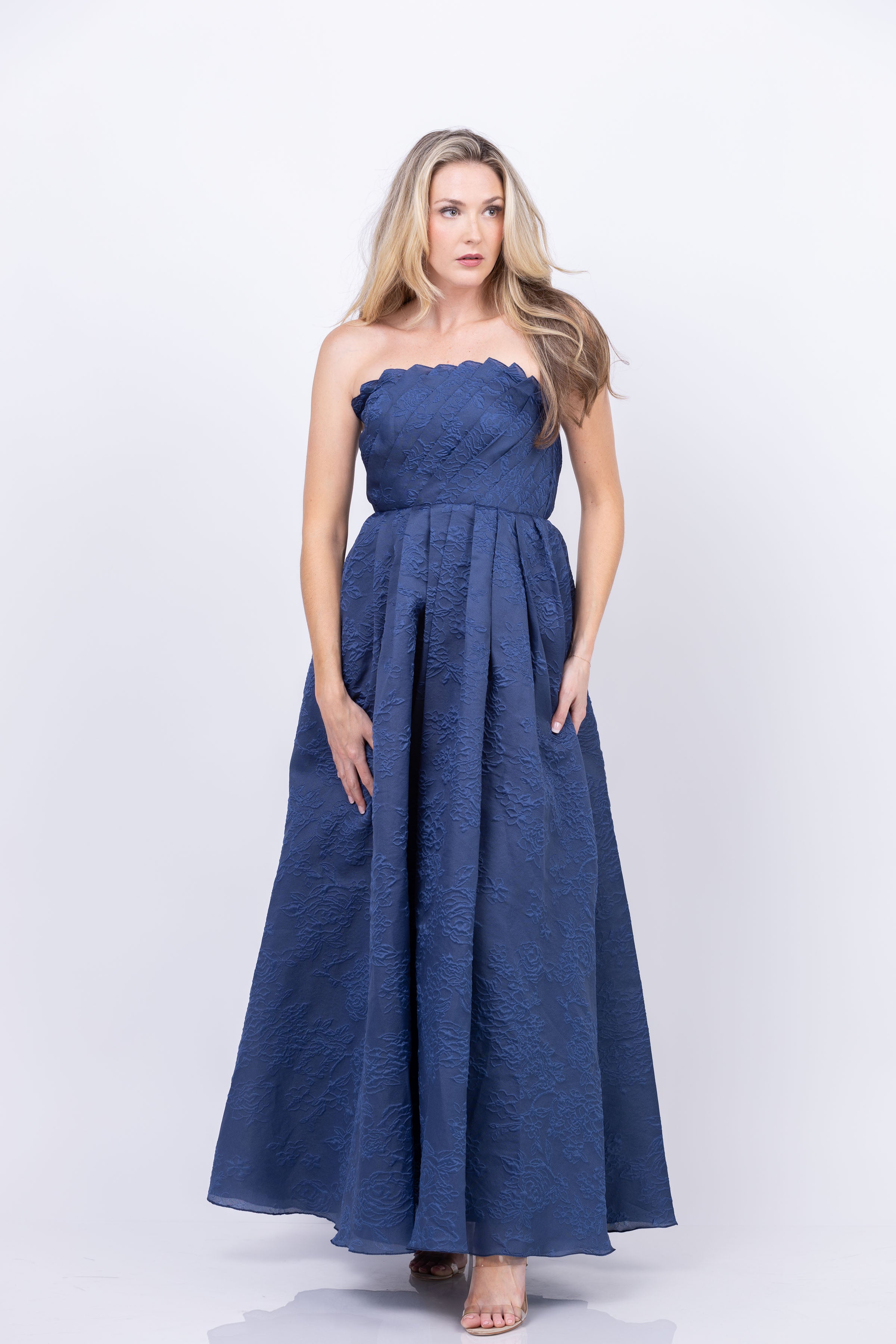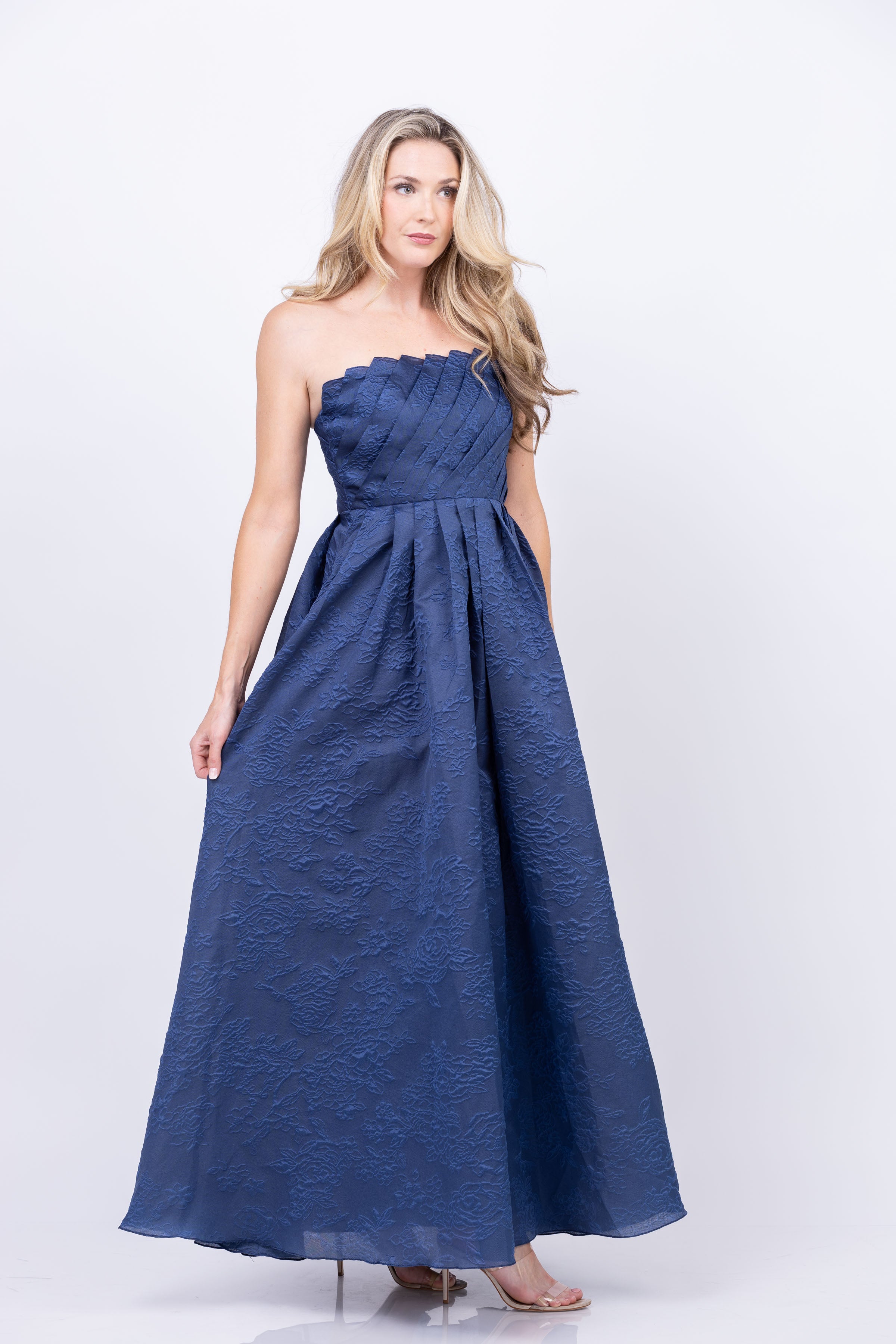 Experience modern elegance with Theia's Mariana Fan Fold Bodice Gown. This midnight celeste cloud jacquard ball gown features a fan-fold bodice with tuck pleats for a unique, eye-catching look. The voluminous skirt with pockets adds convenience and style, while the strapless design and A-line silhouette flatter every figure. Don't miss out on this floor length gown that embodies true sophistication.