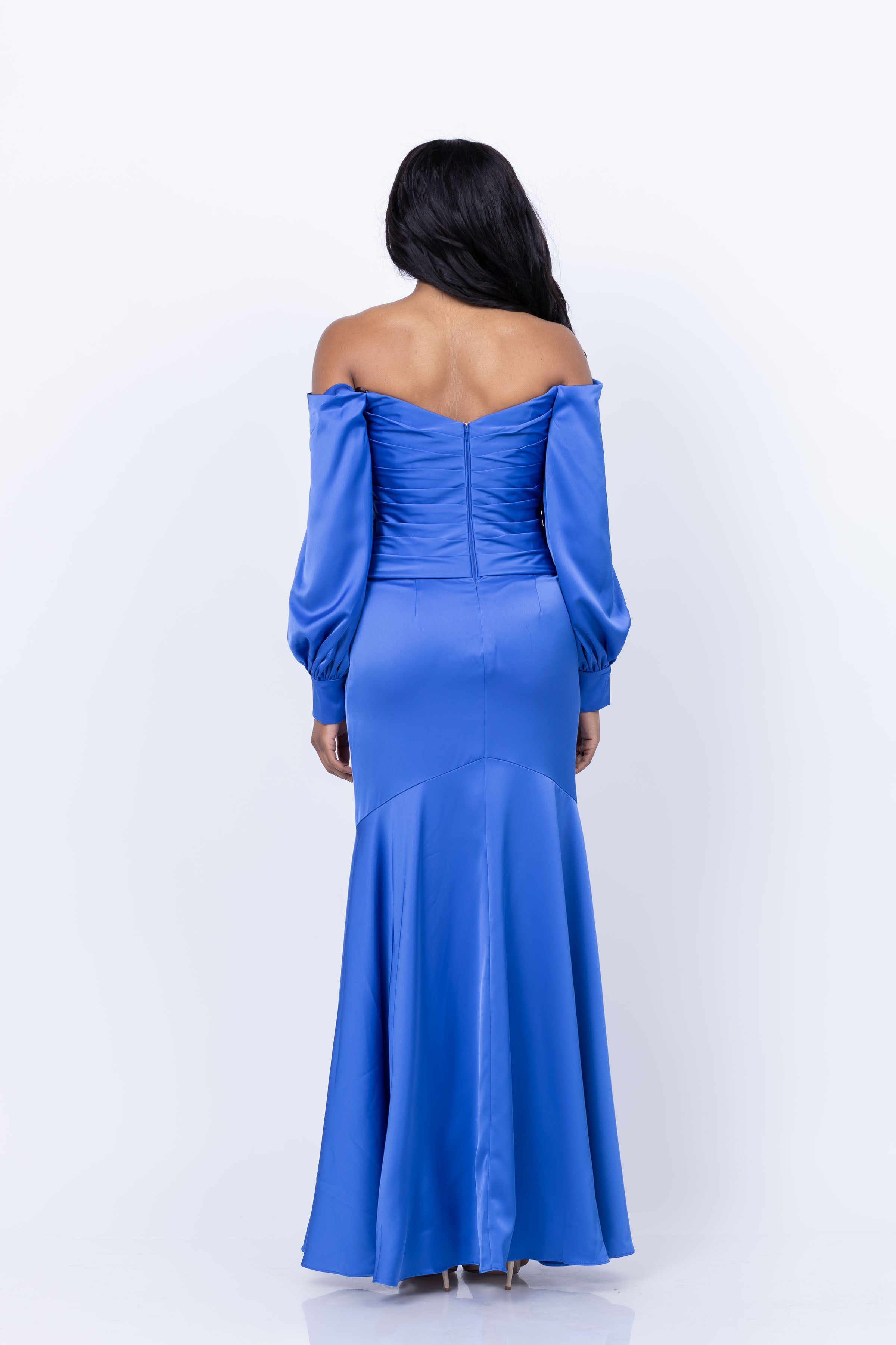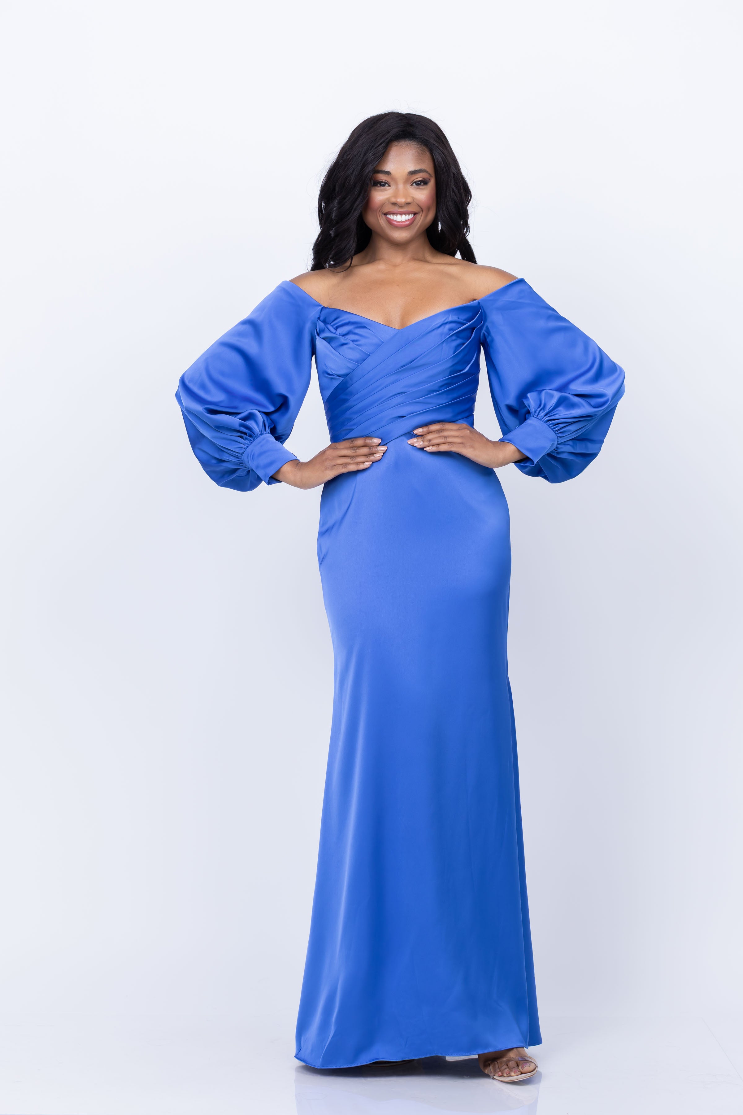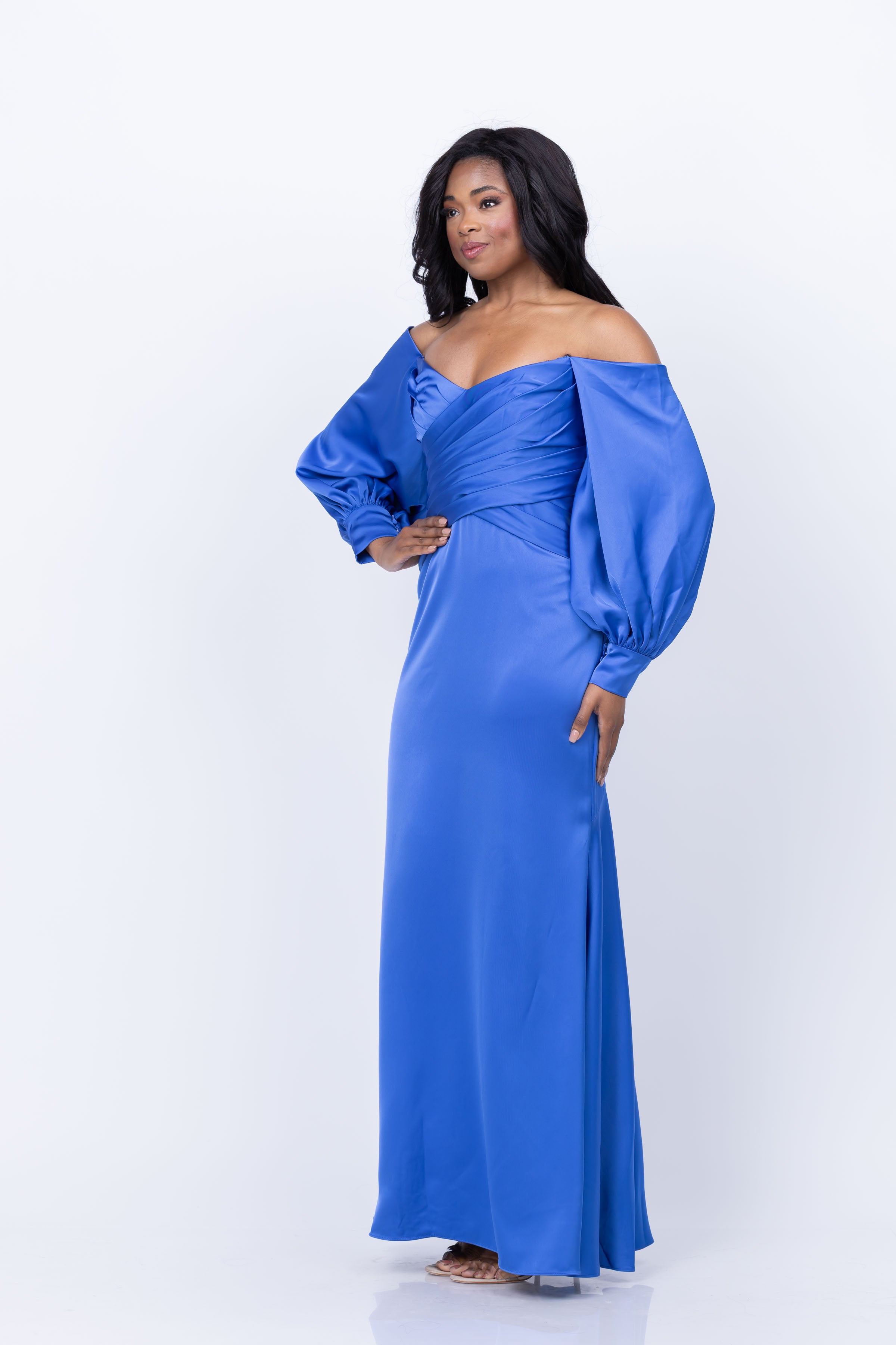 Indulge in timeless allure and captivating beauty with Theia's Milenia Draped Sleeve Gown. The rich cornflower blue hue, romantic off-the-shoulder neckline, and expertly draped bodice make this double-faced satin gown a stunning choice for any occasion. Voluminous sleeves add an extra touch of elegance to this luxurious piece.