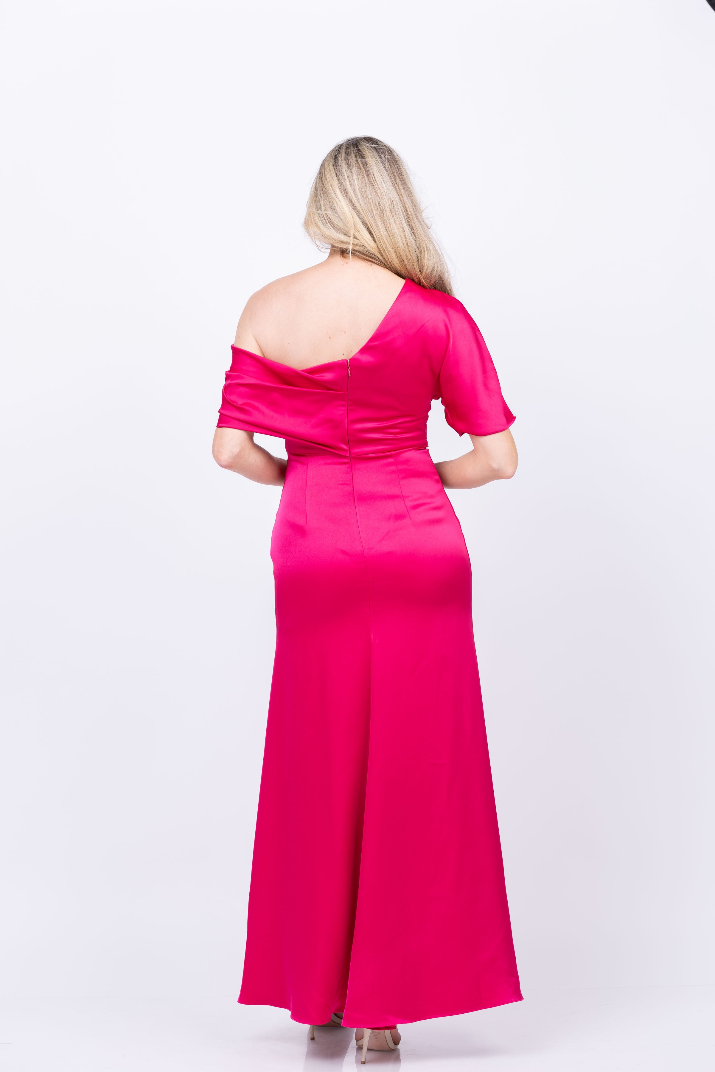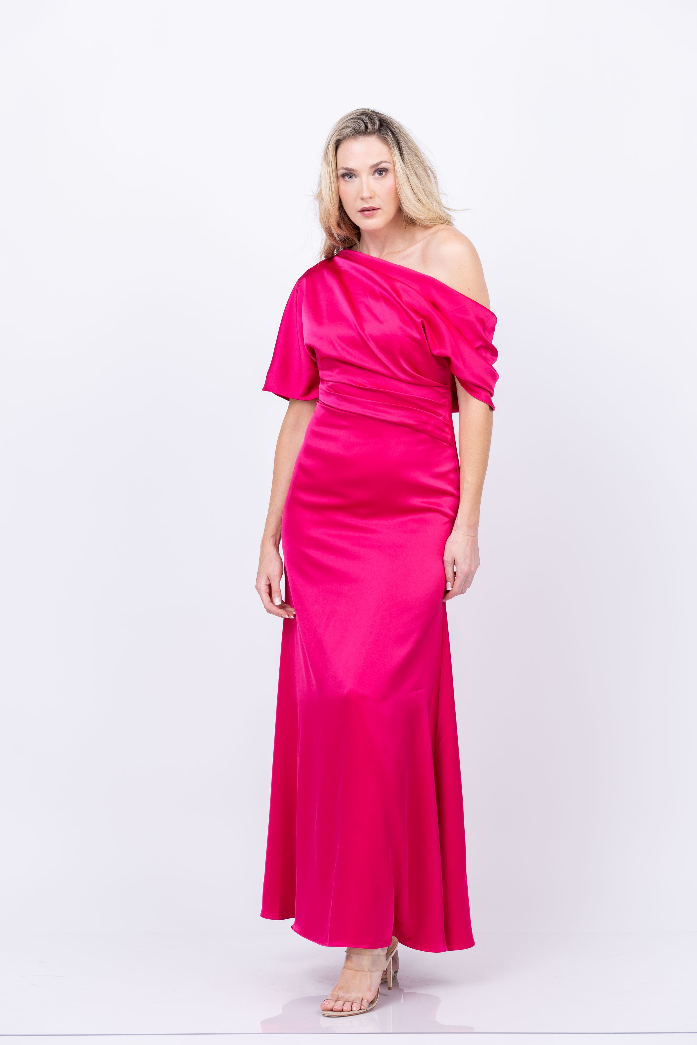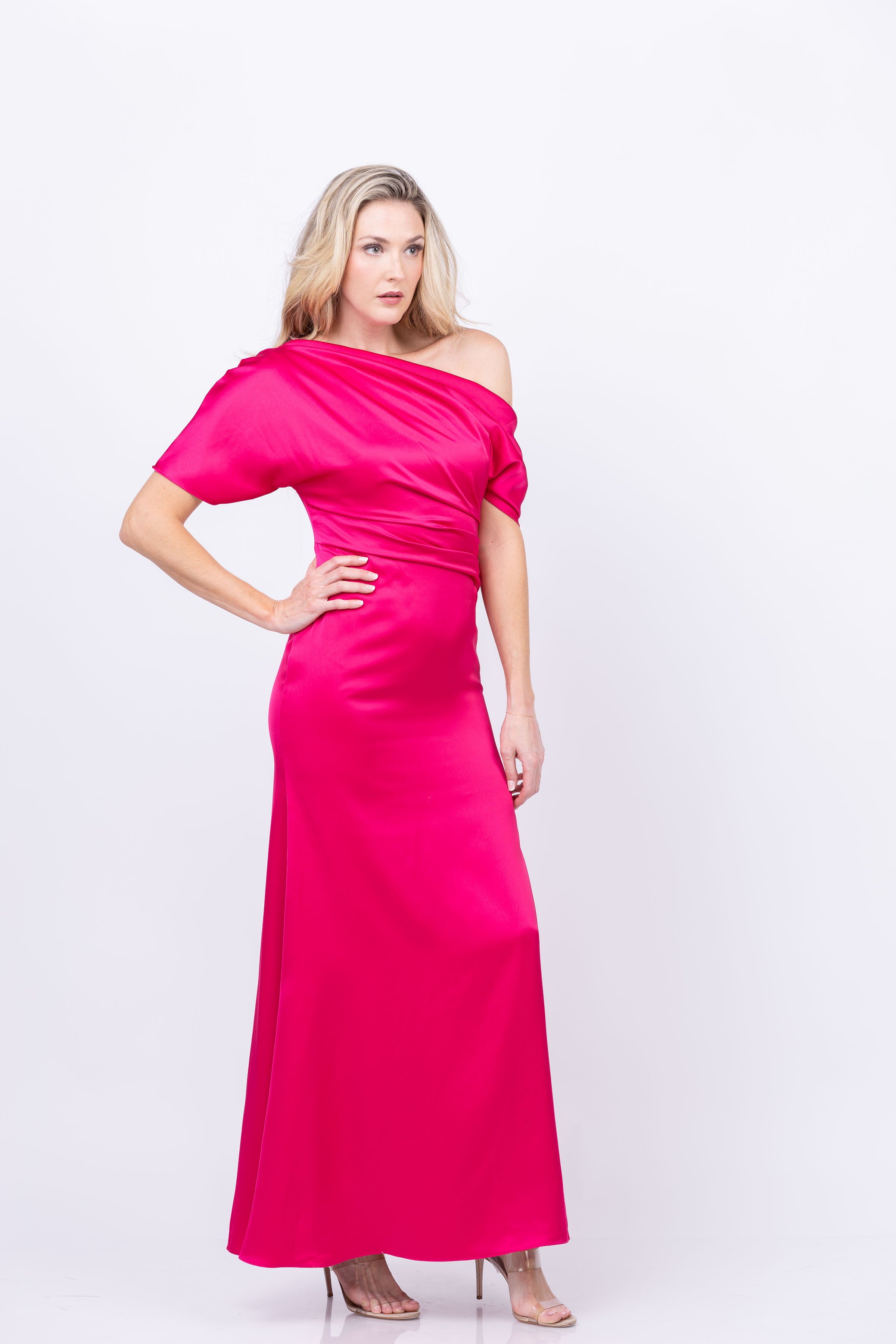 Indulge in luxury and elegance with Theia's Remi Gown. Crafted from double-faced satin, this one shoulder masterpiece accentuates your curves with a flattering fit and flare style. Perfect for a romantic evening, the draped design adds a touch of femininity. Available in passionfruit, you'll be the center of attention.