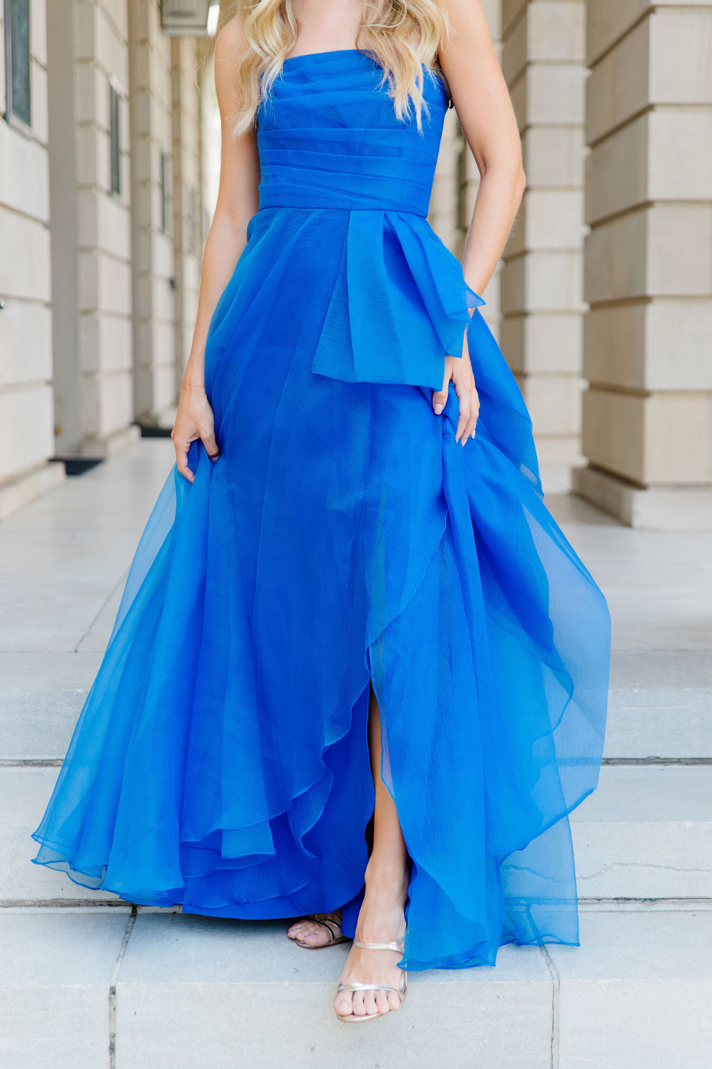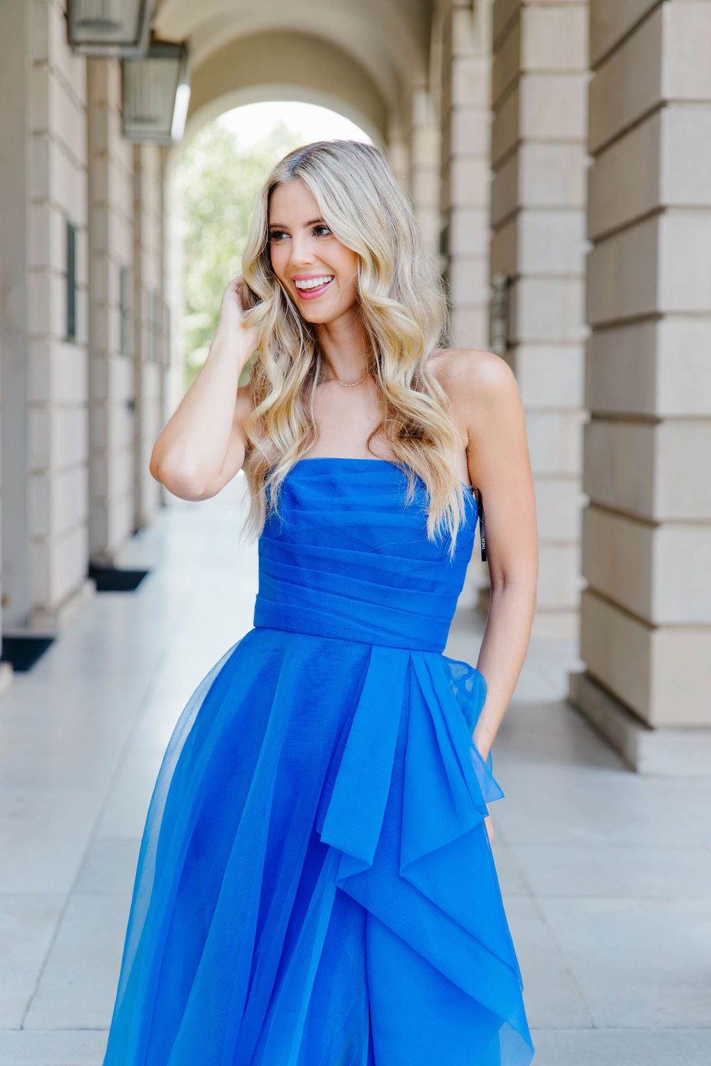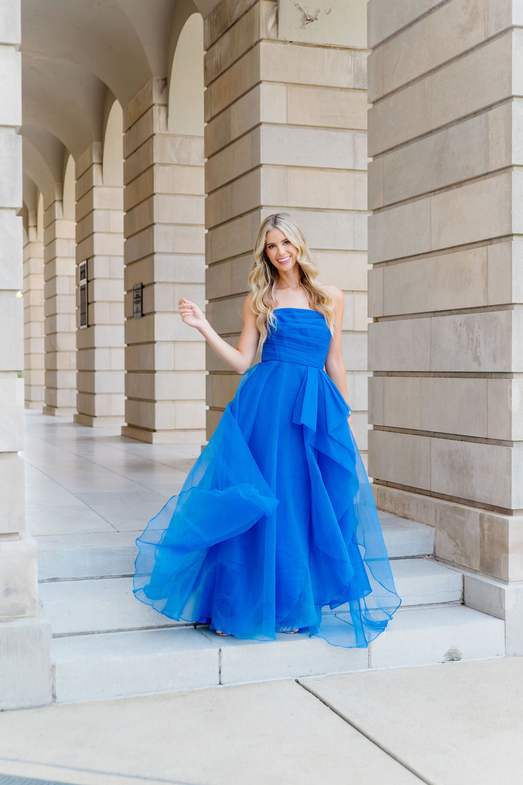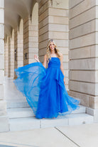 Teresa is crafted from lightweight pebble organza, offering graceful movement and a luxurious feel. This strapless gown features a draped bodice that flatters your silhouette, a front slit for an elegant touch, and a cascading ruffled skirt that adds dynamic flow. Perfect for making a memorable entrance, the Cornflower Blue hue enhances its radiant charm.