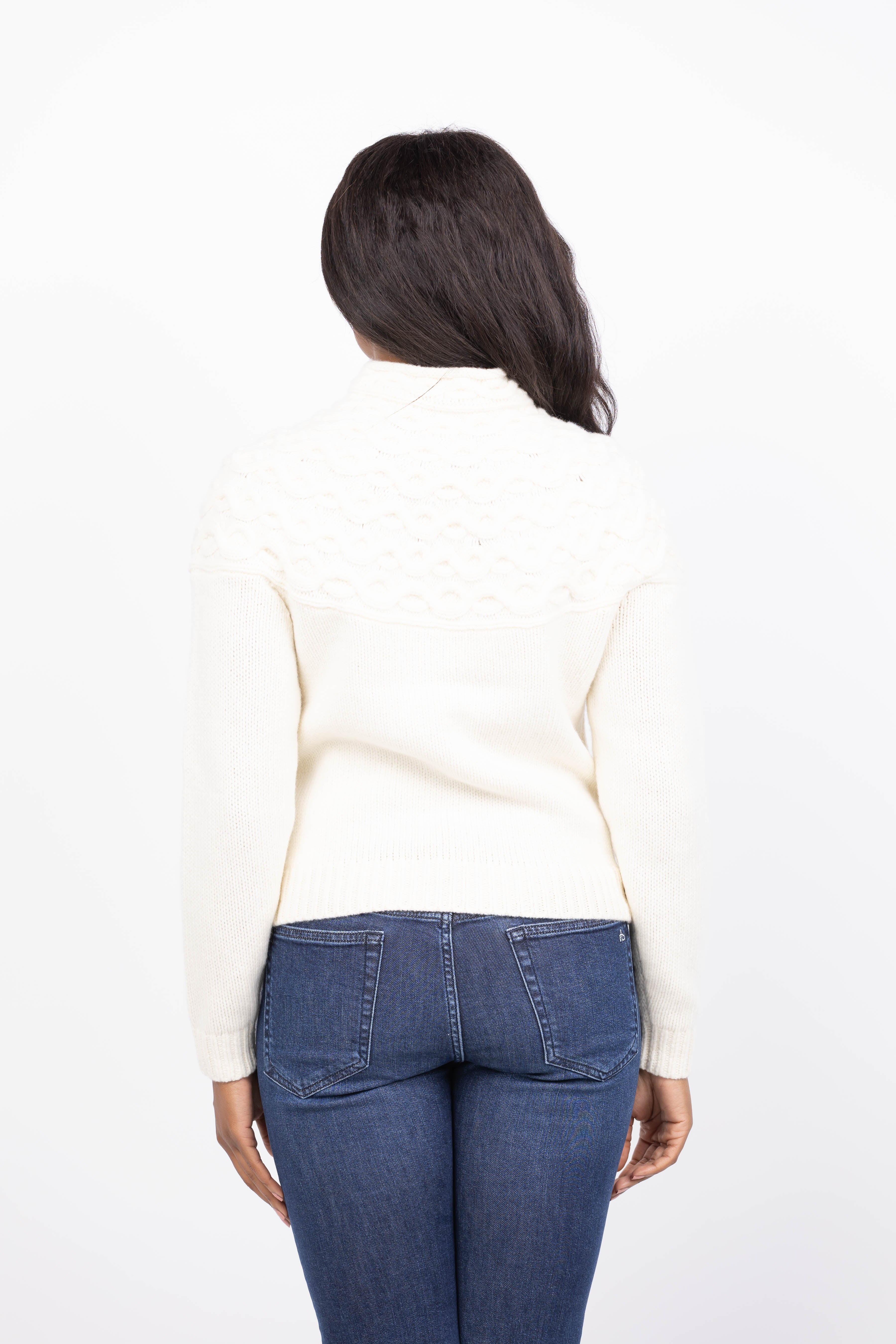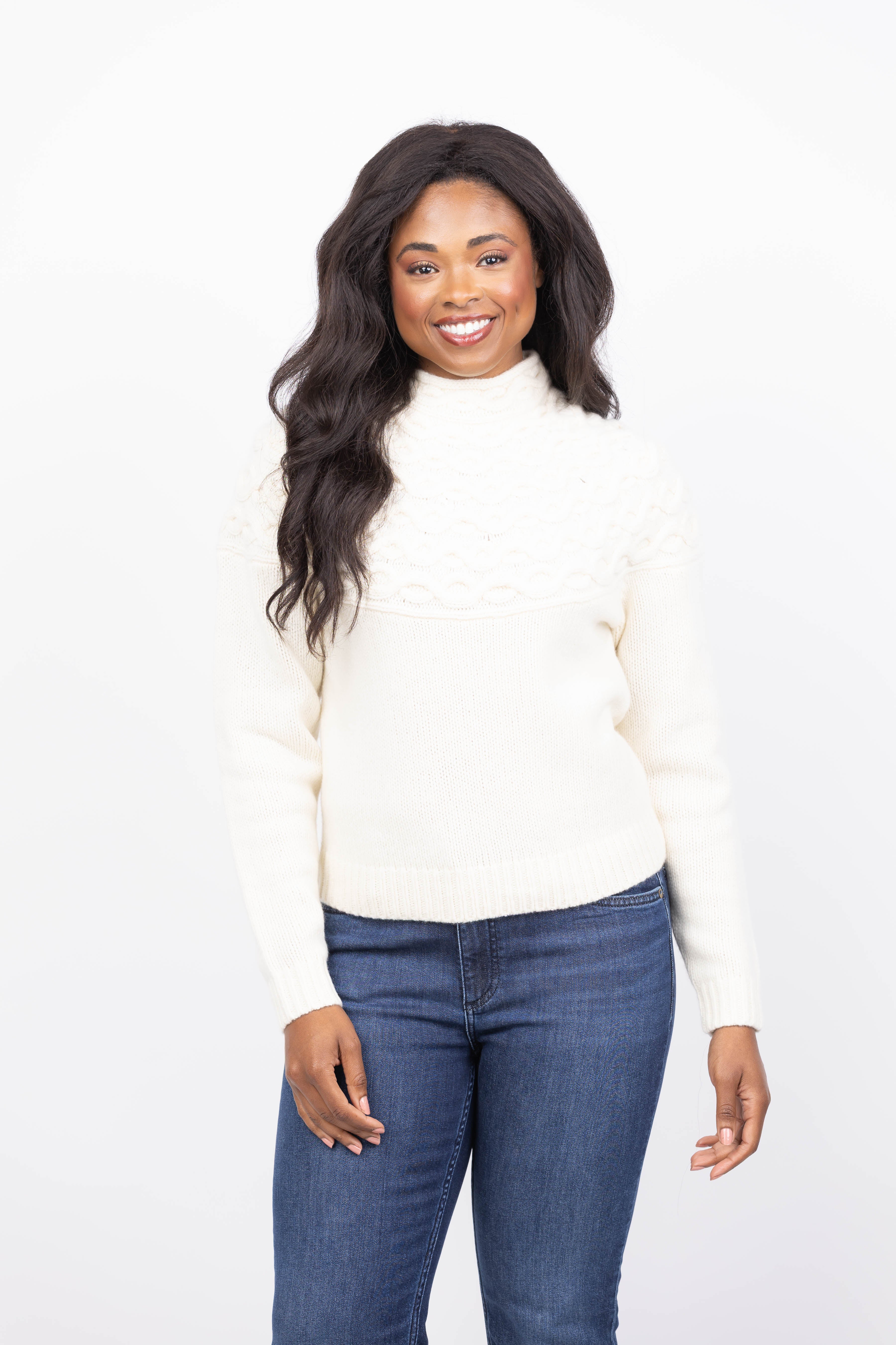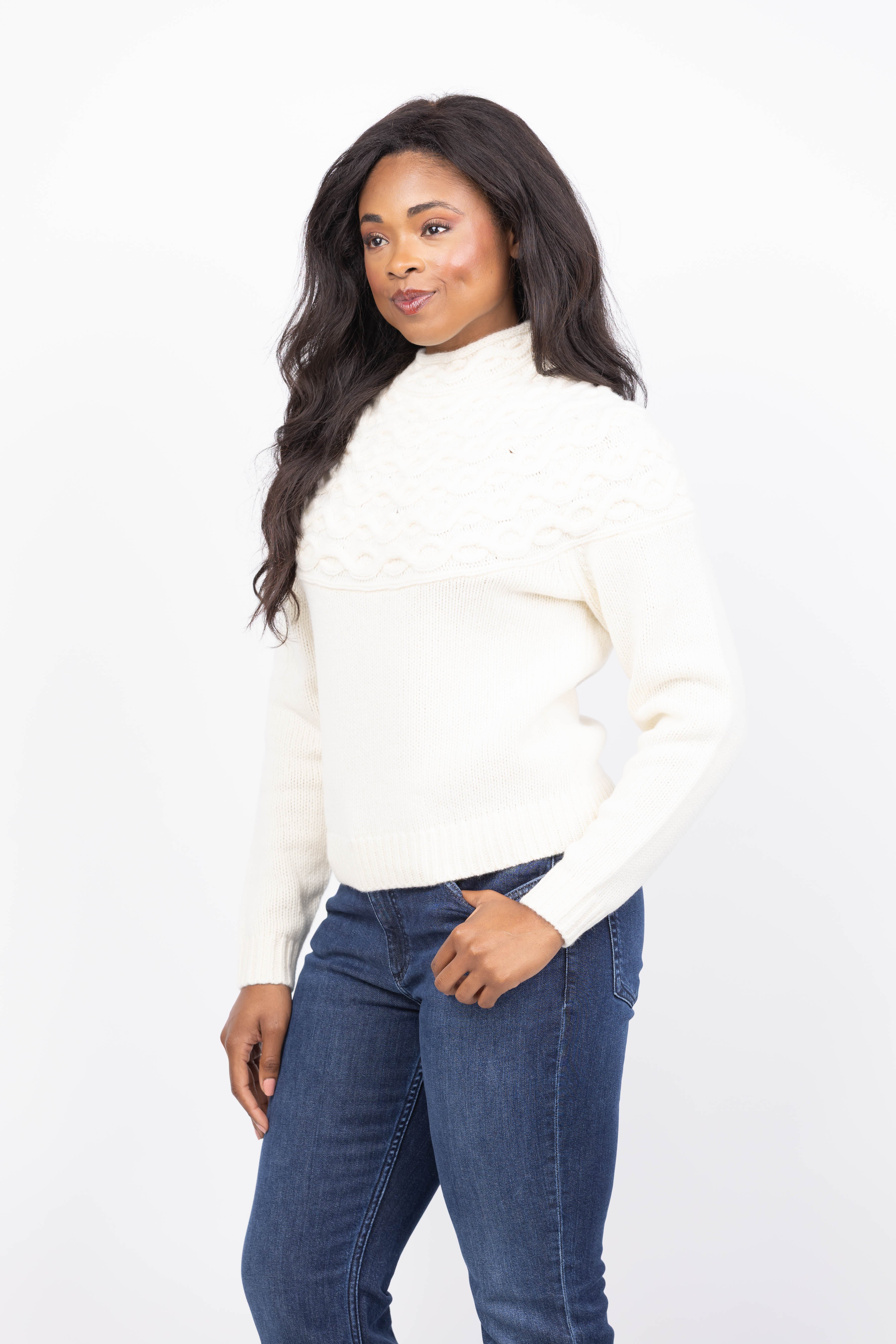 Elevate your everyday wardrobe with this sophisticated cable yoke sweater, crafted from a mid-weight stretch knit that moves with you throughout the day. The striking cable knit yoke adds visual interest and dimension, while ribbed trim and a classic mock neck create a polished, refined silhouette. Long sleeves provide versatile layering potential, making this piece perfect for transitional seasons or year-round styling. The subtle stretch ensures comfort without compromising the structured, tailored look that makes this sweater a timeless closet essential.