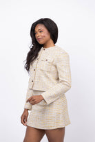 Elevate your wardrobe with the Theory Cardigan Jacket in Spice Multi, a sophisticated cropped tan tweed jacket that blends classic texture with modern style. Its tailored fit and warm tones make it perfect for layering, adding both warmth and refinement to any outfit. Ideal for dressing up your casual looks or complementing professional attire, this jacket offers timeless elegance and versatile wearability.
