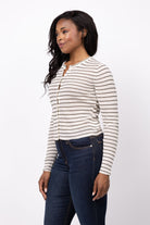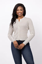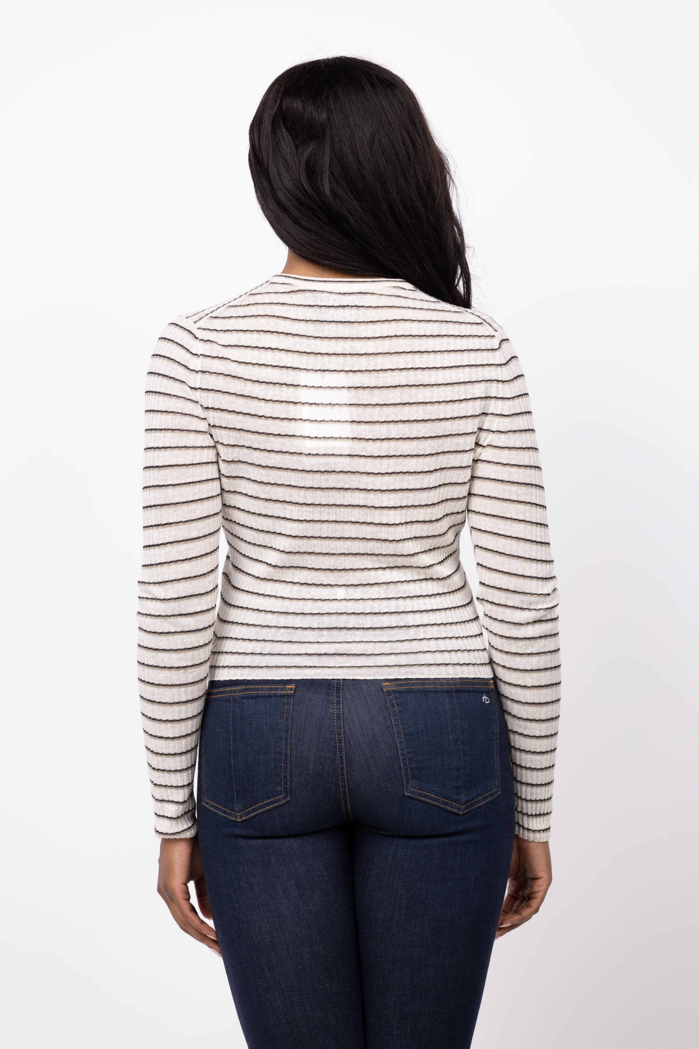 Elevate your wardrobe with the Theory Crop Cardigan in Light Parchment. Made with European-sourced linen and responsibly forested wood pulp, this striped crewneck cardigan is a luxurious essential. Its slightly cropped, waist-length design and long sleeves add a touch of elegance to any outfit.