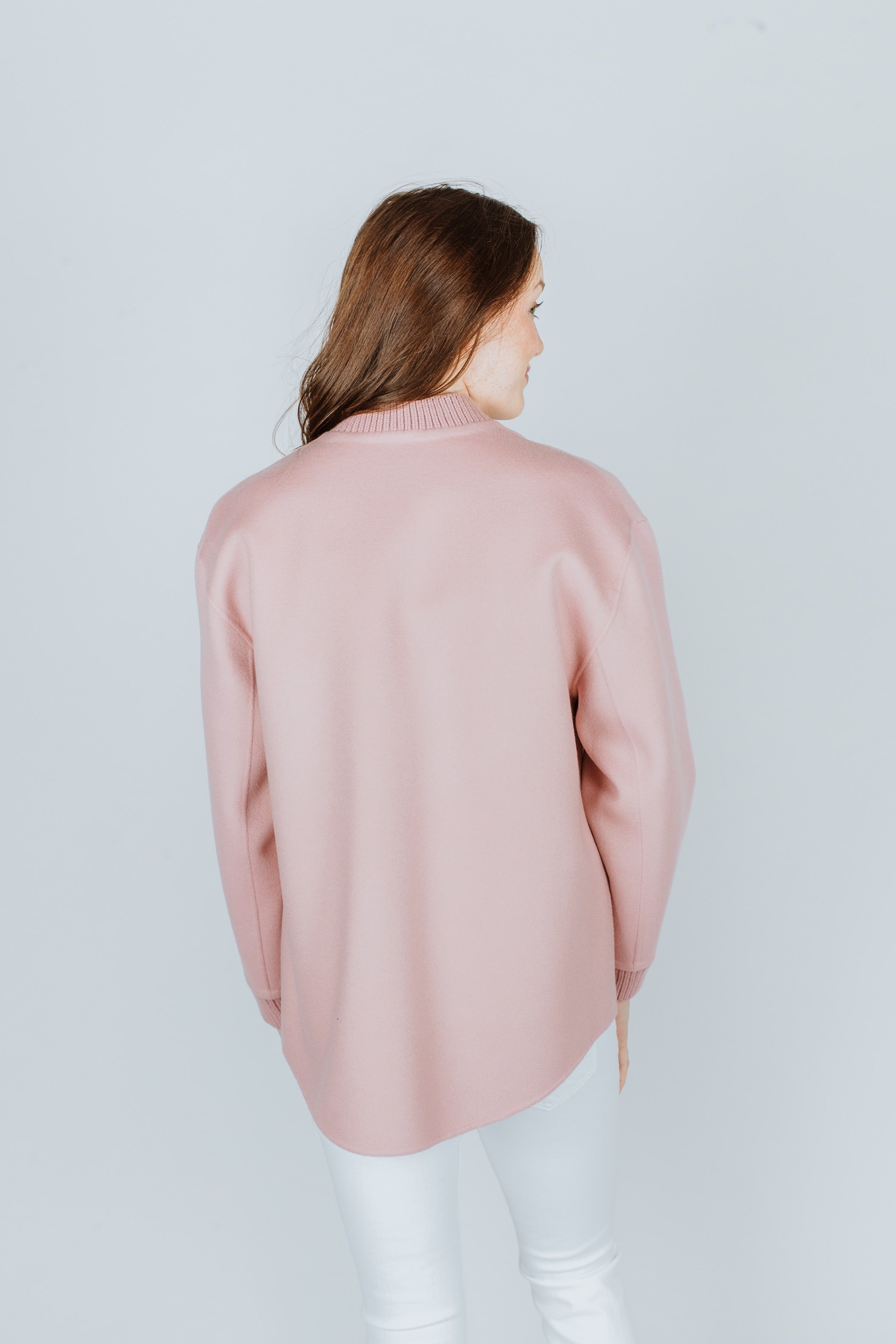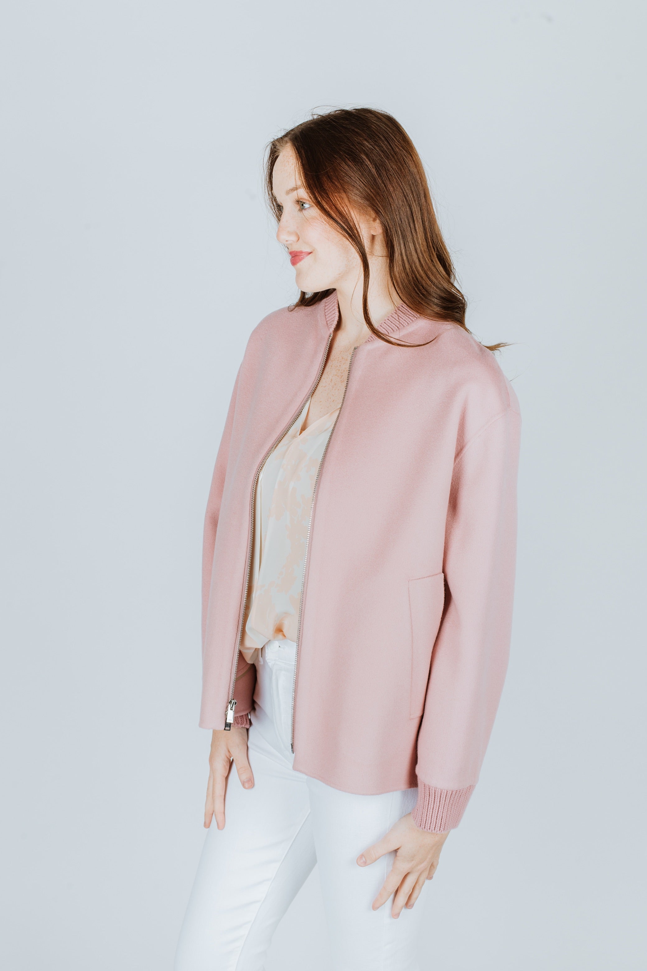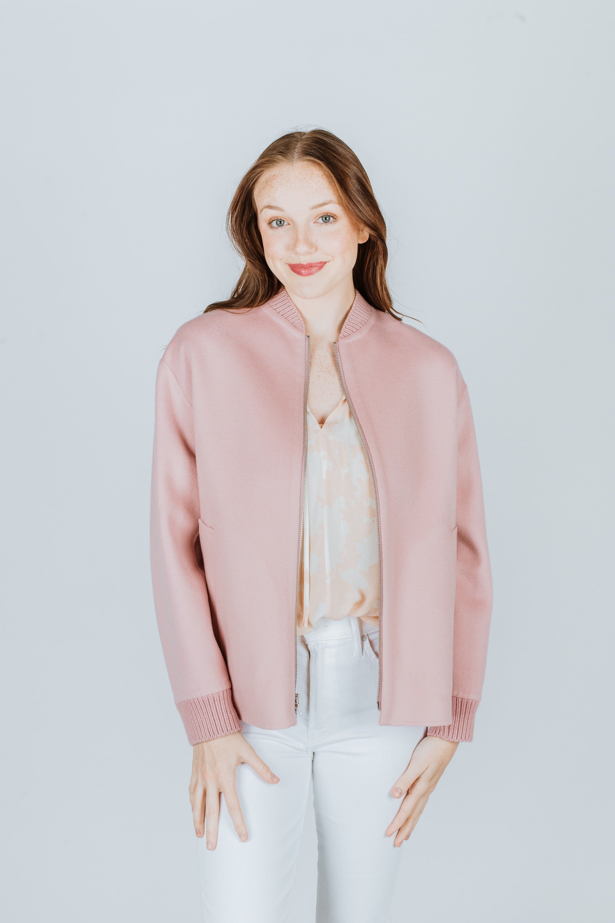 Theory double-face bomber jacket with welt side pockets Baseball collar; two-way zip front Long sleeves Oversized fit Ribbed trim Wool/cashmere Imported