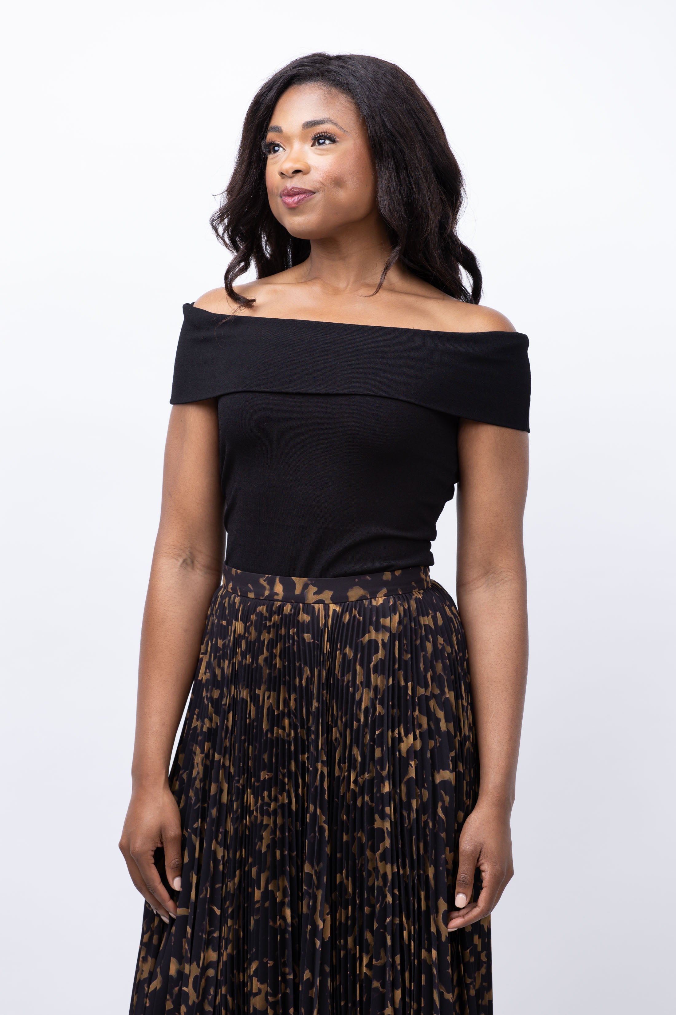 Introducing the Theory Drape Off-the-Shoulder Top in Black. With a straight neck and off-the-shoulder sleeves, this top offers a versatile and stylish look. Made with certified wood-based materials, feel good about your fashion choices while looking chic. Effortlessly slip on this pullover top and elevate your wardrobe.