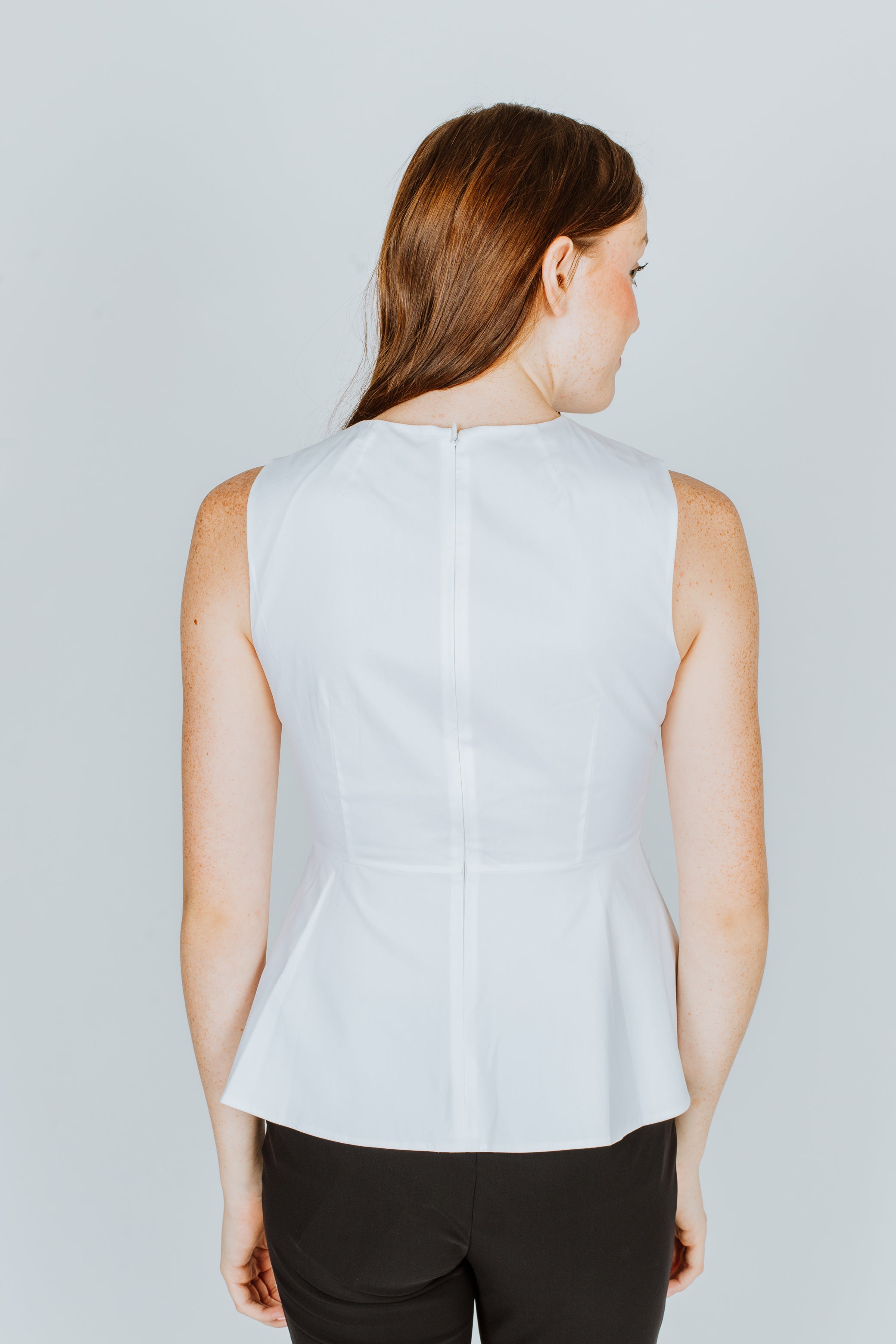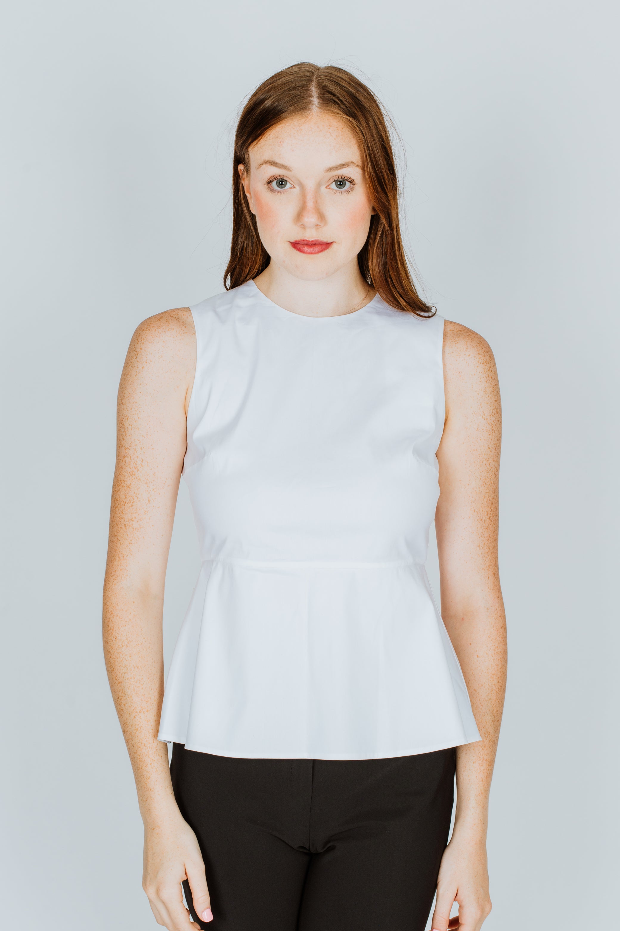 Theory's sleeveless top is crafted of a cotton blend, featuring a round neck and peplum waist.