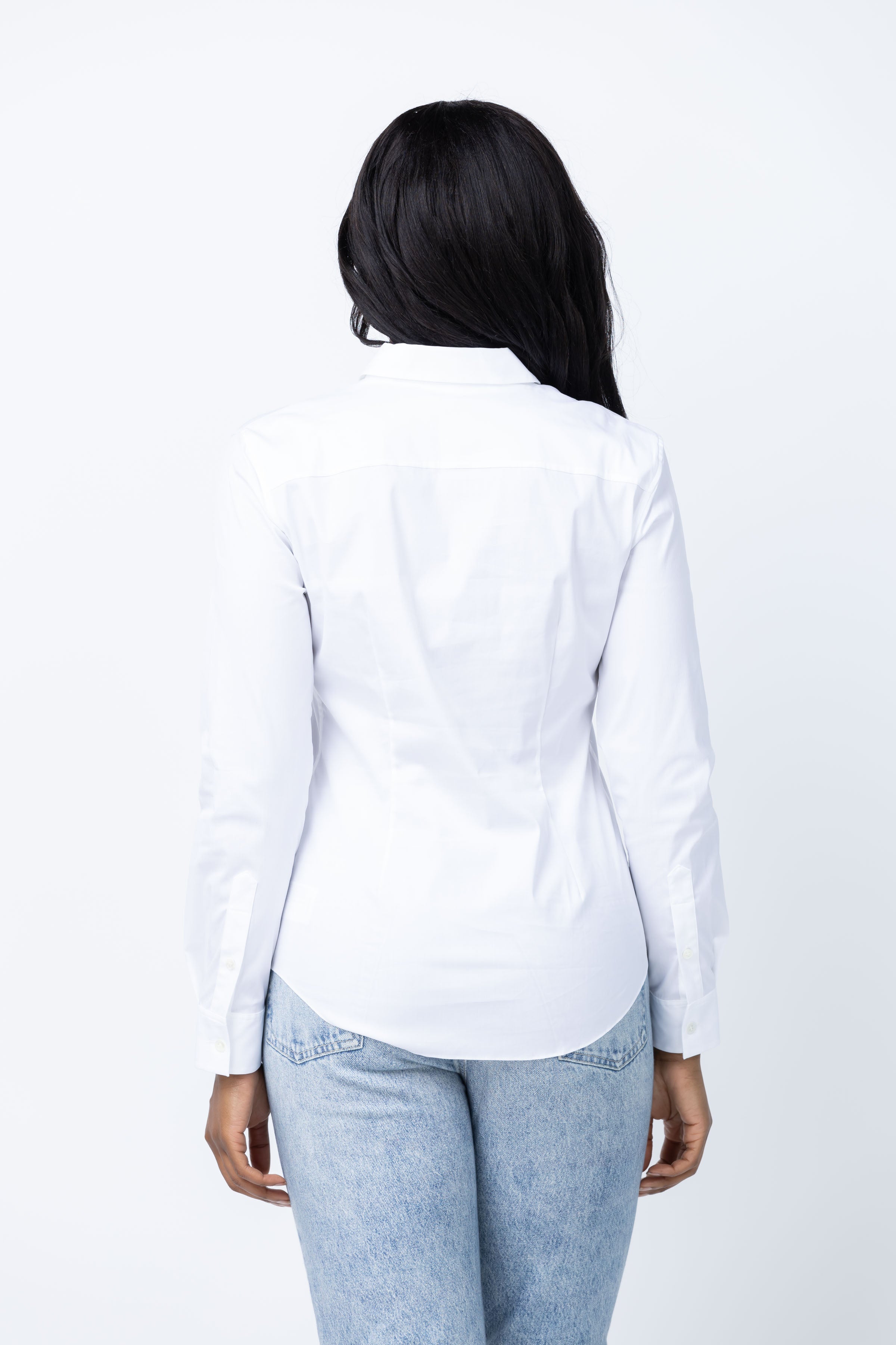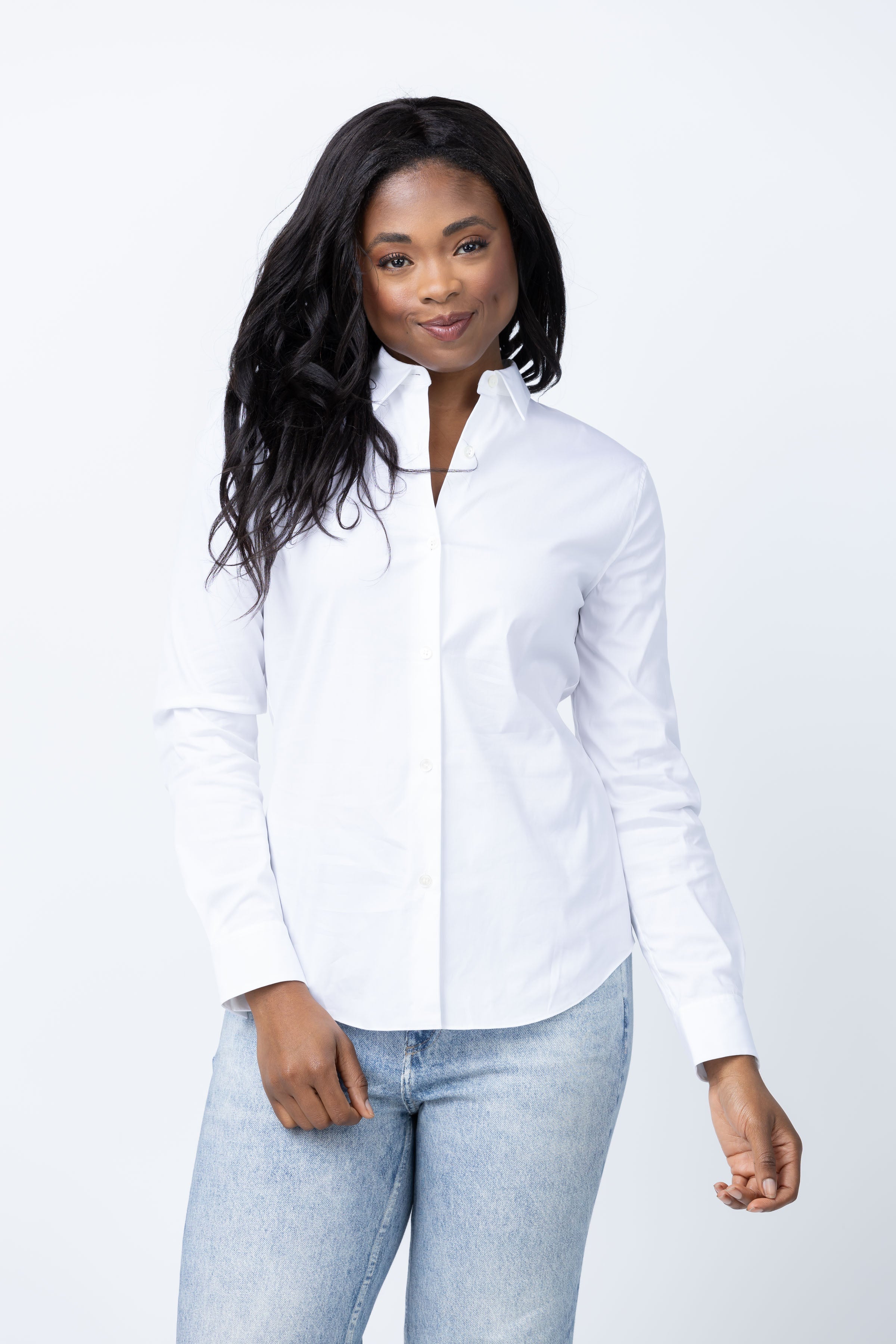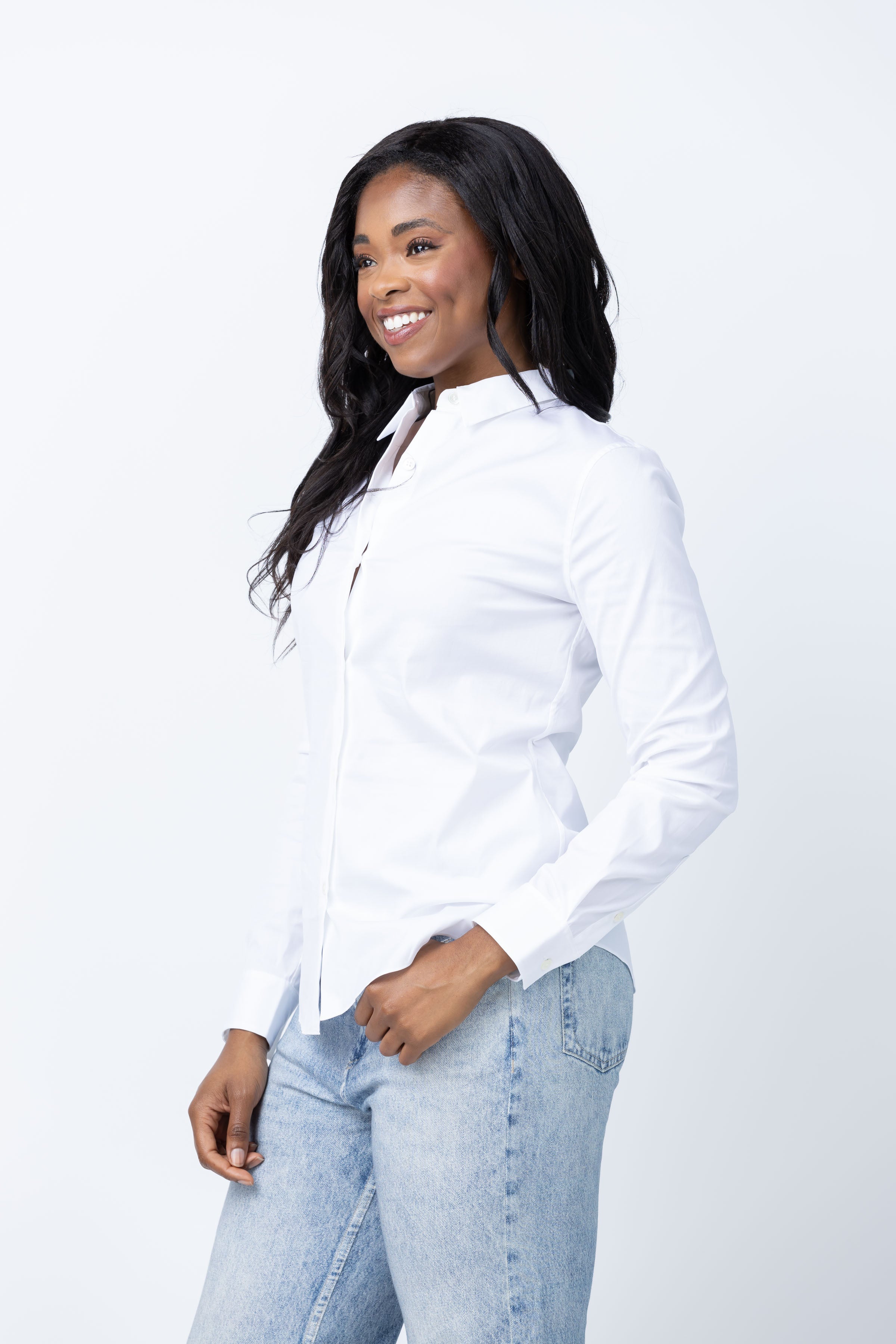 This borrowed-from-the-boys shirt effortlessly combines modern androgyny with a stretch cotton fabric. The point collar, long sleeves, and button cuffs add classic charm, while the exposed button front and shirttail hem bring a touch of playfulness. Take your style to the next level with this Theory Tenia Button Up Shirt in White.