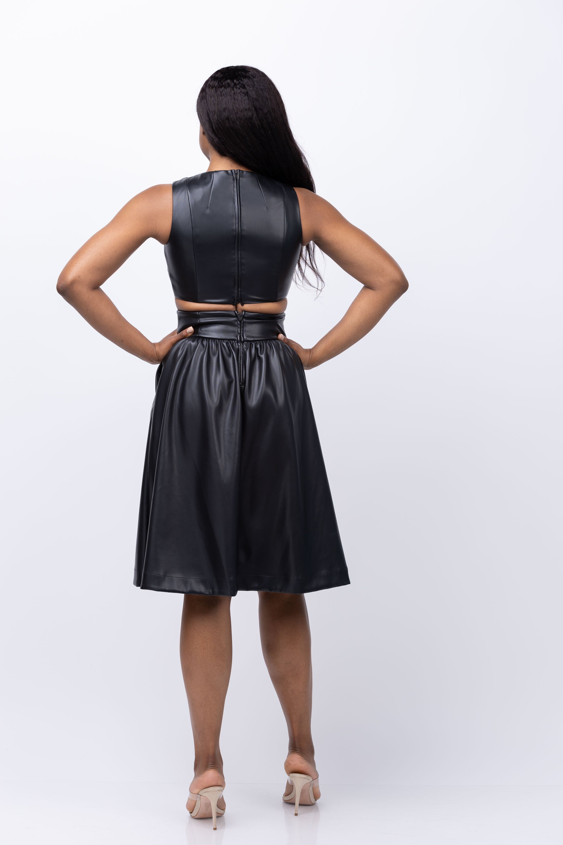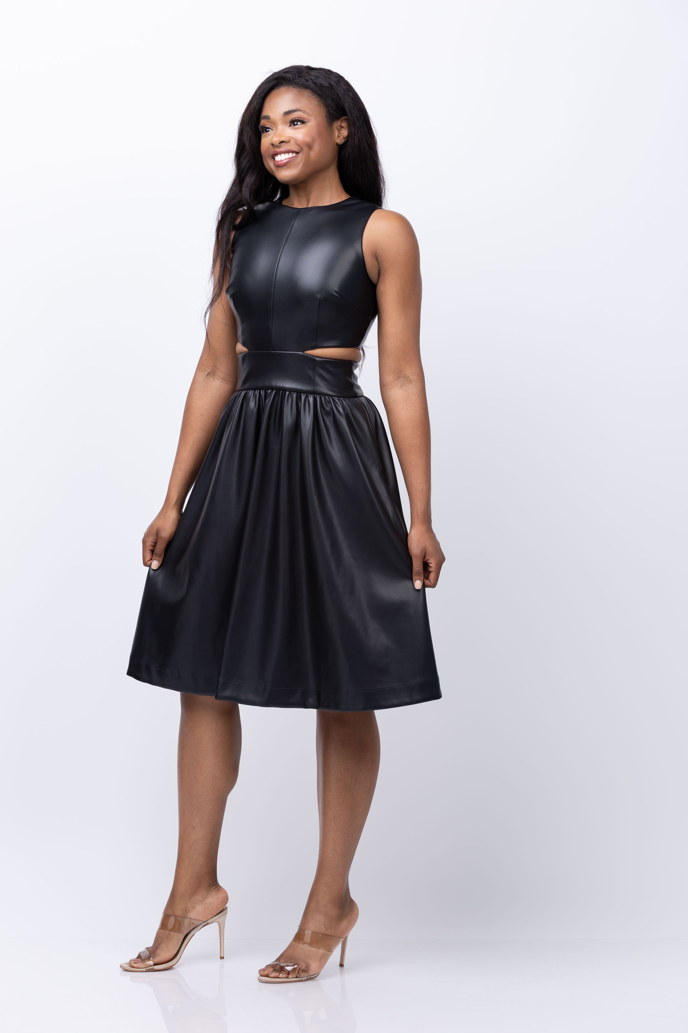 Turn up the edge in Toccin's Brit dress! With sleek faux leather and flirty cutouts, this fit-and-flare design is perfect for a night out. Features a center seam for added style. Time to show off your daring side!