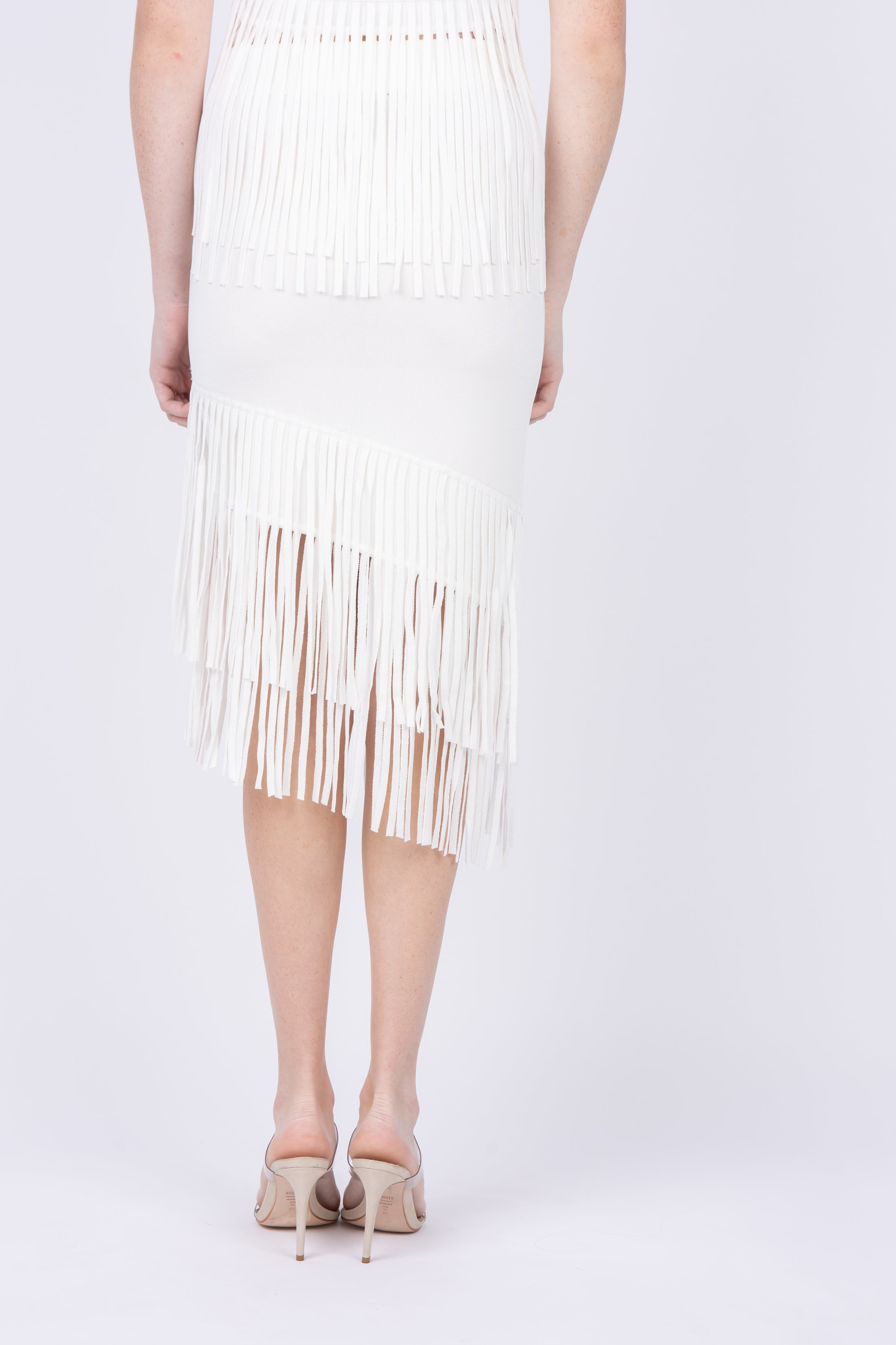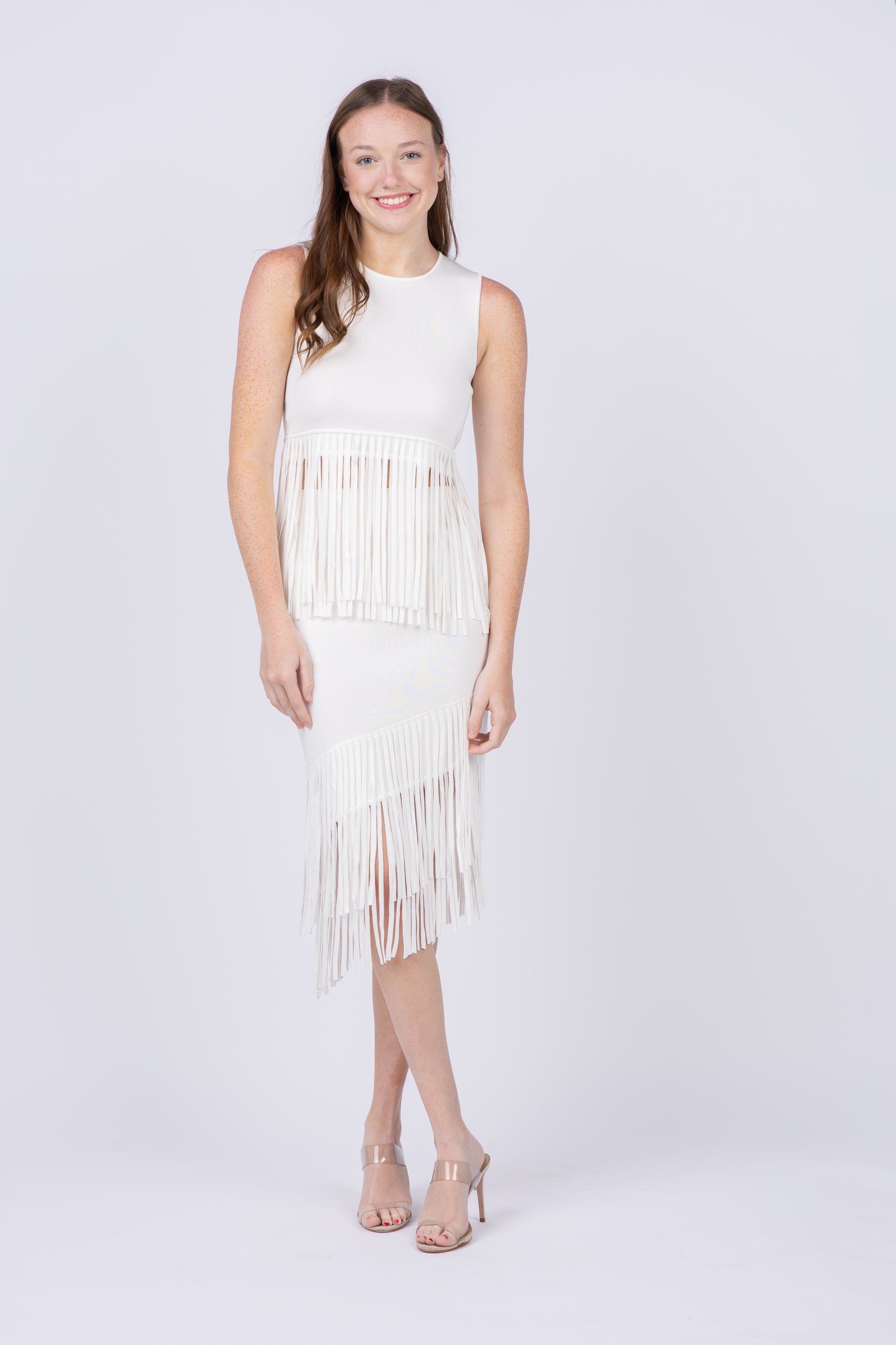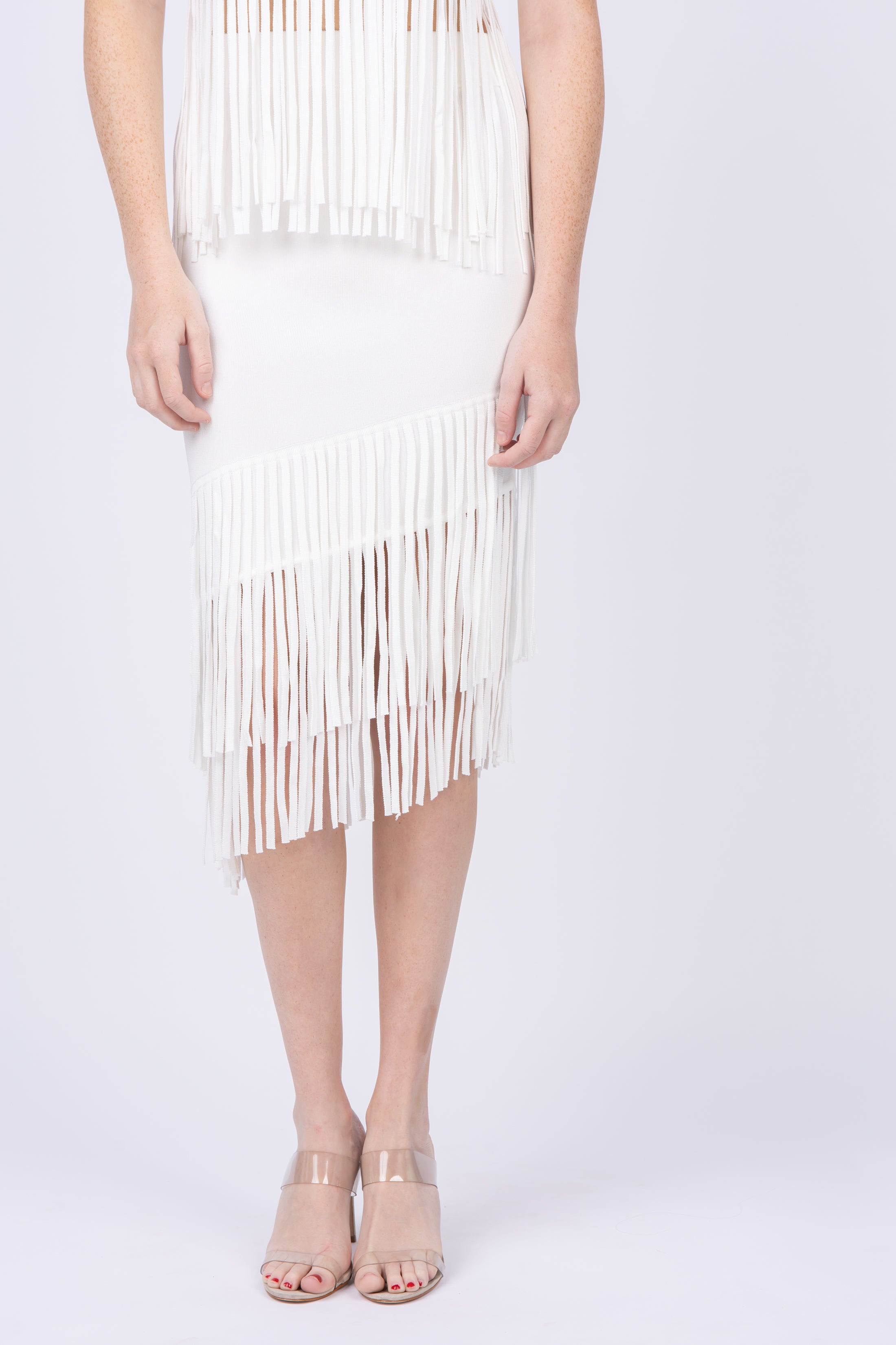 Dance the night away with the Toccin Hazel Fringe Skirt! This amazing knit skirt features a flattering asymmetric fringe hem, so you can show off your moves and make an unforgettable impression. Its eye-catching Optic hue pairs well with any look. Pair with the Scarlett Sleeveless Fringe Top for the matching look.