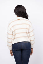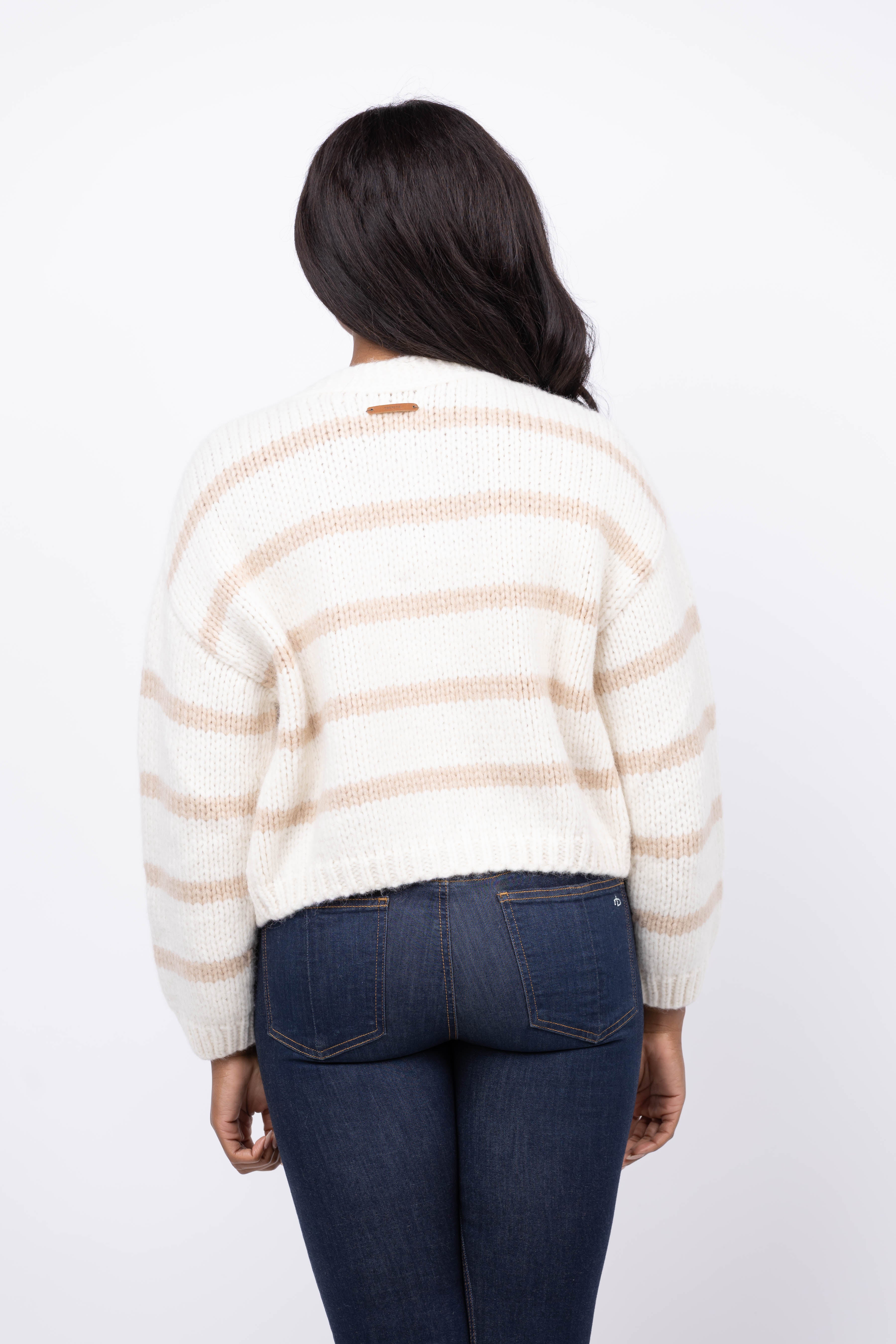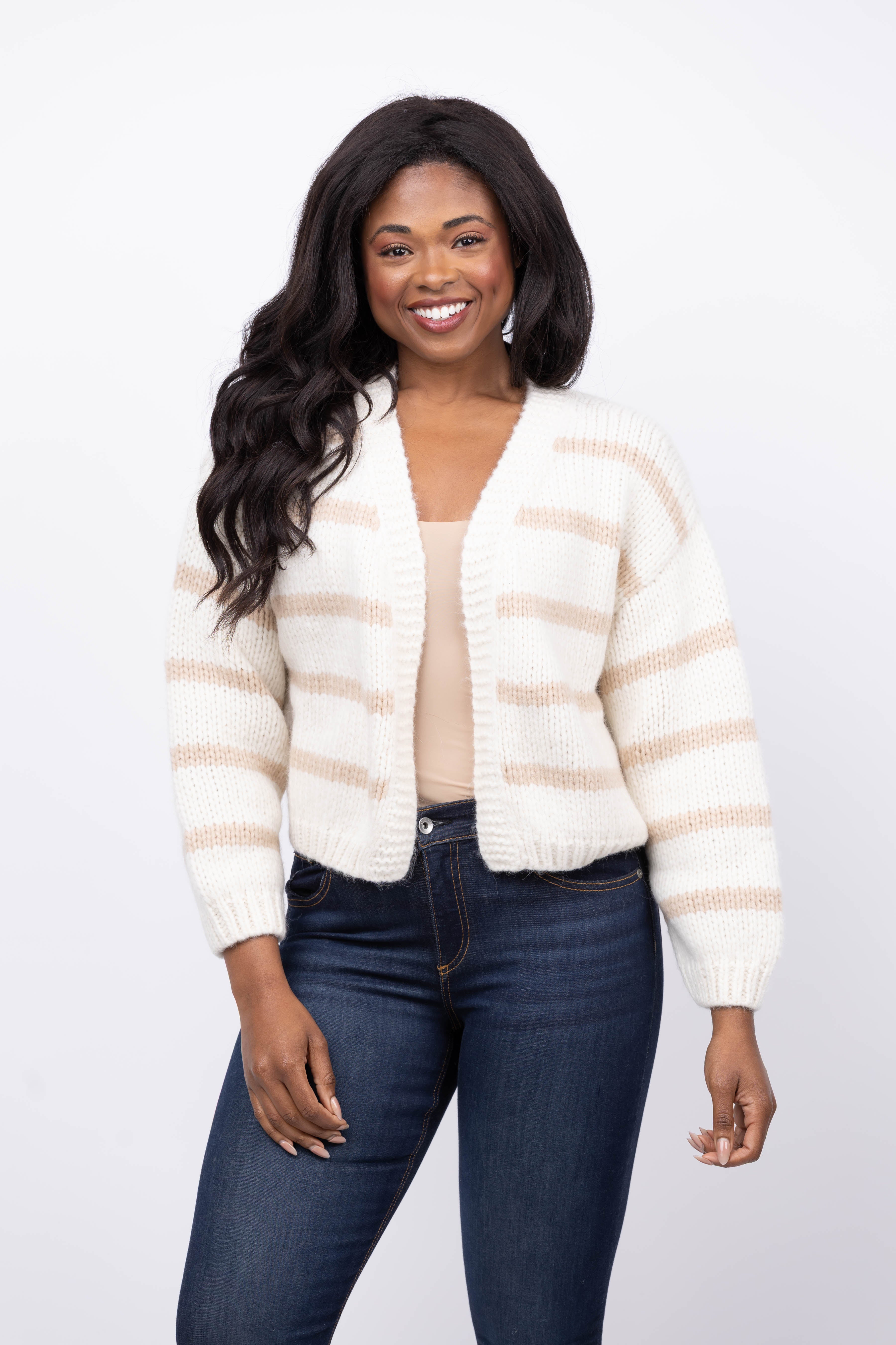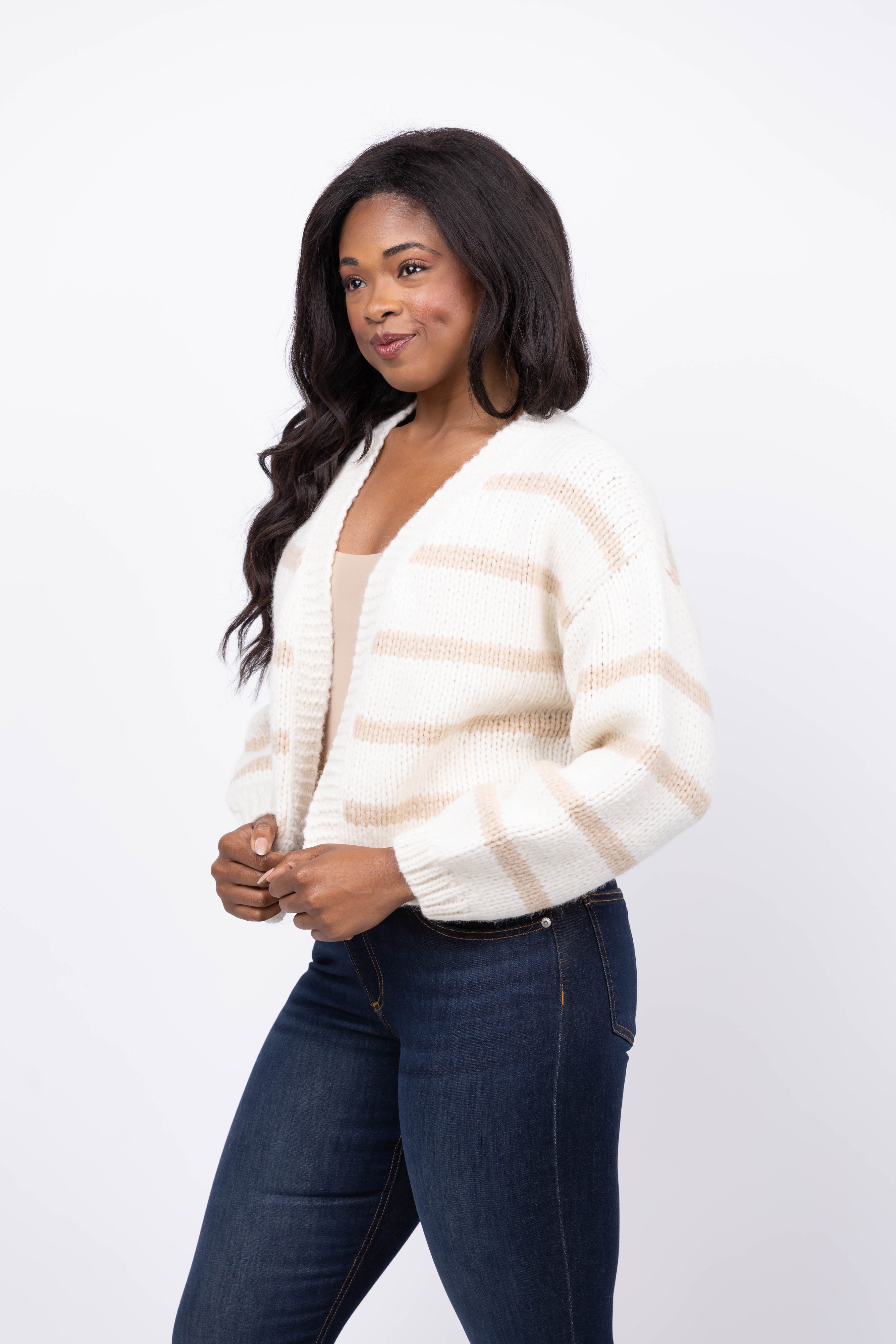 The Trovata Arlowe Cardigan in Antique White Stripe offers cozy softness with its alpaca wool blend. This loosely knitted open-front cardigan features a slightly cropped length, dropped shoulders, and full sleeves for a relaxed, effortlessly stylish look. Perfect for layering, it adds warmth and casual elegance to any outfit.