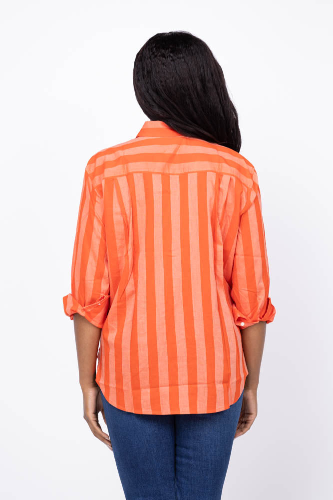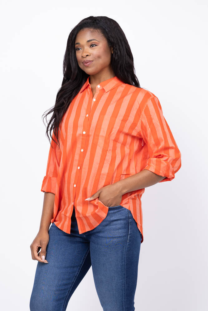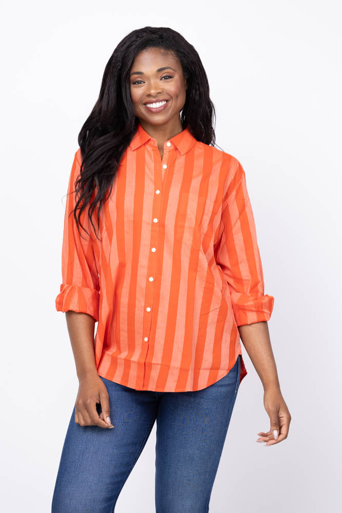 The Trovata Blake Oversized Shirt in Tonal Stripe is designed for lasting comfort and style. Its relaxed boyfriend fit offers effortless layering, while antique white buttons and a single chest pocket add classic details. Made from a soft cotton viscose blend, this shirt becomes more comfortable with every wash, making it a timeless wardrobe staple you'll reach for season after season.