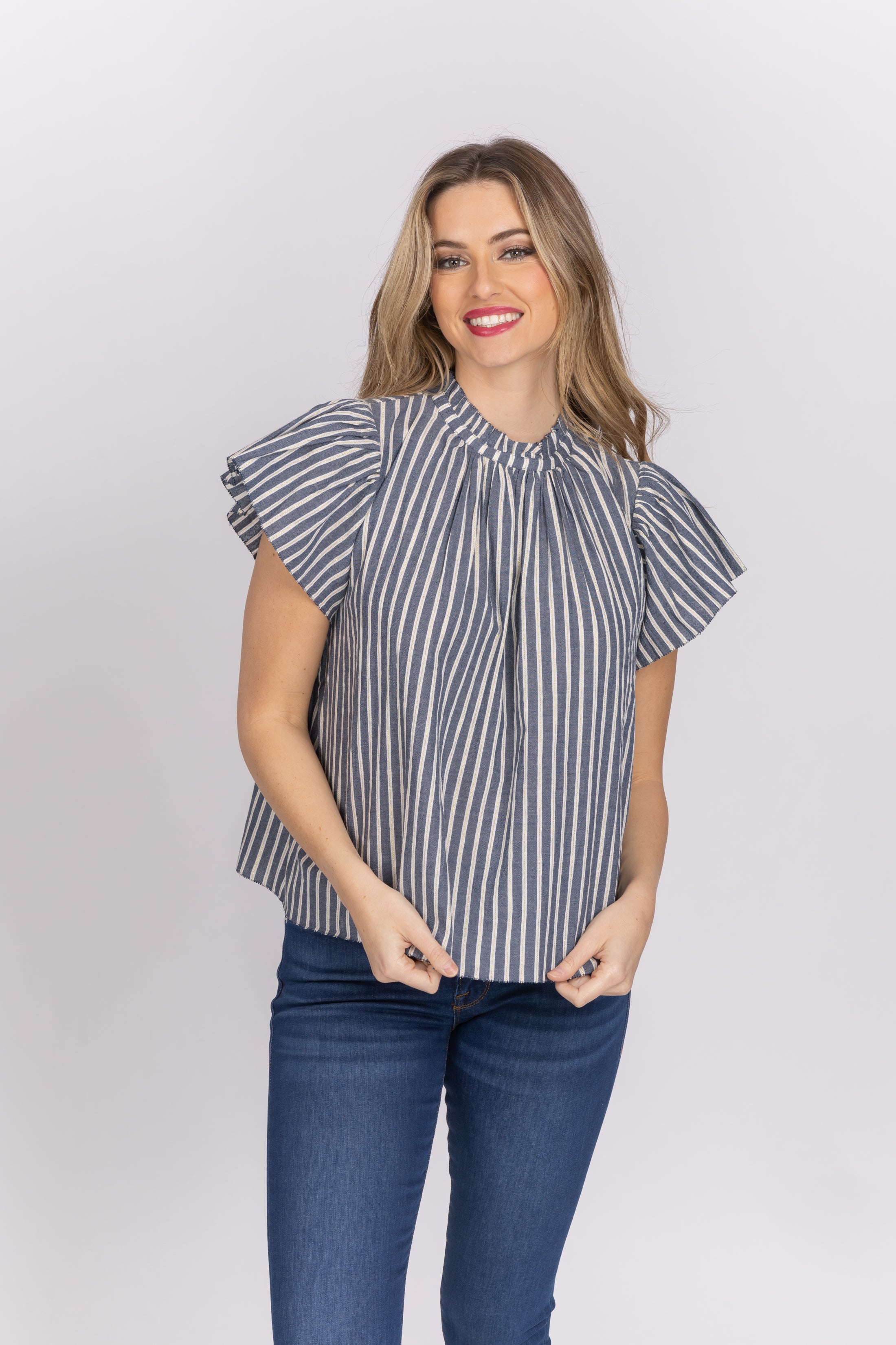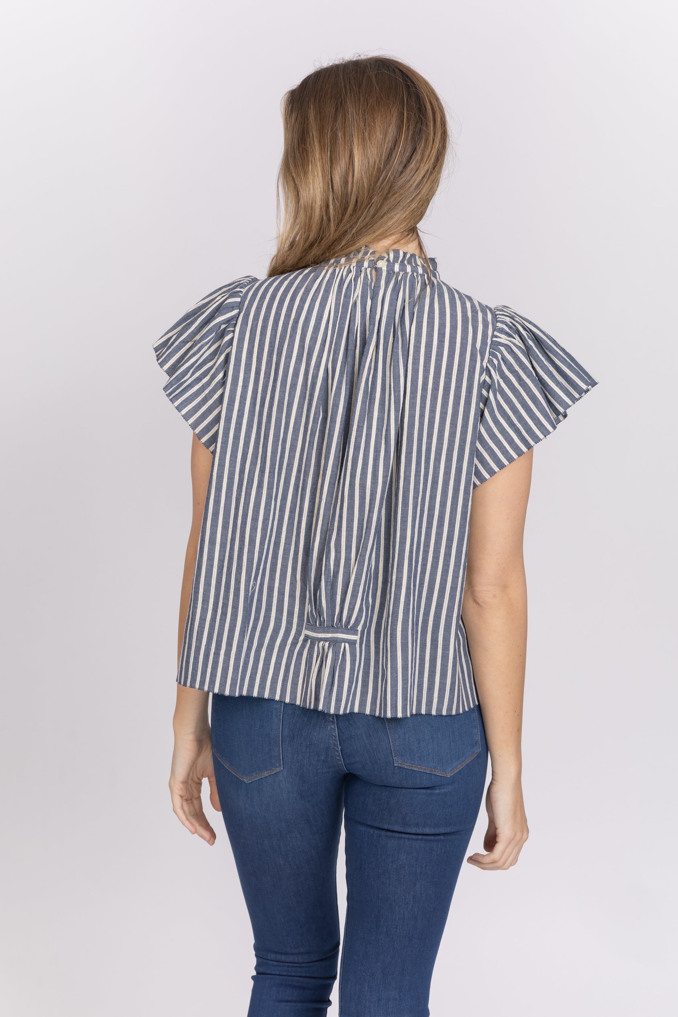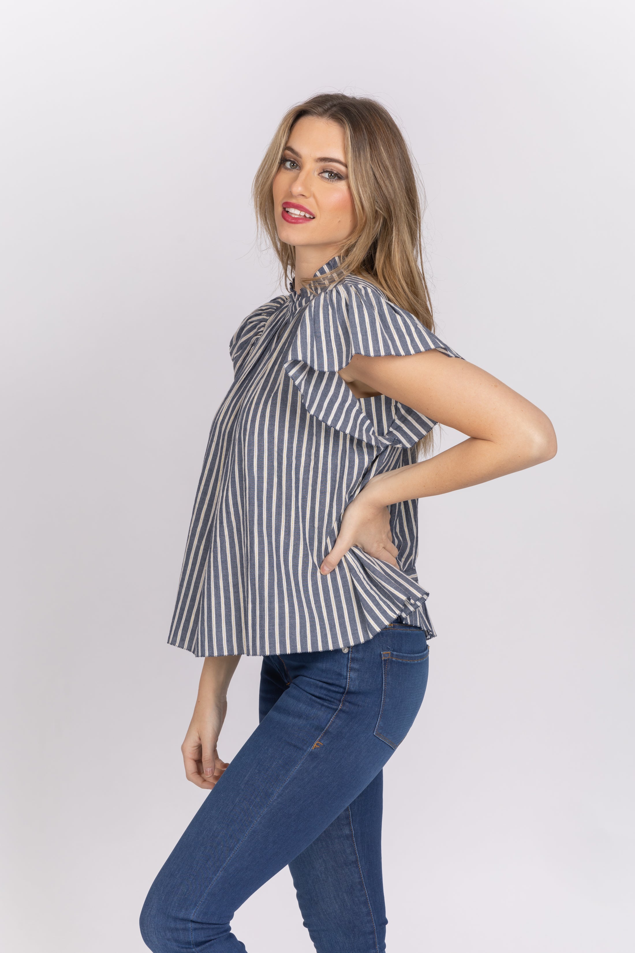 The Carla High Neck Blouse is a favorite go to femme shirt. We love the high neck ruffled collar and wide ruffle sleeves with quaint trim detail along the hem lines. Finished with single back neck button.