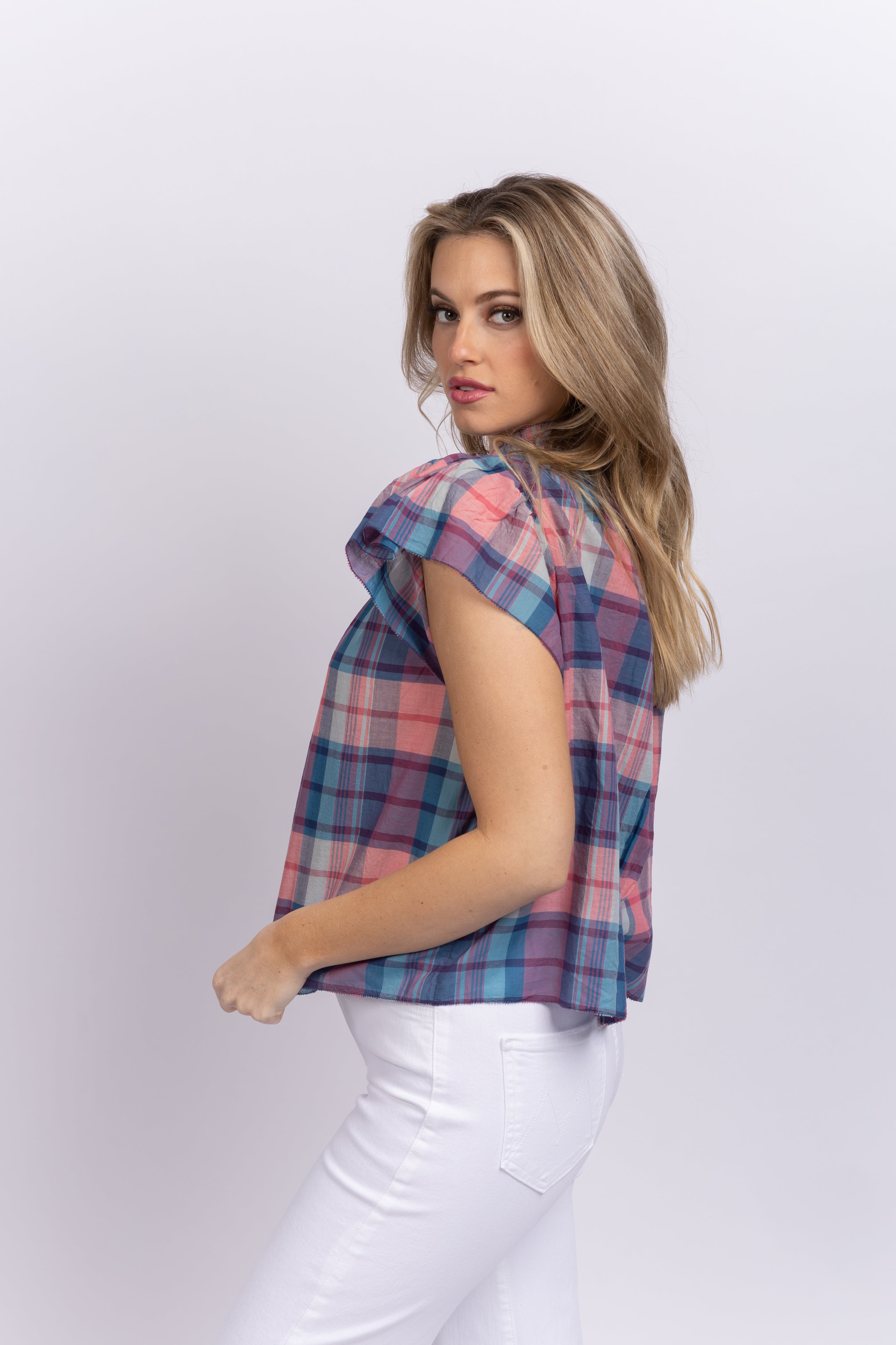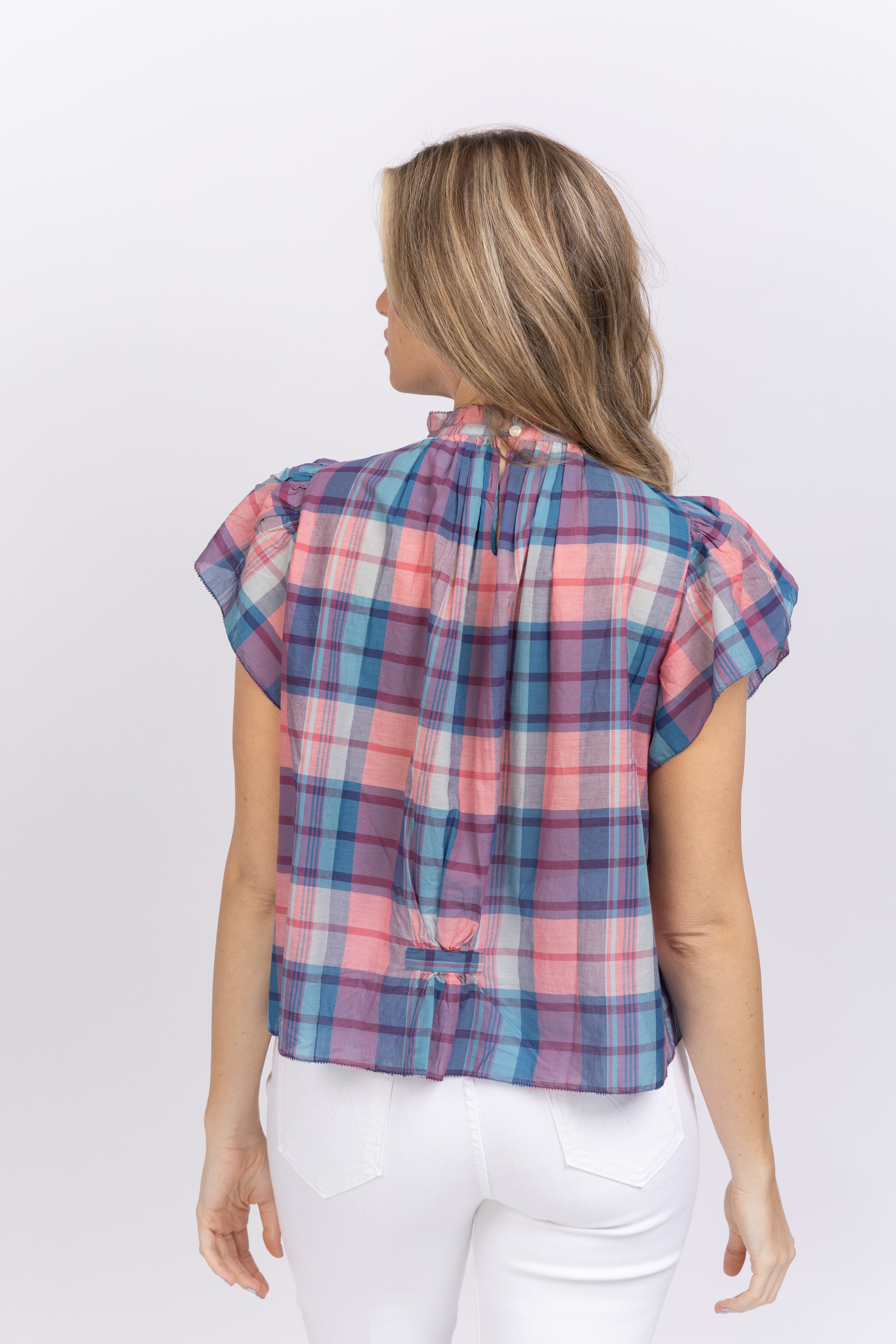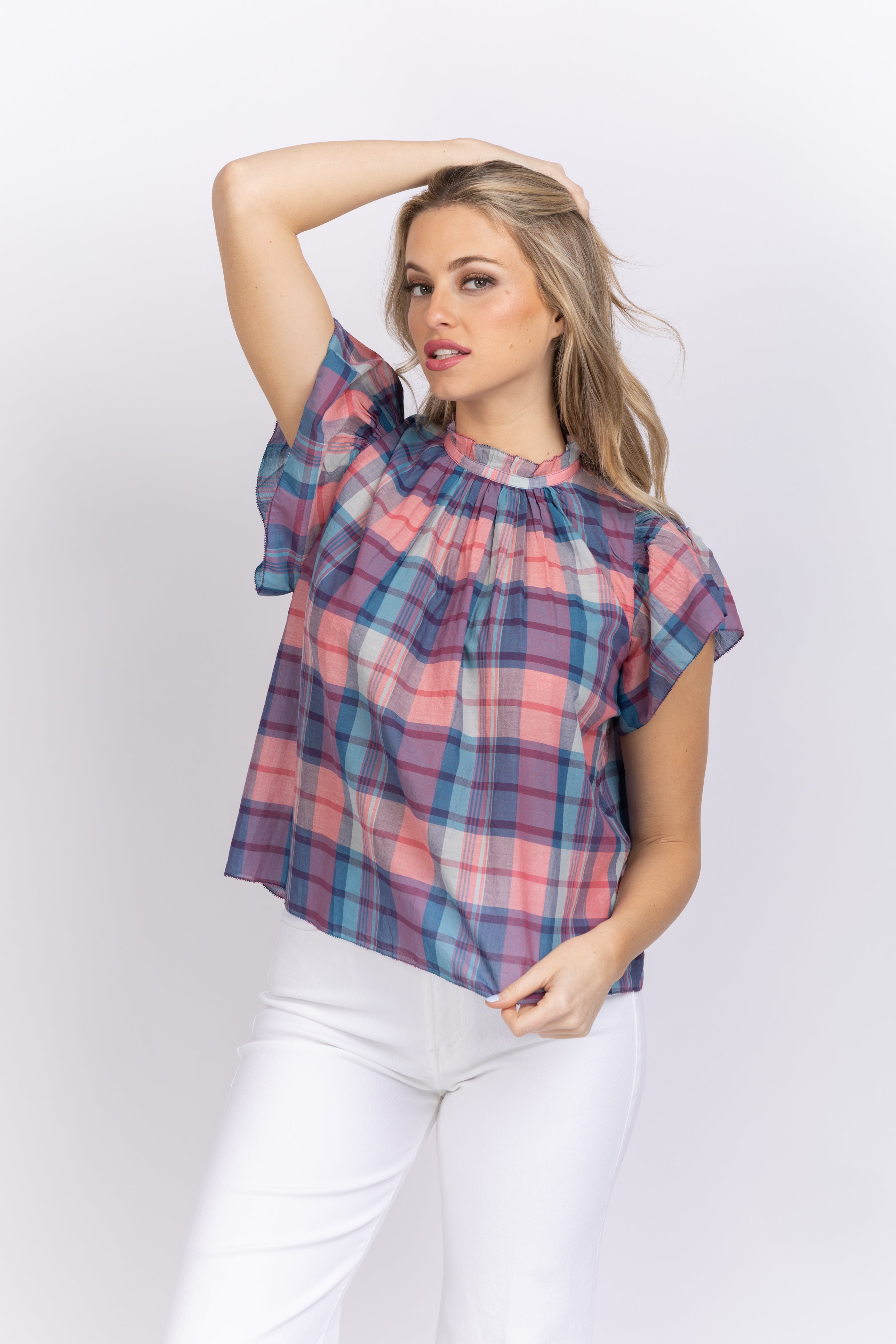 The Carla Highneck Blouse is our favorite go-to femme shirt. We love the high neck ruffled collar and wide ruffle sleeves with quaint trim detail along the hem lines. Finished with a single back-neck button.
