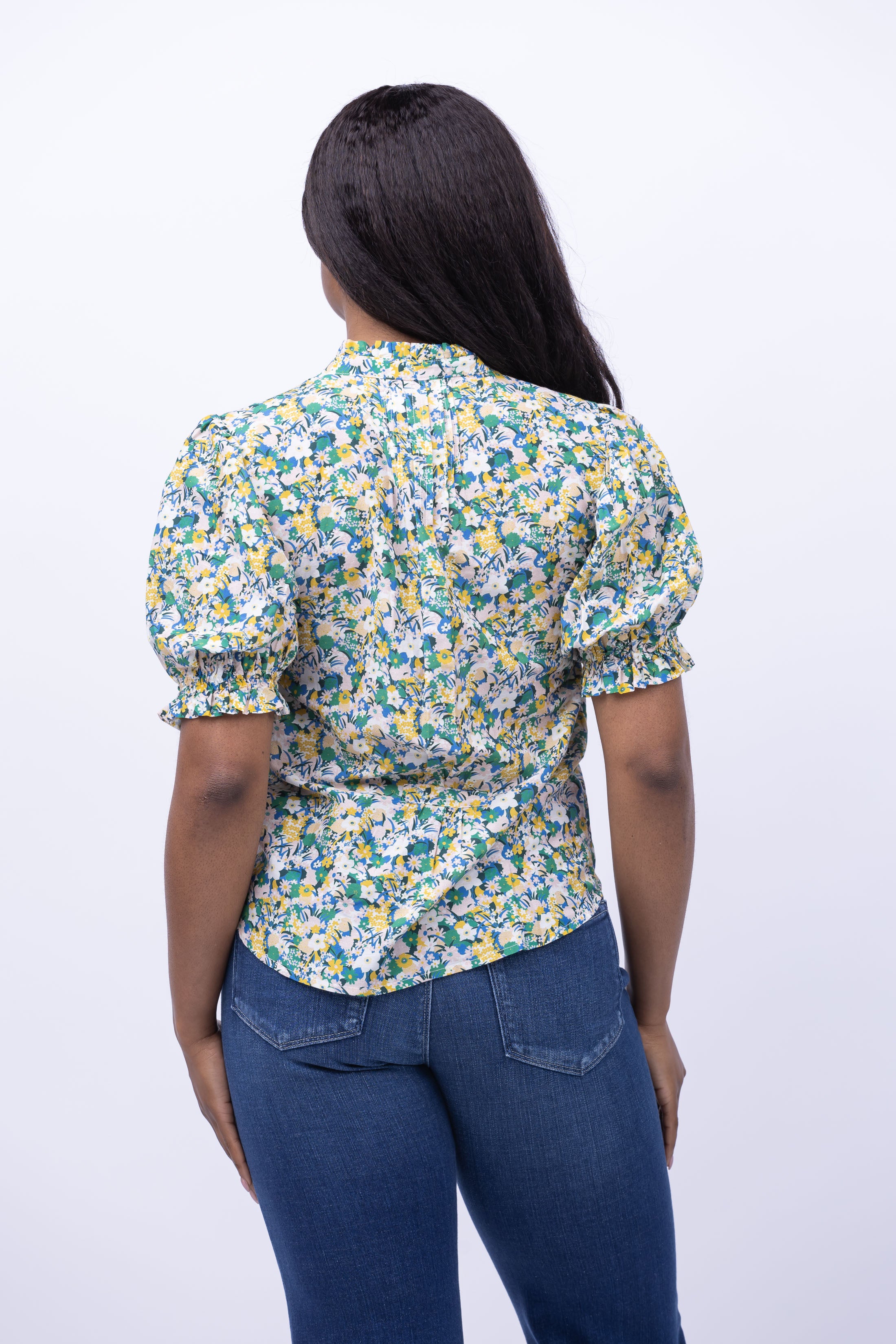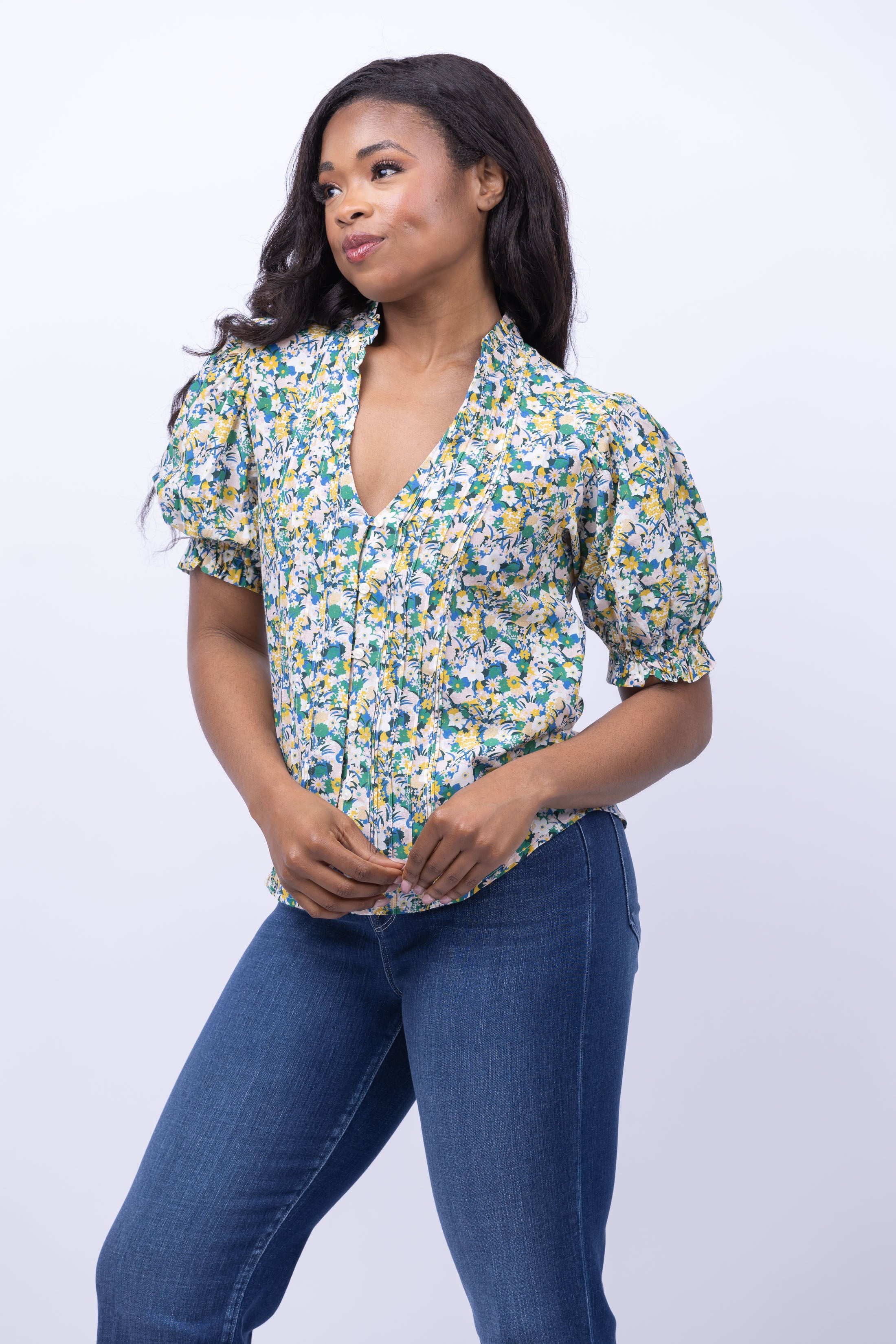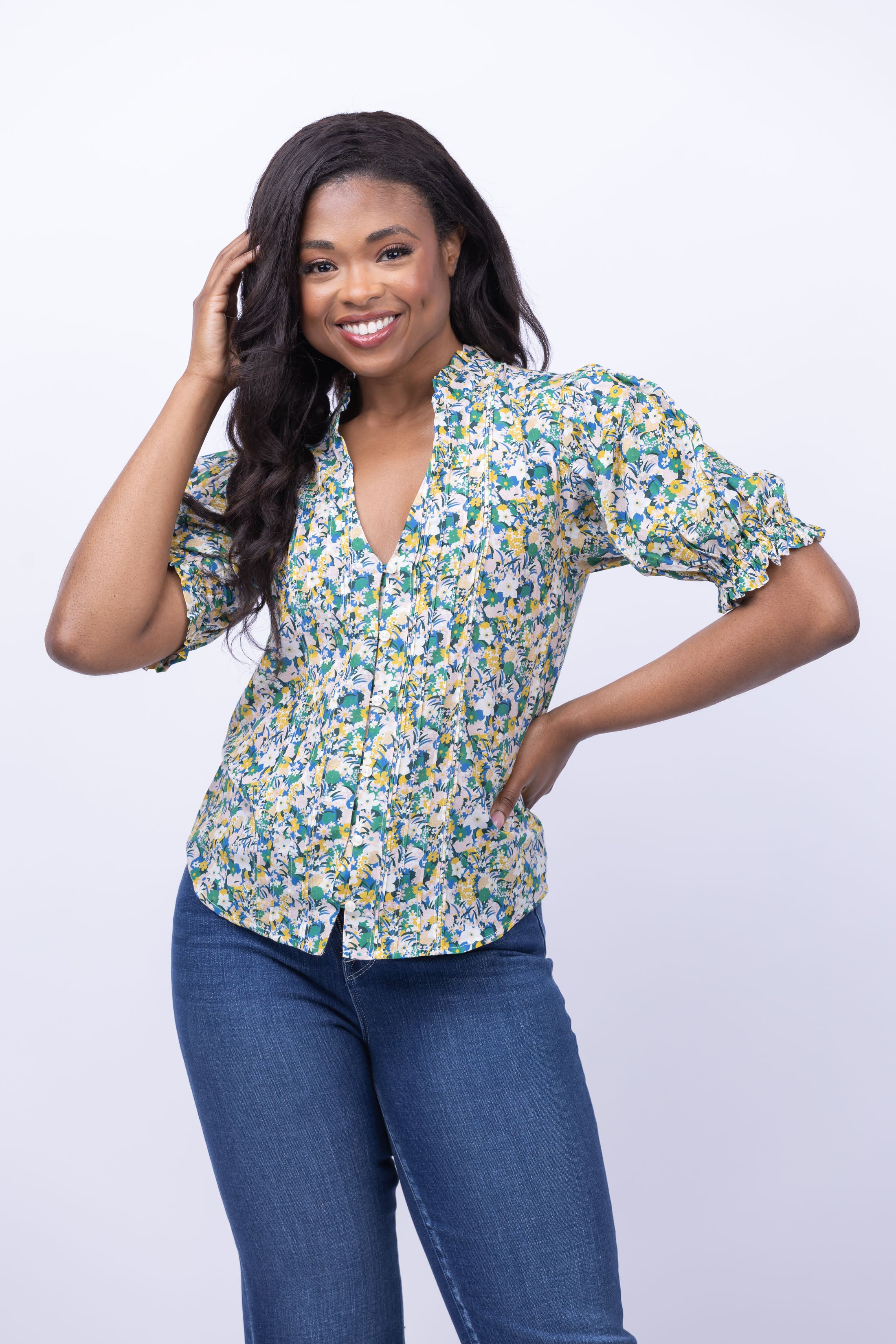 Experience the perfect blend of style and comfort with the Trovata Eliza Blouse in Calma Bloom. Featuring a stand-up ruffle collar, pintuck detailing, and elbow-length sleeves, this blouse is versatile for all seasons. Made from cotton silk and finished with charming pearl white buttons, it's perfect for both tucked and untucked looks.
