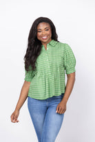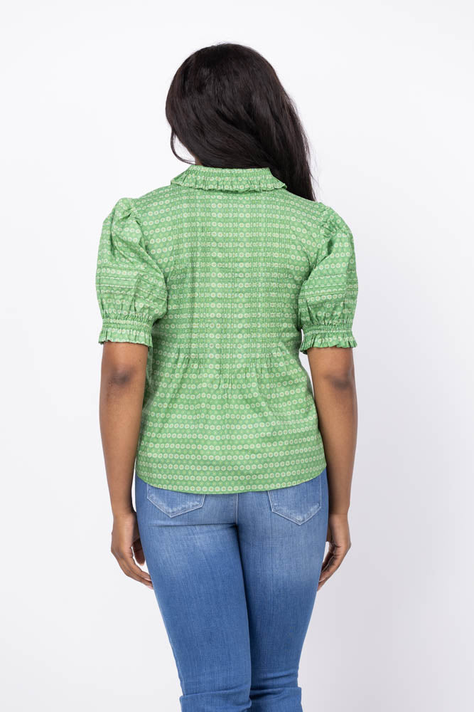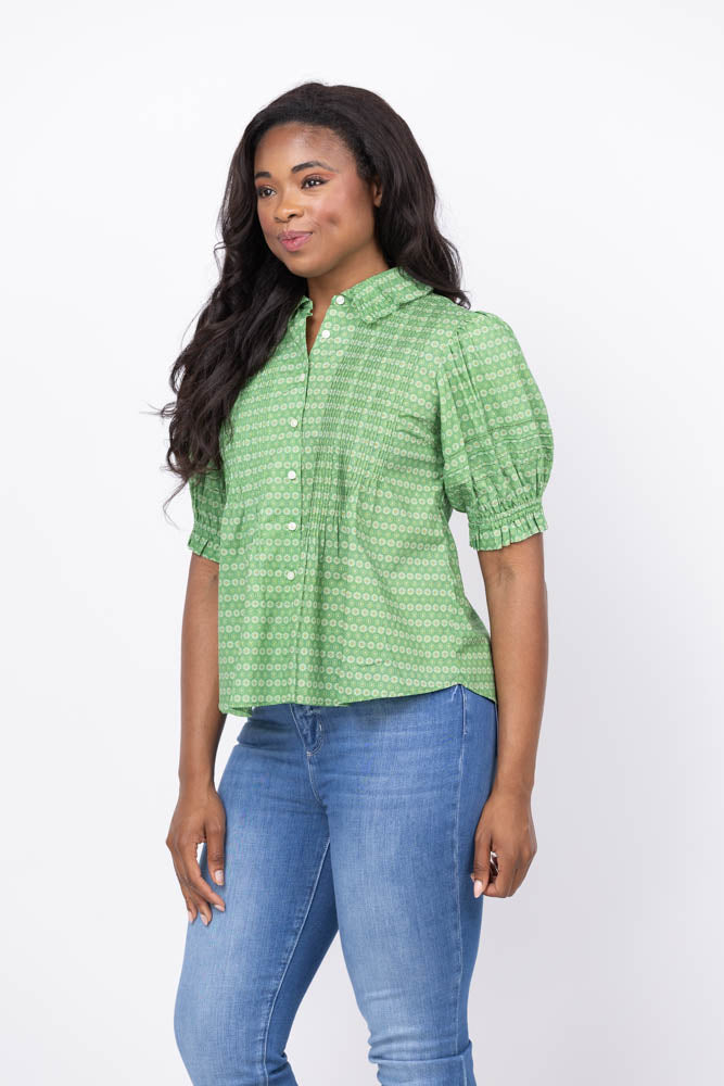 Discover the irresistible charm of the Trovata Jess Blouse in Green Medallion. This innovative short sleeve top features a gracefully curved hemline that flatters every figure, while delicate pintucks add texture and artisanal appeal. The slightly cropped length creates an effortlessly chic silhouette that pairs perfectly with high-waisted bottoms. Crafted from luxuriously soft cotton poplin in a captivating Green Medallion pattern, this versatile blouse invites endless styling possibilities while keeping you comfortably cool. An essential addition that will transform your wardrobe instantly