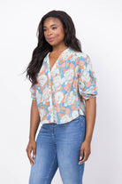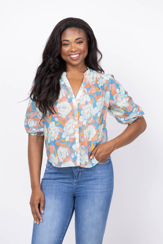 Transform your style with the Trovata Loren Blouse in enchanting Twilight Floral. Crafted from luxuriously soft cotton voile, this blouse showcases charming short-puff sleeves and a flattering v-neck that frames your neckline perfectly. The buttoned front placket adds classic appeal, while delicate gathers at both front and back shoulders create a feminine silhouette that commands attention. An irresistible addition that will become the cornerstone of your signature look.