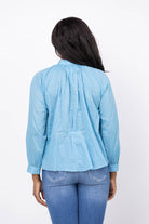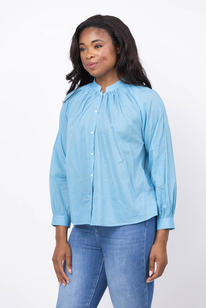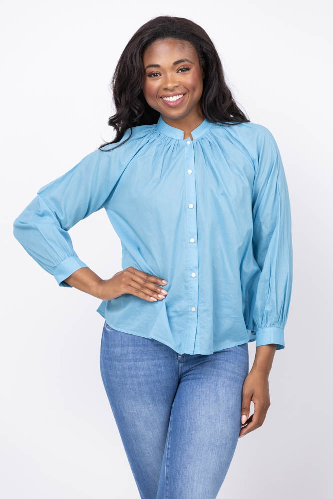 Discover the perfect blend of elegance and comfort with the Trovata Mena Blouse in Larkspur. This stunning new addition features a sophisticated buttoned center placket and dramatic voluminous sleeves that create a statement silhouette. The thoughtfully designed notched collar and raglan armholes offer both distinctive style and exceptional comfort that moves with you. Crafted from our luxuriously soft cotton voile in a captivating Larkspur hue, this versatile blouse transitions effortlessly from casual to refined settings. Whether tucked into high-waisted bottoms or worn loose over your favorite jeans, the Mena Blouse delivers impeccable style that will elevate your everyday wardrobe.