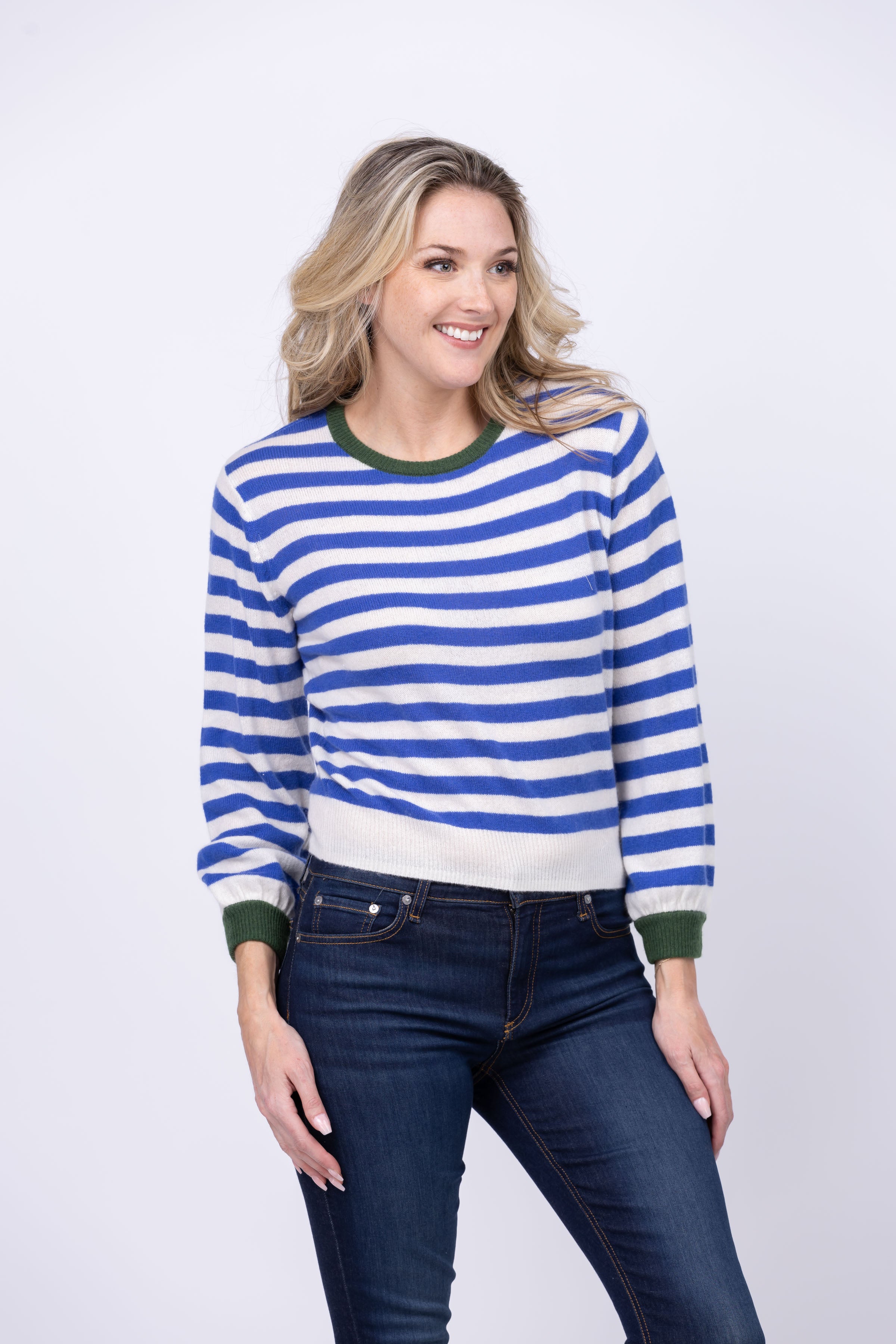 Get cozy all year round with the Trovata Ryann sweater. Made from soft, lightweight cashmere, this crew neck is perfect for any season. Available in Blue Stripe for a pop of color. Stay comfy in style.