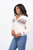 Elevate your wardrobe with the Trovata Savannah Cardigan in White Fair Isle. Crafted from soft merino wool, its textured basket weave in antique white pairs beautifully with cream sailor collar and cuffs for a timeless look. Finished with distinctive gold owl buttons, this cardigan combines cozy warmth with refined details, perfect for sophisticated layering any season.