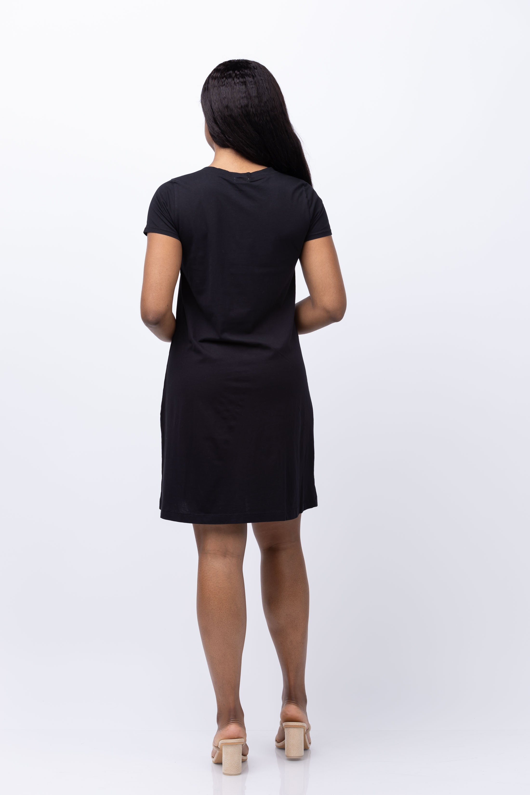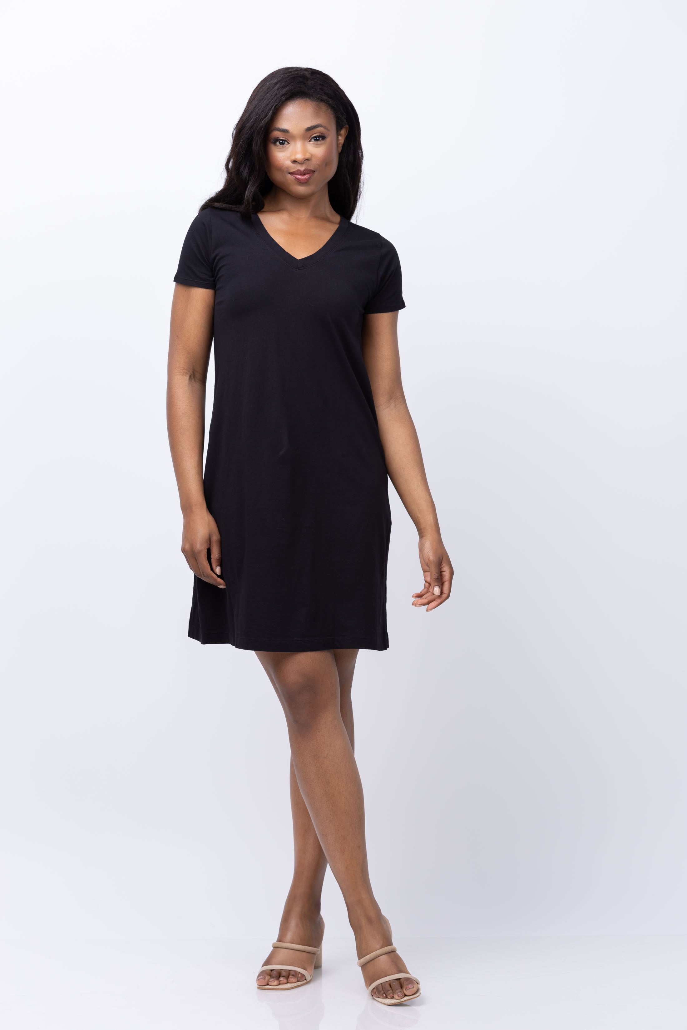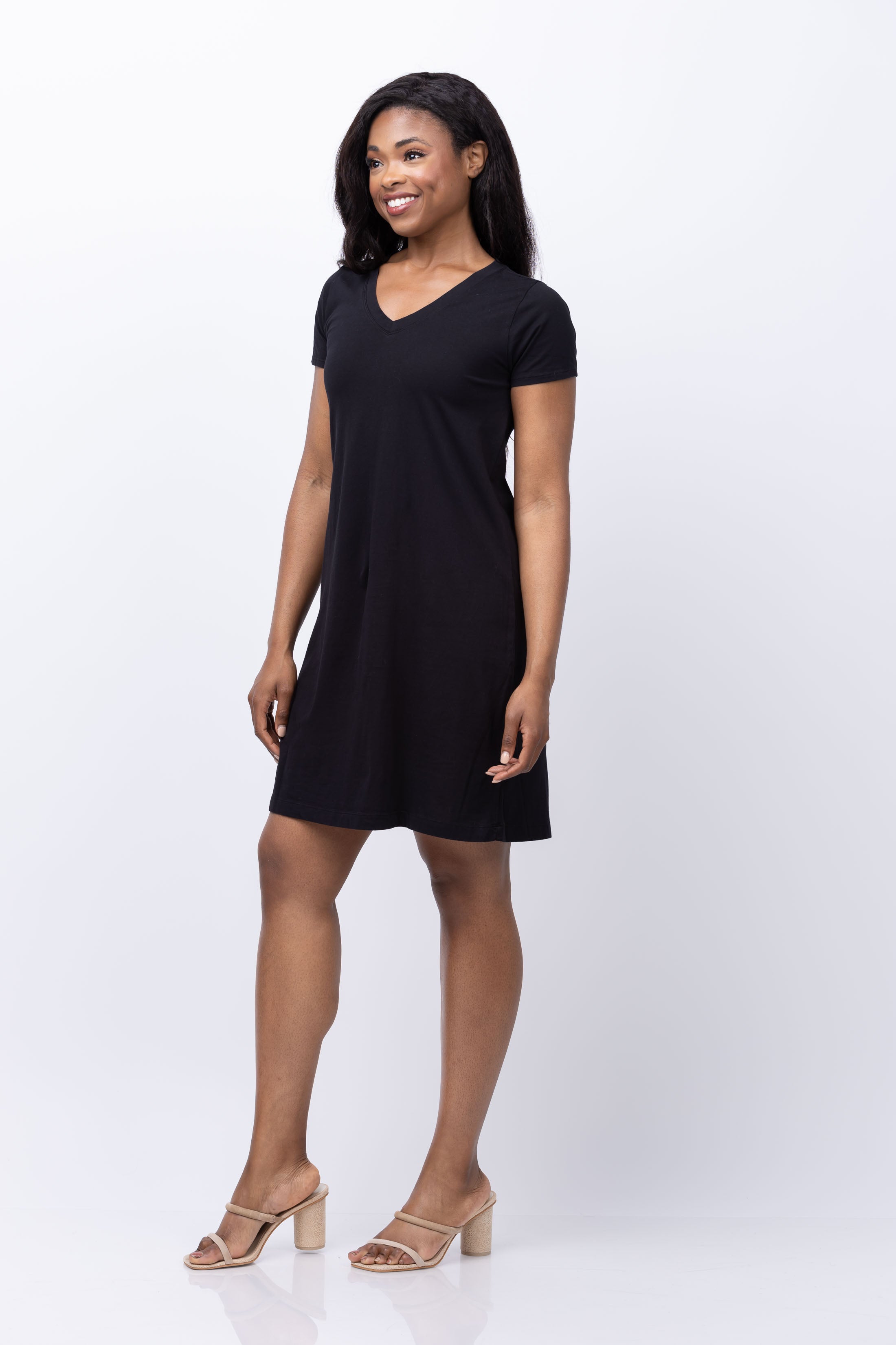 Introducing the True Grit & Dylan Paige Dress in Black! Crafted from soft cotton, this v-neck dress is perfect for your everyday summer look. Its easy pairing with sneakers will keep you stylish and comfortable. Embrace style and comfort with this must-have dress!