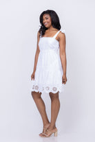 Elevate your wardrobe with the eye-catching Tyler Boe NY Eyelet Skimmer Dress in White. Featuring a scalloped eyelet hem, self-tie straps, and a flattering babydoll silhouette, this dress is perfect for a day at the beach or a lunch date. Embrace timeless style and effortless elegance with this must-have piece.