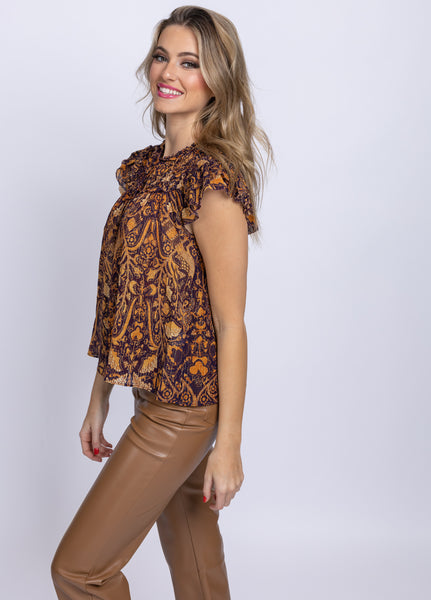 The Signe Top is a classic Ulla Johnson silhouette, designed with delicate flutter sleeves and a ruffled collar framing the airy bodice. Made from lurex-flecked crinkled chiffon and adorned with a mesmerizing print of birds and botanical motifs, this blouse features deep shades of forest green and teal.