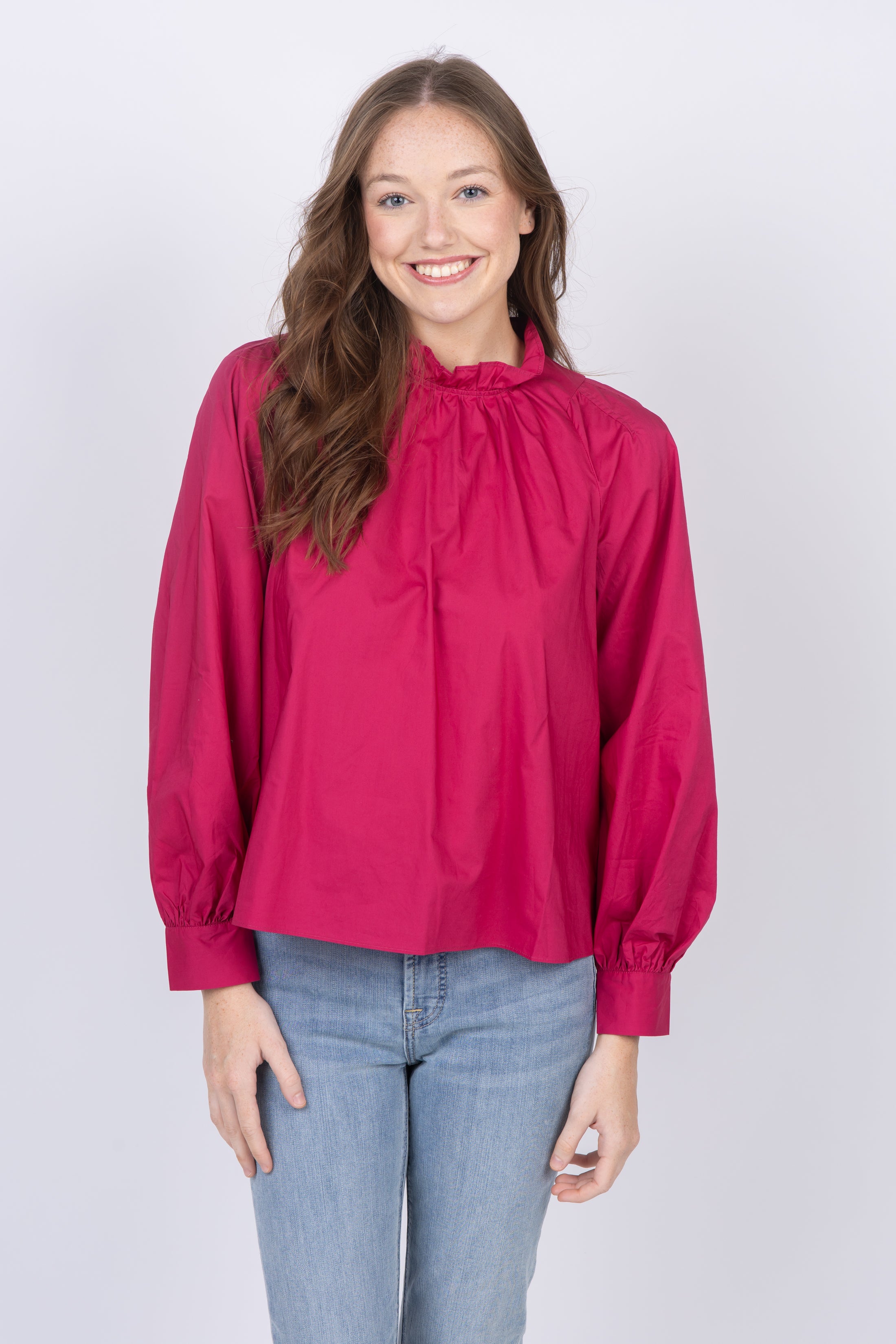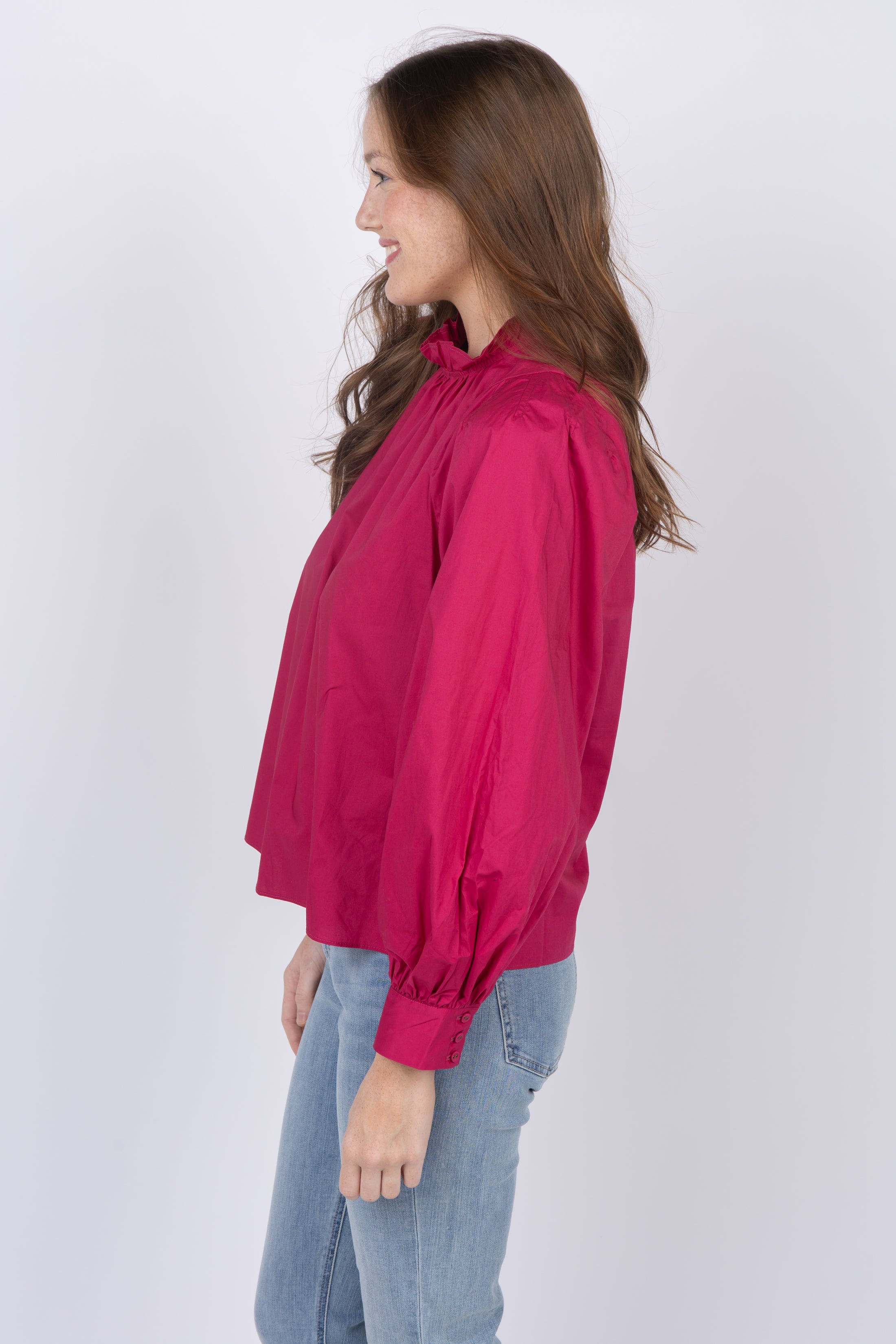 The Ulla Johnson Marlie Blouse in Rosebud is a stand-out statement piece. Crafted from luxurious cotton poplin for a comfortable wear, this blouse boasts full long sleeves, buttoned cuffs, and delicate ruffles at the high neck. Elevate any outfit with this beautiful shade of rosebud pink – an irresistible way to add a touch of glamour!